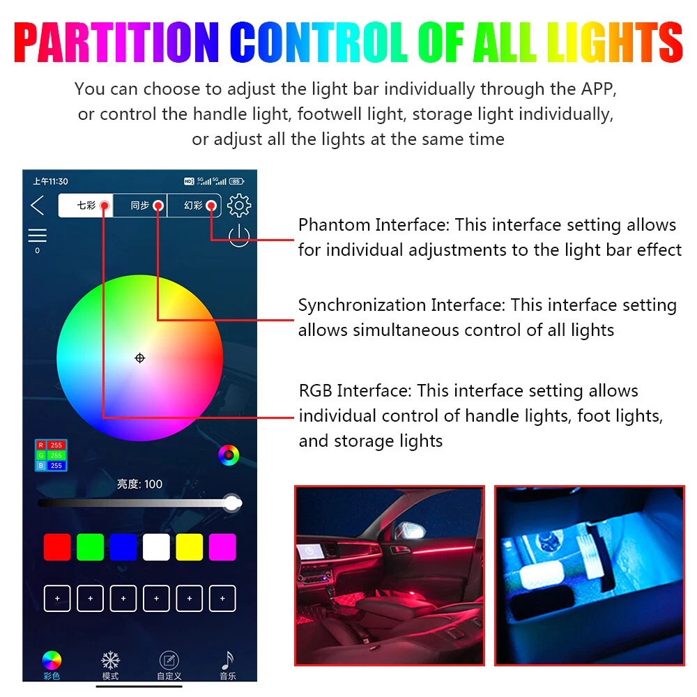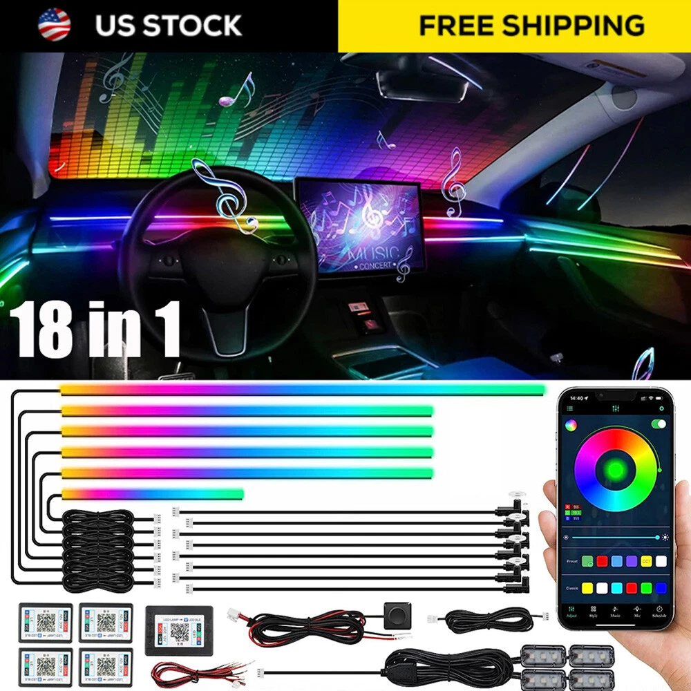 Product Description Note:18 in1 Kit doesn't have Speaker Ring Light ! RGB color : Each change is a color change ! Dreamcolor: multiple color variations, alternating with each other ! This is the latest version of the market Dual zone mode : In the single-zone mode, the dual-zone function is added, and the light bar and footlight/door light/storage light provide two different colors at the same time !!! Features: Voltage: 5v- 12v (All car maker) -Breathe Mode -Gradient Mode -Cycle Mode -Strobe Mode -Music rhythm Mode -Flow Mode -Running water Mode -Mobile phone APP control (LED Lamp) -APP languages: English, Catalan, Croatian, Czech, Danish, Dutch, Finnish, French, German, Greek, Hungarian, Italian, Japanese, Korean, Malay, Norwegian Bokmål, Polish, Portuguese, Romanian, Russian, Simplified Chinese, Slovak, Slovenian, Spanish, Swedish, Thai, Traditional Chinese, Turkish, Ukrainian, Vietnamese Free switch between two modes: (1)Button mode (2)Bluetooth connection to mobile phone APP control The Light mode 1) Active sound effects: The LED under the car's brightness system is equipped with sound sensors that allow the LED lights synchronized with musical rhythm. The LED light music strip follows the rhythm and adjusts the flicker to adapt to the strength of the sound. 2) musical decoration. The Kit designed to be simple, however, also provides elegance inside the car when driving at night or enjoying music. And because it has sound sensor, the car low brightness system is synchronized with the rhythm of the music. 3) Brightness Color temperature adjustment: The LED is equipped with the brightness color temperature adjustment mode. When you feel that the light is dark, you can use this mode to change the brightness. 18 in 1 Package include: 5Pcs Controller Module 1Pcs 110cm LED Strip 4Pcs 75cm LED Strip 1Pcs 35cm LED Strip 4Pcs Footlights 4Pcs Storage lights 4Pcs Handle lights 1Pcs Switches 1Pcs Extension Cords 5Pcs Power Cords About Us Payment Shipping Returns Contact Us About Taxes Contact Us - Our Support Team is Here For You! Our goal is to earn 5 star positive feedback on every sale! 1 or 2 Star DSR Ratings Destroy Our Company. We would appreciate the chance to correct any problems before posting anything other than positive feedback. We encourage our customers to contact in order to resolve any issues regarding the transaction before leave negative feedback on eBay. Please make sure to contact us before you leave feedback. Our working hours Beijing time from 9:00 a.m. to 18:00 p.m . Monday to Friday Payment We accept PayPal only. eBay item number, your full name and shipping address MUST be included in the PayPal payment. Shipping USA --Our warehouse in the east United States East United States ----------------------- 1-3days Western of the United States ----------------------- 3-5days southern United States ----------------------- 2-days Australia -----------------------7-12 working days By AUpost-eparcel from China. UK/ Canada ------------------ 14-28 working days Europe ------------------------------- 21-28 working days Brazil/ South America ------ 30-40 working days We offers 30-day refund, and 1 year manufactured warranty on all products, Warranty period starts from the date of purchase. After 30 days from the date of purchase, all return can only be replaced by same item, unless this item is out of stock at that moment. buyer need pay the shipping fee. * Warranty will be voided if the product is mishandled or physical damaged by customer. We will refuse back all the returns which are out of warranty. * We are not responsible for any kind of compatible issues, or problems related to any specific software or games. Return Policy Returns are permitted and must be initiated by the buyer within 30 days from the date of purchase. Please leave us positive feedback upon satisfactory receipt of the item. We have a program that automatically replies as soon as you leave your feedback. We care about our valued customers, and will always try to help you. So if you have any problems, please e-mail us immediately. Please give us the opportunity to resolve a problem. We understand the concerns and frustrations you might have, and will try our best to resolve the issues. Please email us before leaving negative feedback. All communications are handled through Email. We strive to answer all emails as quickly as possible, but due to high email volume it may take time for us to reply. Thanks in advance for your patience. Due to some ISP SPAM filter settings, you may not be able to receive our email replies; if you have problems receiving our emails, you may need to use a different email account to contact us. For all orders, please note that: Taxes and charges are not included in the item price or shipping charges. Please check with your country's customs office to determine what these additional costs will be prior to bidding/buying. About Us Contact Us - Our Support Team is Here For You! Our goal is to earn 5 star positive feedback on every sale! 1 or 2 Star DSR Ratings Destroy Our Company. We would appreciate the chance to correct any problems before posting anything other than positive feedback. We encourage our customers to contact in order to resolve any issues regarding the transaction before leave negative feedback on eBay. Please make sure to contact us before you leave feedback. Our working hours Beijing time from 9:00 a.m. to 18:00 p.m . Monday to Friday Payment Payment We accept PayPal only. eBay item number, your full name and shipping address MUST be included in the PayPal payment. Shipping Shipping USA --Our warehouse in the east United States East United States ----------------------- 1-3days Western of the United States ----------------------- 3-5days southern United States ----------------------- 2-days Australia -----------------------7-12 working days By AUpost-eparcel from China. UK/ Canada ------------------ 14-28 working days Europe ------------------------------- 21-28 working