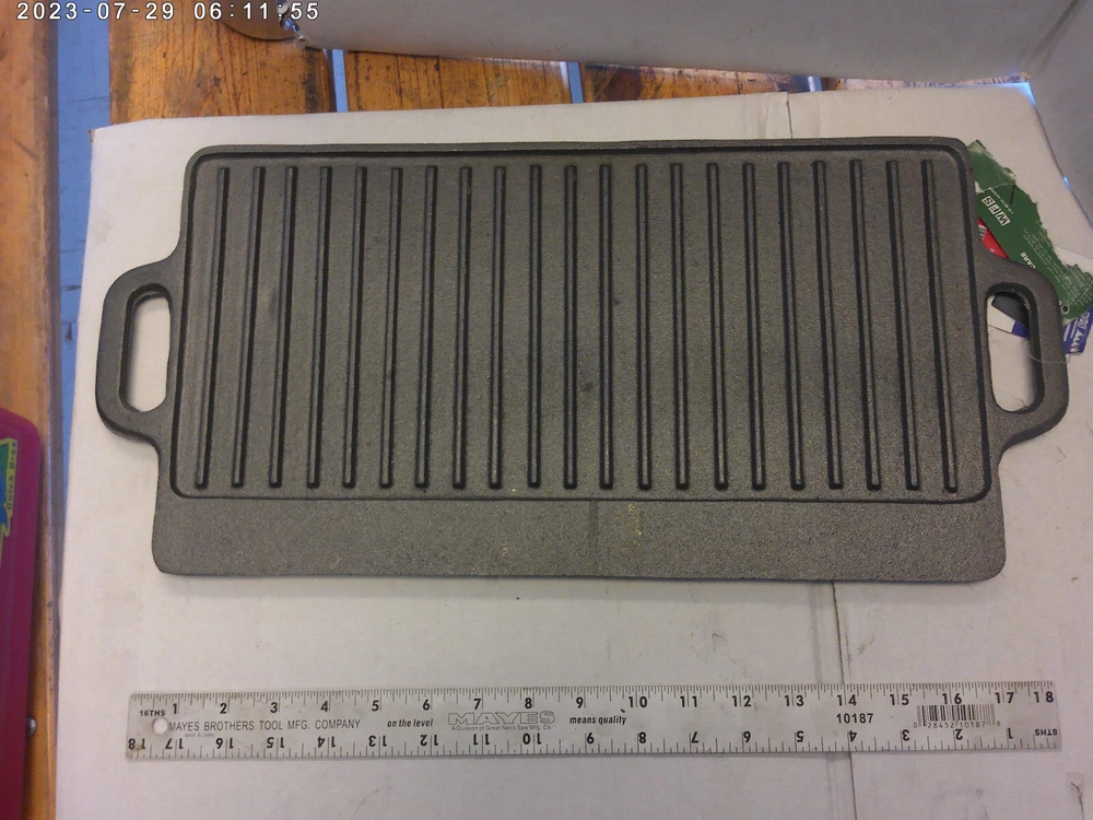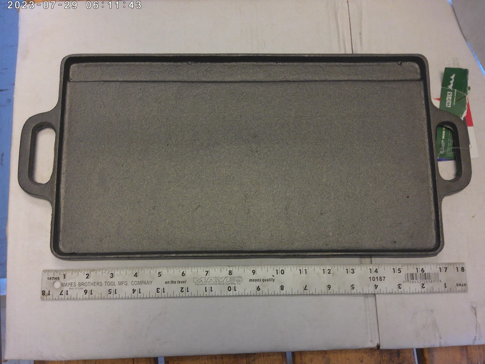 Introducing the World Famous Sports 18" x 9" Cast Iron Rectangular Double Sided Griddle, a versatile addition to any kitchen. This skillet/griddle is perfect for cooking on gas, electric, propane, charcoal, or camp fires, making it a great choice for outdoor cooking enthusiasts. The black cast iron material ensures even heat distribution for perfect cooking every time. With its unique design and high-quality construction, this griddle is a must-have for any collector of cookware. Whether you're looking to add to your collection or just upgrade your kitchen, the World Famous Sports 18" x 9" Cast Iron Rectangular Double Sided Griddle is the perfect choice. Cooking surface is 16" x 9" Will need to be seasoned before use. Thank you have a great day!