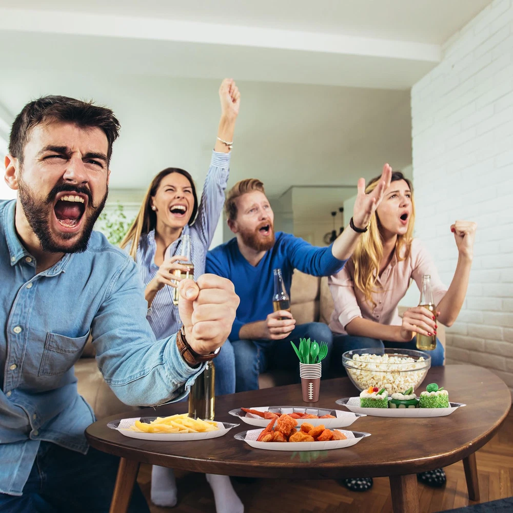 Features: Practical gifts: These football paper plates and napkins set also make a thoughtful gift for your partner who is a football lover or who has kids that play football. They will appreciate your thoughtful present on their game day or football themed party. Functional and decorative: Our football party favors not only serve a functional purpose, but also add a decorative touch to your table. With their football shaped design and vibrant colors, they can create a festive atmosphere, leaving a deep impression on the guests. Specifications: Material: paper and plastic Color: as the picture shown Size: Plate: approx. 11.02 x 6.3 x 0.98 inches/ 28 x 16 x 2.5 cm Package includes: 30 x Football paper plates 30 x Football paper cups 30 x Football napkins 30 x Plastic knives 30 x Plastic forks 30 x Plastic spoons Notes: Manual measurement, please allow slight errors on size. The color may exist a slight difference due to different screen displays. Pointed items are included, adult supervision is needed when it is played by your little ones. Football Party Supplies Kit: our set includes 180 supplies needed for your football themed event, including 30 football paper plates (11.02 x 6.3 x 0.98 inches), 30 football paper cups, 30 football napkins, as well as 30 plastic knives, forks, and spoons; The set can serve 30 guests, ideal for large gatherings celebrating football games or themed parties Reliable and Sturdy: our football plates are made of thicken paper material, safe and reliable, not easy to break or leak; Paper napkins are soft and water absorbent, paper cups are sturdy and reliable; And the disposable forks, knives, spoons are made of reliable plastic, smooth and waterproof, providing a nice heat resistance and flexibility; All you can use with confidence Football Themed Design: the football themed party supplies can easily attract the attention of your guests, the football shaped plates are realistic and fun, and cups and napkins are printed with green and brown football patterns, adding a lively and delighting touch to your football themed parties More Time to Enjoy: using our football plates and napkins party supplies means less time doing dishes and more time enjoying the party; Once the party is over, simply dispose of these supplies, allowing you to have more fun and create memorable moments Wide Range of Applications: the football plates and napkins set is ideal for a wide variety of occasions such as tailgating, viewing parties, football themed events, sports themed parties, birthdays, anniversaries, bachelorette parties, casual gatherings, matching well with other decorations and leaving your guests a deep impression