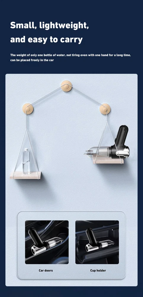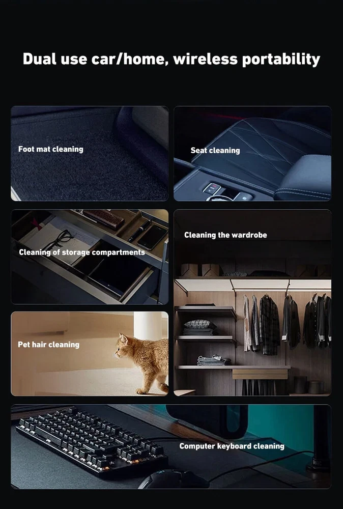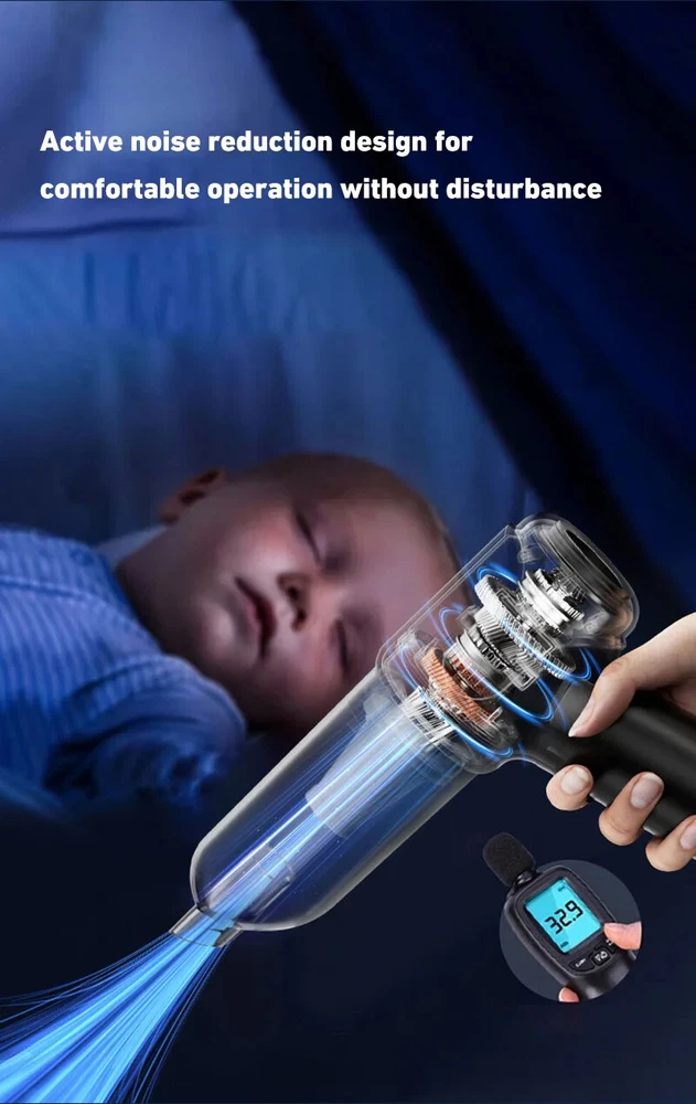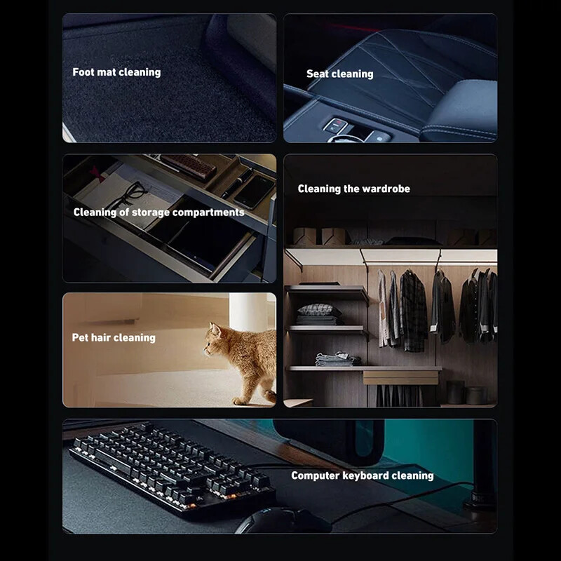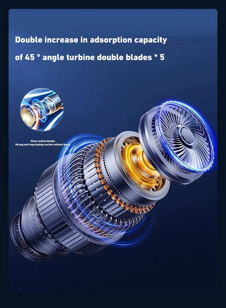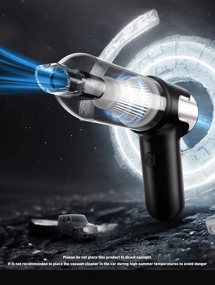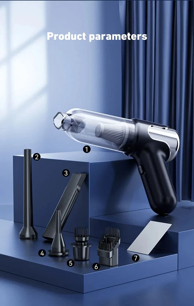180000PA 5 in1 Car Vacuum Cleaner Wireless Handheld Strong Suction Cleaning Machine Portable Vacuum Cleaner for Car Home Specification: Rated speed: 45000(r/min) Rated input power: 120 (W) Rated voltage: ≤36V (V) Vacuum suction: 10000 (PA) Battery capacity: 2000mah Noise ratio: ≤70dB Charging time: 2-3hours About this product: 1.【Rechargeable Battery & Fast Charging】This electric vacuum cleaner has a built-in 2000mAh battery with a fast charging port. It can be easily charged using car chargers, power banks, laptop rechargeable batteries and other charging methods. Charging takes only 3 hours. This reusable vacuum cleaner is the perfect replacement for a compressed air tank, environmentally friendly and energy-saving. It also saves money and time. 2.【Powerful Air Duster and Vacuum Cleaner 4-in-1】Our vacuum cleaner has two functions: it can suck, pump, blow and charge. Easily blow away particles such as dirt, crumbs, and dust from surfaces, as well as remove small, stubborn dirt hidden in keyboards, nooks and crannies. 3.【Easy Maintenance】With just one click of removal, you can easily dump the garbage and clean the vacuum cleaner. Hepa filters can be washed and reused, ensuring efficient suction while keeping dust and dirt out and preventing clogging. 4.【Wide range of uses】The cordless vacuum cleaner comes with many different detachable brush head nozzle accessories for cleaning various scenarios. For example, it can thoroughly clean computer keyboards, cameras, air conditioners, sofas, windows, pets, plants, etc. Packing List: Vacuum cleaner *1 USB charging cable *1 brush *1 long-nosed straw *1 Vacuum nozzle*1 filter element *1