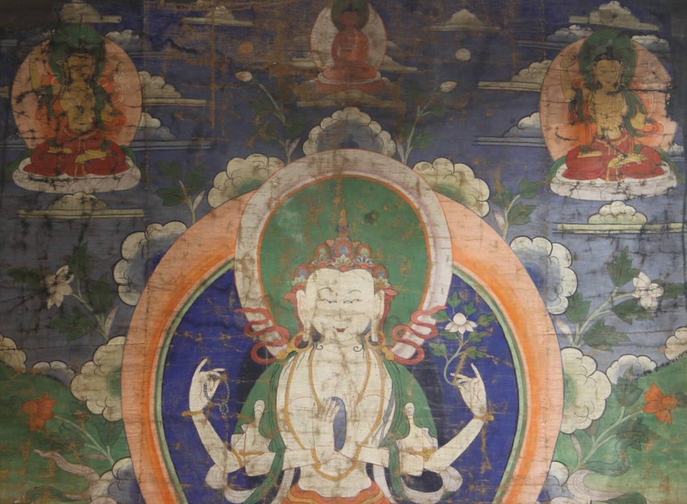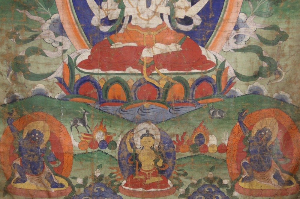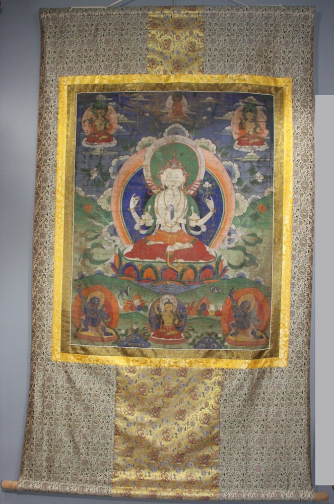 - W onderful Large Tibet 19th Century Old Antique Buddhist Thangka "Four-armed Avalokitesvara Bodhisattva" - S ize : 88 x 156 cm, 62 x 80.5 cm the painting ( 1 inch = 2.54 cm ) Material : Ground Mineral Pigment on Cotton Age : 19th Century Style : Tibet Note : There were repaired on the right and left of the top thangka If you need more pictures or video information, please feel free to let me know - Thank you ! Please feel free to let me know if there are any question! Welcome to Save my ebay shop - then you can receive my ebay Store newsletter for my New items from ebay message! Welcome to view our ebay store when you have time ! And welcome to view my own site tibet-buddhism .com - if you like some of them, I will list them to my ebay store for your purchase. Yours satisfaction is my best success! Tashi Delek