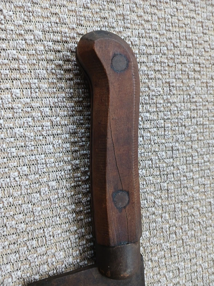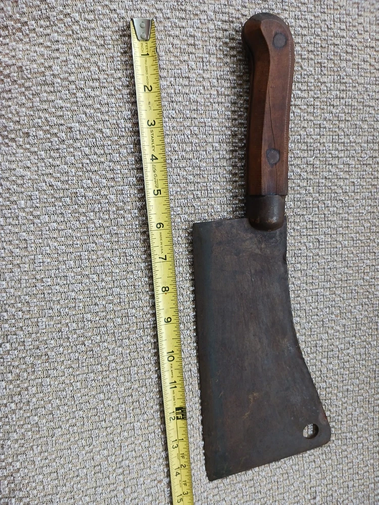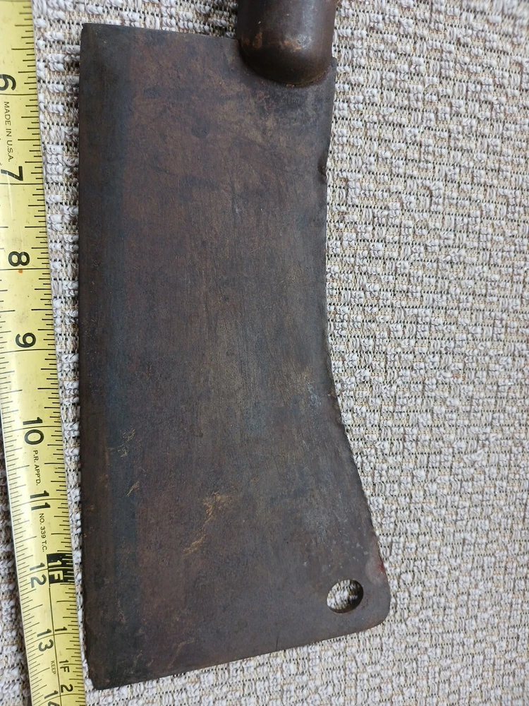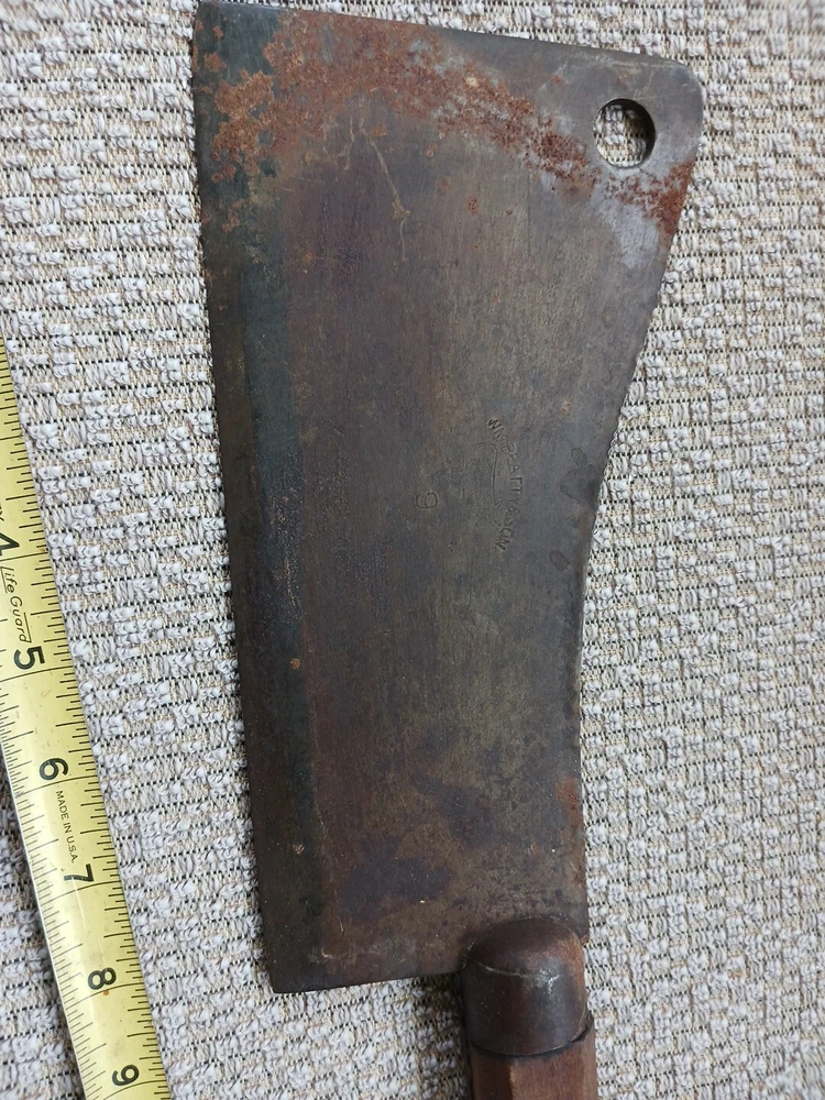 This listing is for a Wm Beatty & Sons No. 9 meat cleaver. No. 9 signifying that the blade is 9" long. Blade has some surface rust. Wood handle is in good shape. This piece has a neat look to it and would make an excellent haunted house prop.