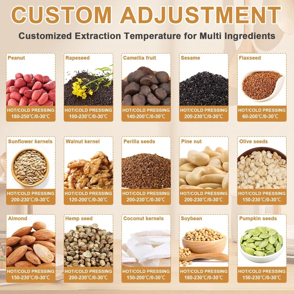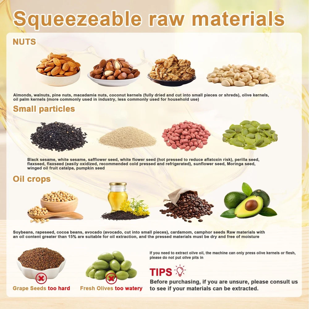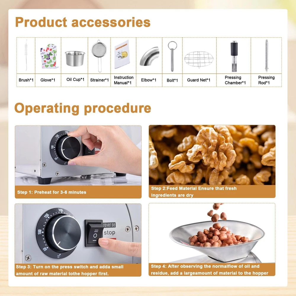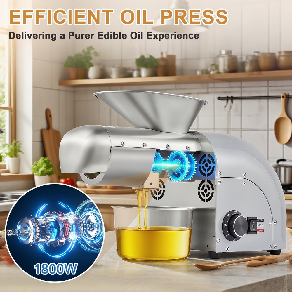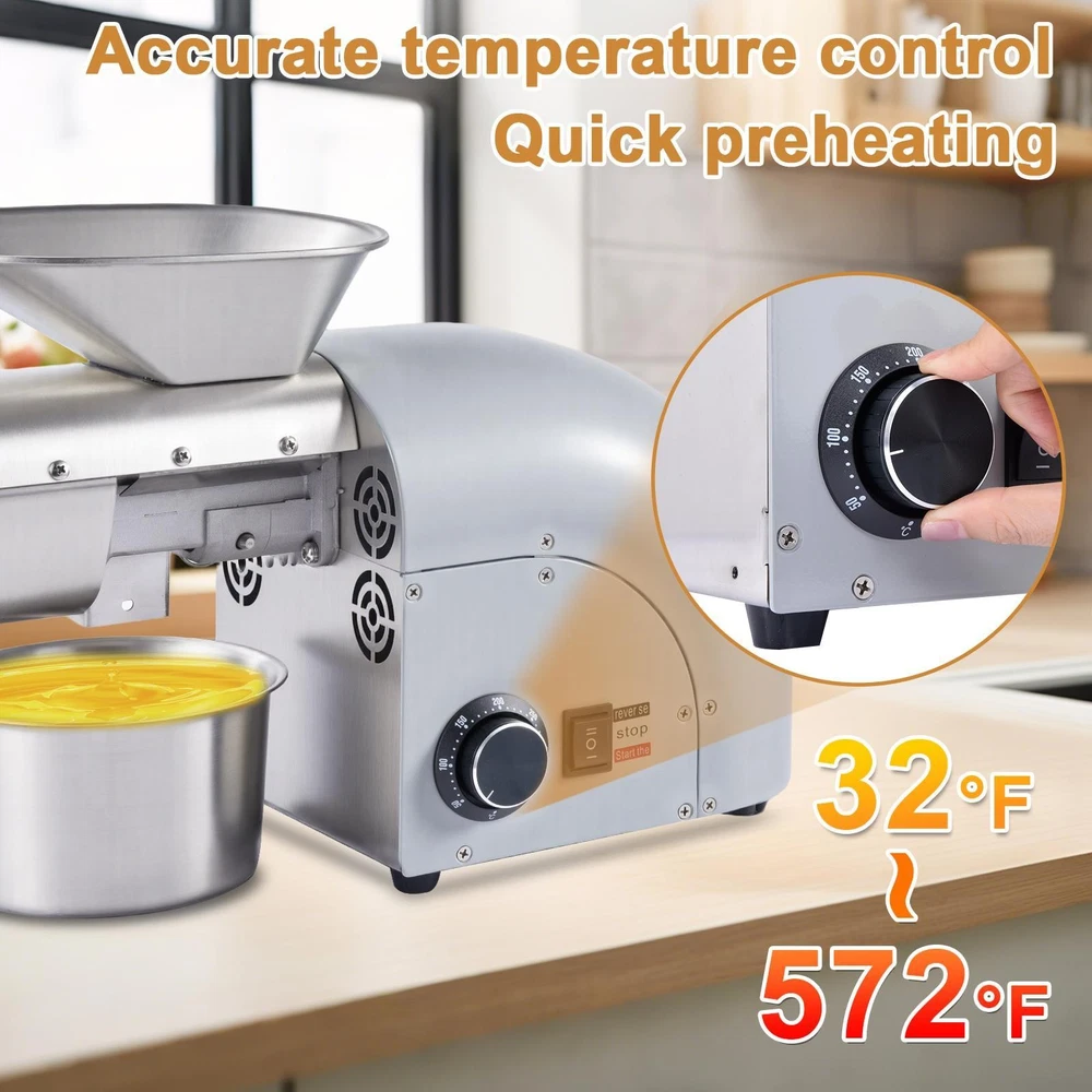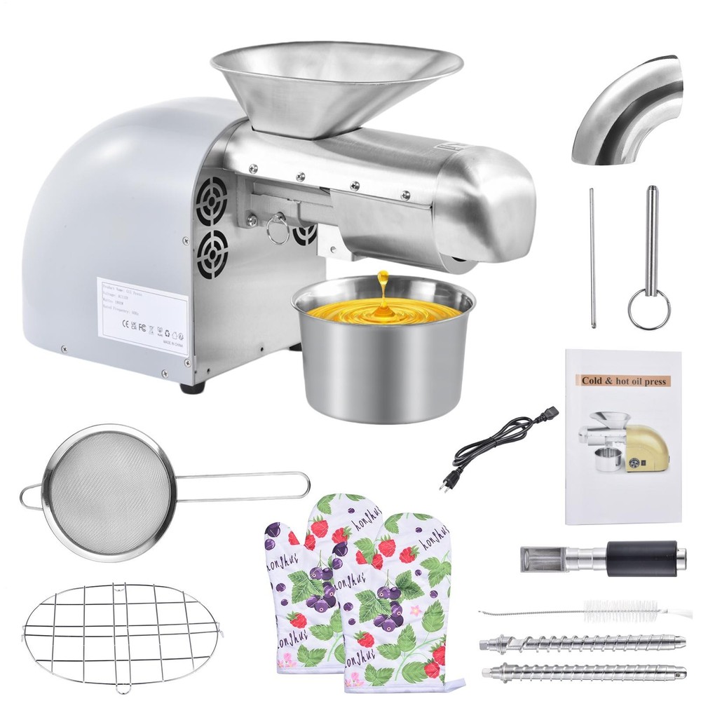Store category Sign Up Now ! You may also like Product Description Bullet Points: Powerful Efficiency with Minimal Noise: The advanced 1800W pure copper motor features strong performance, processing 13 to 19 pounds of material hourly. Designed for quiet operating at just 60 dB, it fits seamlessly into residential or professional settings. Backed by a 5000-hour motor life, it assures durability and dependable performance over time Accurate Temperature Regulation and Rapid Preheating: Features a broad range from 0–300C (32F–572F), with the heater reaching 50C to 300C (122F to 572F) in just 3–6 minutes—ideal for both cold pressing (below 60C) and hot pressing applications. A red indicator light illuminates during operating Optimized Purity Standards: The oil press features 304 stainless steel cold and hot pressing rods that are fully separated from the motor, preventing oil contamination and guaranteeing pure oil. The tool-free disassembly design and built-in heat dissipation vents allow for easy cleaning and maintenance Diverse Material Support: Ideal for processing okra, soybeans, walnuts, and dozens of other materials across three main categories, effectively extracting oil from substances with oil content higher than 15%, meeting varied user requirements. Sun-drying the raw material naturally—without roasting—is important before pressing to obtain the highest possible oil output All Must-Have Tools Provided: Supplied with cold and hot pressing rods, protective glove, disassembly rod, oil container featuring nozzle and handle, filter mesh, cleaning brush, and video tutorials, ensuring ease of use during every step of oil production Designed for versatility, this oil press machine operates at 13-19LBS/H and suits both home and commercial environments. Featuring robust stainless steel construction, it features cold and hot pressing options with precise temperature control from 32℉ to 572℉. Suitable for restaurants and households, it processes sesame, cocoa beans, avocado, castor, and other beans efficiently. Its adaptable functionality meets the demands of varied users. Specifications: Product name: Oil Press Machine Product material: 304 stainless steel Rating Power: 1250W Maximum power: 1800W Voltage: 110V 60Hz Product net weight: about 12.77kg/28.2lbs Product size: about 51x21x29cm/20.08x8.27x11.42 inches Packing list: 1 x Oil extractor machine 1 x User manual 1 x Power cord 1 x Oil receiving cup 1 x Slag screen 1 x Tube brush 1 x Anti-scalding glove 1 x Press chamber (already installed on the machine) 2 x Press rods (1 already installed on the machine) 1 x Latch (already installed on the machine) 1 x Oil guide square tube (already installed on the machine) 1 x Removal rod 1 x Slag guide elbow 1 x Safety net Notes: 1. Due to different lighting and screen settings, the item color may be slightly different from the picture. 2. Due to different manual measurements, please allow a 1-2cm difference in size. Payment Delivery details Terms of sales About us Feedback & DSRs Payment Before you palce an order, please kindly make sure that you have a paypal account. We accept PAYPAL payment only. Payment should be completed within 2 days after auction closed, or unpaid dispute will be filed for an closing auction. An unpaid case will be filled after 4 days. Delivery details We ship to your eBay address. Each package will be shipped to US by UPS Regular Parcel with tracking number. Please check your shipping address carefully before checkout, it can't be changed if order completed. All items will be shipped within 1-2 business day upon receipt of payment.Orders placed on weekend will be shipped within 3 days. If you do not receive your item in 7-10 business days.please contact us immediately for further assistance. We will be responsible for any damages or losses incurred in the shipping process. About us We maintain high standards of excellence FIVE STAR and strive for 100% customer satisfaction! Positive Feedback is very important to us. We hope that you contact us immediately Before you give us neutral or negative feedback, so that we can satisfactorily address your concerns. We promise to offer the lowest price and high quality produce. Our working time: From Monday to Friday(9:30 am to 18:00pm), we don't working on holidays ,hope you can understand and know that , thank you. Please always talk to us via ebay Message. We appreciate your business and look forward to growing our e-Bay sales with satisfied customers. Feedback Contact us If you have any questions, please feel free to contact with us by ebay Message during our business hours ( 9:30a.m. to 5:30 p.m.), or email us through eBay, we will try our best to help you to resolve it. For any presale or after-sale questions,please do feel free to email us! Due to the time difference, each email will be replied within 1 working day,and weekend will be delayed a bit. Feedback