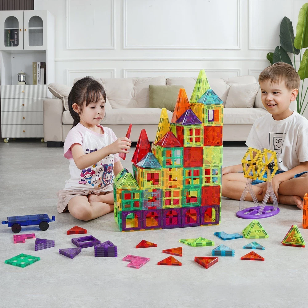 VEVOR Magnetic Tiles – Unleash Your Child's Creativity These magnetic tiles are made from safe and durable materials with stronger magnets, allowing kids to easily create a variety of shapes and structures. Perfect for learning shapes, colors, combinations, and basic building skills, this set provides endless fun and possibilities. Designed for hours of uninterrupted play, our magnet building tiles feature strong magnets that keep everything securely in place. Whether building tall towers or complex structures, kids can play confidently, knowing their creations will stay stable. Made from high-quality ABS material, these magnetic building tiles are safe and durable. With no adhesives, they're health-friendly and innocuous. The smooth surfaces and rounded edges ensure safe play, so kids can have fun without worry. Featuring a premium drawstring Oxford bag, this kids magnetic tiles set makes clean-up and storage a breeze. The one-piece design prevents pieces from falling out, and it's washable, making maintenance easy for busy parents. Kids will adore our magnetic tiles set, which is great for homes, schools, and kindergartens. It encourages logical thinking, problem-solving, and social skills—making it a smart choice for playtime and a wonderful gift.