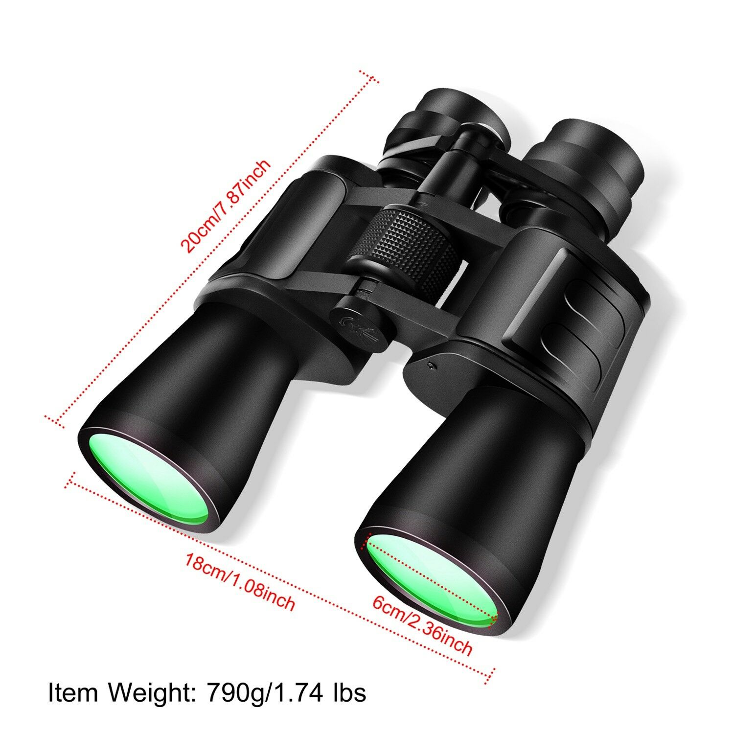 eBay 180x100 Military Zoom Powerful Binoculars Day/Low Night Optics Hunting with Case Featured Item Product Detail Image Gallery Product Description Features: Portable and Powerful Binocular: Features Full 8~ 24 x magnification for bringing object 8~ 24 times closer,50mm-diameter object lens for allowing more light to come through(more clear,even low light condition),22mm-diameter eye lens for larger observation range and comfortable view. Owning compact portable size(Full-size:20 x 18 x 6cm/7.87 x 7.08 x 2.36 inches / Net Heavy Weight:1.74 lbs),with a rugged rubber exterior for comfortable grip and durable use. Clear Image Effect: Adopts multi-layer-coated aspherical lenses elements for light reflection and minimal distortion,better image brightness,contrast and quality. Large Field of View: Our binocular adopts high-grade BAK-4 prisms. With a large field of view(268Ft / 1,000Yds),it is optimal for watching fast-moving things. About Low Light Night Vision: This night vision binoculars can be used for both day and night(Note:low-light-level night vision,which can't see anything in complete darkness). Easy To Operation: Focus by adjusting the right eye cup and center wheel. Widely used for adults or children bird watching,outdoor sightseeing,climbing traveling,sport events,concerts star gazing,etc.(Tips:Built with a tripod interface,the tripod is not included). Specifications: Object Lens Diameter: 50mm Eye Lens Diameter: 22mm Type of Prism: BAK-4 Number of Lens: 4 pieces Lens Coating: FMC Focusing System: Central Non-slip Focusing Focus Lens: Eye Exit Pupil Distance: 8mm Exit Pupil Diameter: 5mm Field of View: Angle: 5.5°, 268ft/1,000Yds (78M/1,000M) Min. Focal Length: 5m/16.4ft Diopter System: Right Eyepiece Resolution: ≤ 7.5" Interpapillary Distance: About 56mm~74mm Color: Black Item Size: 20 x 18 x 6cm/7.87 x 7.08 x 2.36 inches Item Weight: 790g/1.74 lbs Package Size: 20.5 x 18.5 x 8cm/8.07 x 7.28 x 3.15 inches Package Weight: 990g/2.18 lbs Package Contents: 1 x Binocular 1 x Pouch 4 x Lens Caps 1 x Strap 1 x Clean Cloth 1 x Use Manual Terms & Conditions Thank you for your business !
