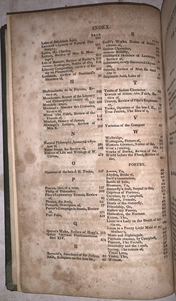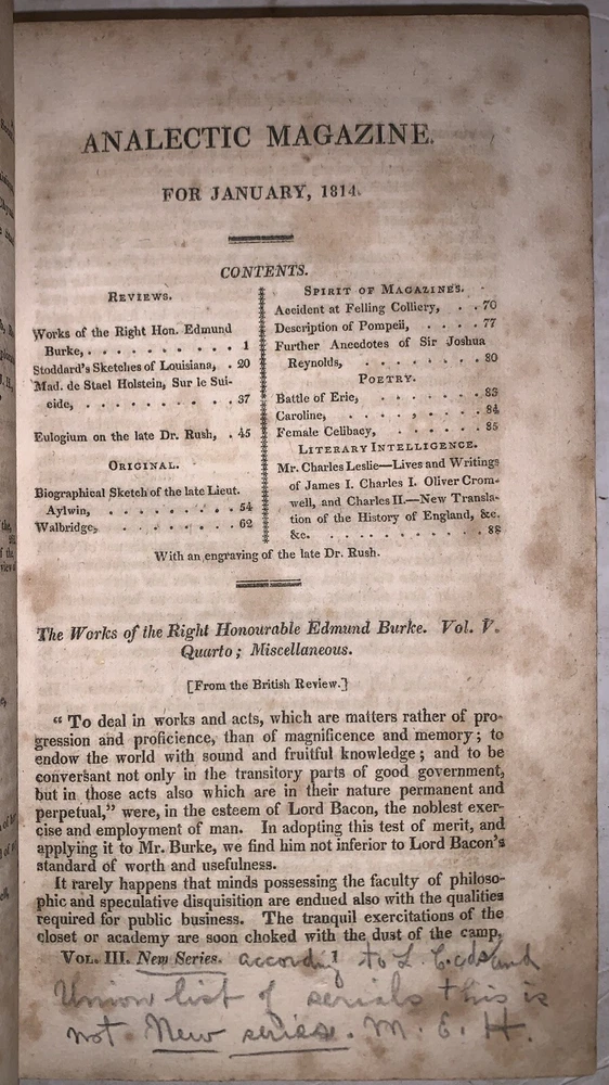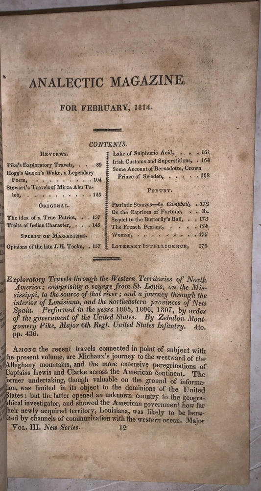 The Analectic Magazine, Containing Selections from Foreign Reviews and Magazines, of Such Articles as are Most Valuable, Curious, or Entertaining Volume III - January-June Philadelphia: Moses Thomas 1814 First Edition Octavo, ii, 528 pages, rebound in gilt lettered grey cloth covered boards. There is a stamp and a few markings indicating that this item originated from an institutional collection. Some rubbing and wear, foxing and discoloration, else in good + condition. If you have any questions, feel free to ask, and don't forget to check out my other listings.