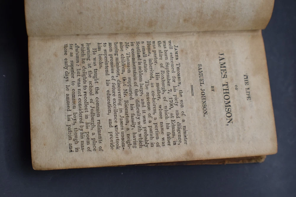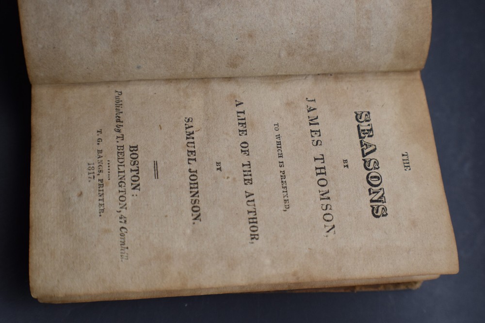 Seasons by James Thomson to Which is Prefixed A Life of the Author by Samuel Johnson Published by T. Bedlington, Boston, 1817 EARLY See photos for condition details. spine/hinge wear, rear board free Due to high loss in shipping to certain countries, insurance is required for shipping to a location that does not provide tracking PLEASE READ THE RETURN POLICY BELOW: RETURNS are seldom made, I have been on for many years and Buyers satisfaction is important to me. This is why I provide good description, detailed photos and request questions from you to help you make the right choice to eliminate returns. Please read the description and view detailed photos. Please ask questions if you have particular needs or need clarification. Communication is important, this helps eliminate returns and any confusion or buyers with particular needs, so please do not assume I know what you are looking for unless you tell me. NOTE: If purchasing multiple items, please do so by using the Ebay Shopping Cart, then select "Request Total for Seller" for the corrected shipping on a new invoice. Do not pay for the items before receiving this corrected invoice.