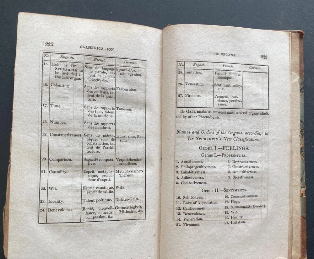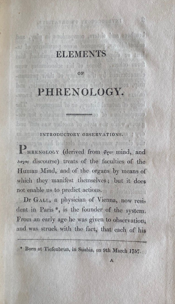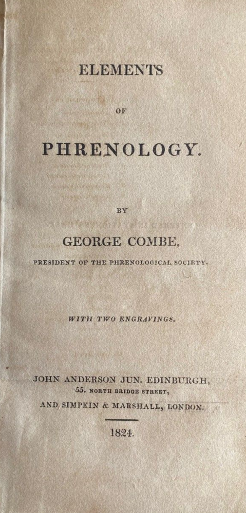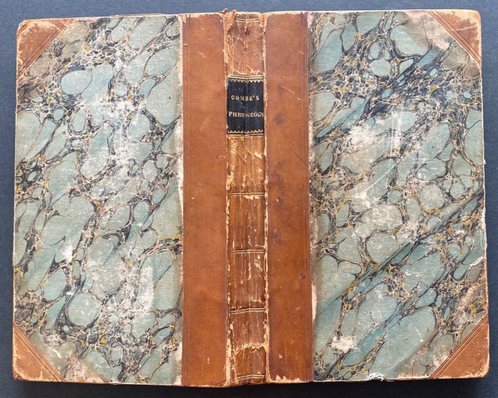 Express Shipping Worldwide is Free Elements of Phrenology By George Combe Published by John Anderson Jun., Edinburgh, 1824 The rare First edition, with both plates present This book is a foundational work in the field of phrenology, a pseudoscience that claimed that the shape and size of the skull could determine a person's character and mental abilities. Combe elaborates on the principles of phrenology, explaining the idea that the brain is divided into different areas, each corresponding to specific faculties like intellect, emotion, and personality traits. Combe's work aimed to popularise phrenology by providing an accessible introduction to the theory. He discusses the structure of the brain, the location of mental faculties, and how the development of those faculties can be reflected in the shape of the skull. The book also includes an argument for how phrenology could be used for practical purposes, such as improving education and understanding human behavior. Phrenology was influential during Combe’s time and helped shape early psychological thought. In 229 pages plus four pages of Publisher's advertisements, in the original three-quarter leather over marbled boards, with six compartments to the spine, with titles and lines in gilt. There is shelfwear to the edges and corners. The title page is tanned. The first four leaves have a borer mark to the blank top left/right edge. There is scattered foxing limited to 13 leaves. The fold out plate has some loss as per the photograph and the splits along the lower joints have been repaired with clear archival tape. There are no loose, missing, stained, creased or damaged pages. There are two previous owner's pencil inscriptions to the front pastedown and to the front blank endpaper. The binding and block are solid. Complete and original. A most desirable first edition. Measures 11cm x 18cm. EXPRESS SHIPPING AND HANDLING is Free Worldwide Thank you for viewing my item.