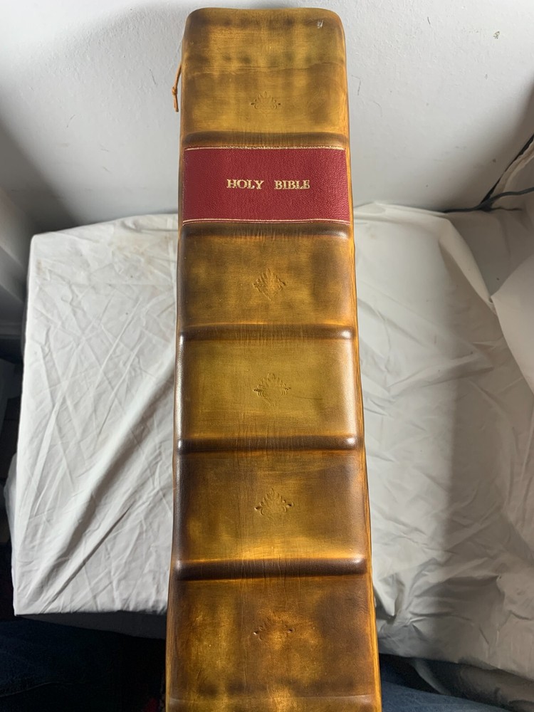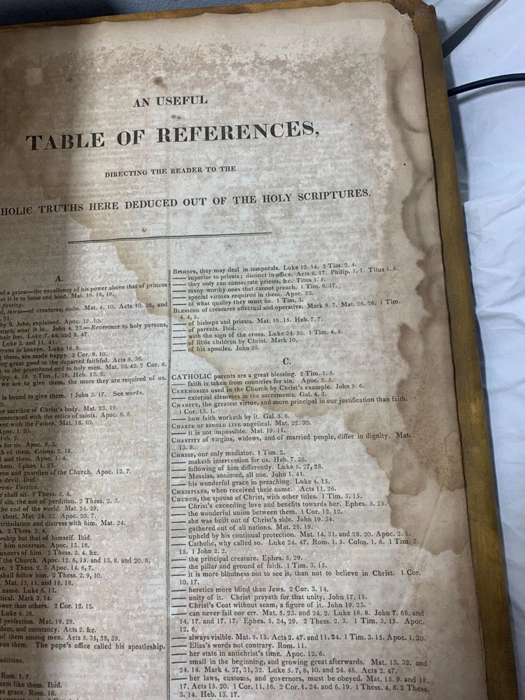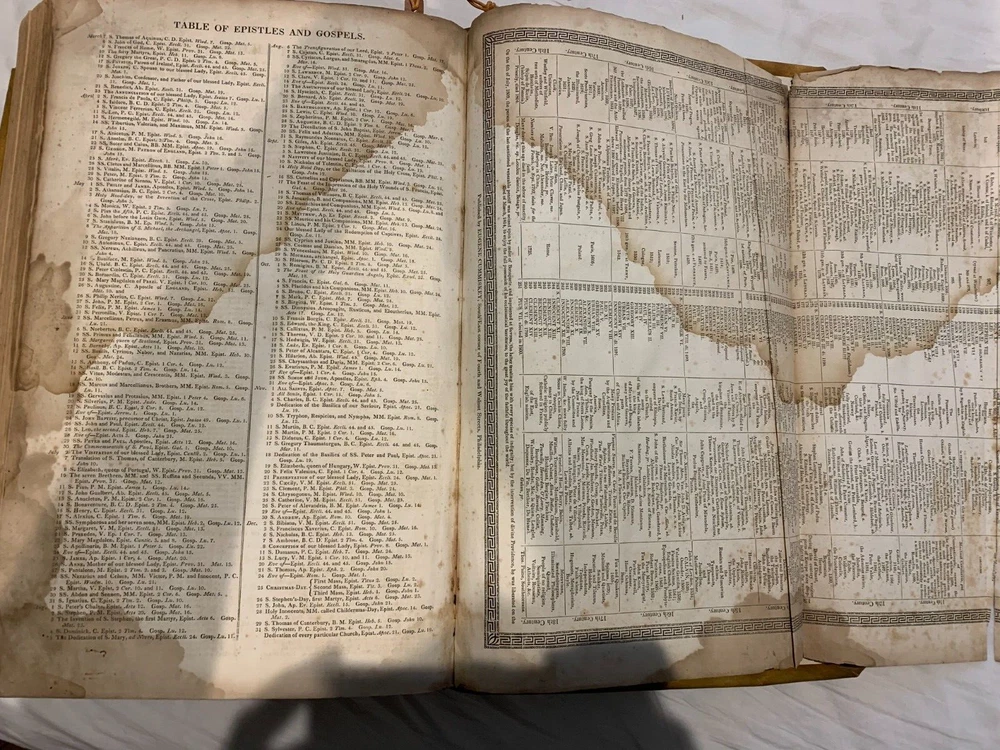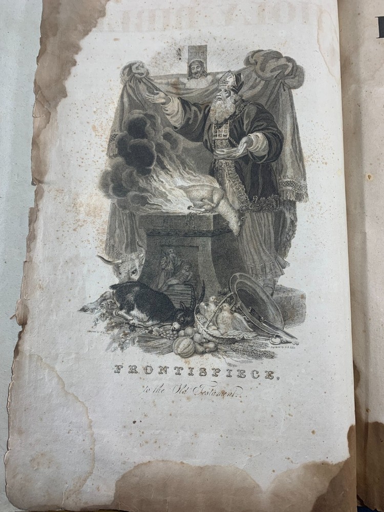 1825 Douay-Rheims Catholic Jumbo Folio Bible – Illustrated – Rare Early American Edition: DESCRIPTION Offered is a scarce and historically important 1825 Douay-Rheims Catholic Bible , classified as Herbert 1733 , in a jumbo folio format with engraved biblical illustrations . This edition is among the earliest American Catholic folio Bibles printed during a pivotal era of Catholic growth and emancipation in the United States. This Douay-Rheims translation—originally rendered from the Latin Vulgate by English Catholic scholars in exile—is presented here in its Challoner revision , which remained the standard English Catholic Bible for centuries. This specific 1825 edition is significant for being: One of the first Catholic folio Bibles published in America Illustrated with period engravings , ideal for public reading or devotional display Rare in this format , especially with engraved plates and original binding KEY FEATURES Herbert Bibliography Ref #1733 – Identifies it as a large folio Douay-Rheims edition, published in 1825. Oversized folio format – Produced for ceremonial, altar, or family display use. Illustrations – Contains full-page engravings depicting major biblical scenes (e.g., Creation, Crucifixion, Resurrection). Printed by Eugene Cummiskey – One of the earliest Catholic Bible printers in the U.S., based in Philadelphia. Textual Authority – Reflects Bishop Challoner’s revered revision of the Douay-Rheims version. Illustrations: All plates present. COLLECTOR'S NOTES This edition represents a milestone in early American Catholic publishing. Copies of the Herbert 1733 folio Douay-Rheims Bible are exceedingly scarce—especially complete with engravings and in solid condition. It is a museum-worthy volume for: Antiquarian book collectors Catholic historians and institutions Bible scholars Devotional heritage displays Dimensions: Weight - 9.1kg Height - 45cm Width - 29cm Thickness - 12cm Damage(Please see above photos for reference): There are water marks across the bible (These do not affect the reading of the text). There is foxing throughout the bible. There are pages which are either bent awkwardly or ripped.