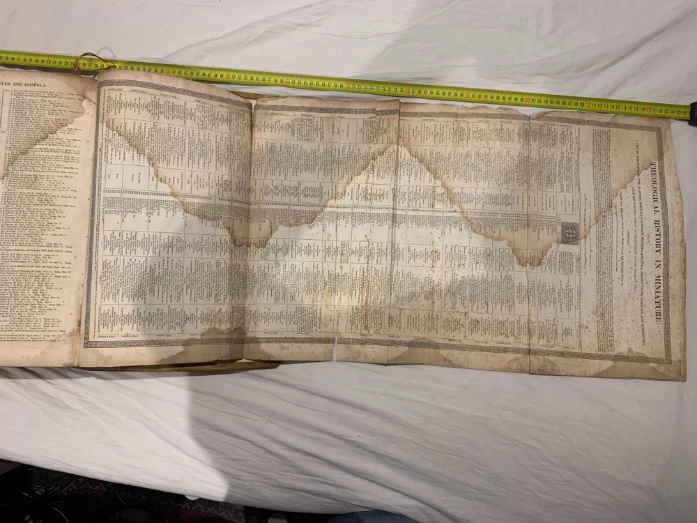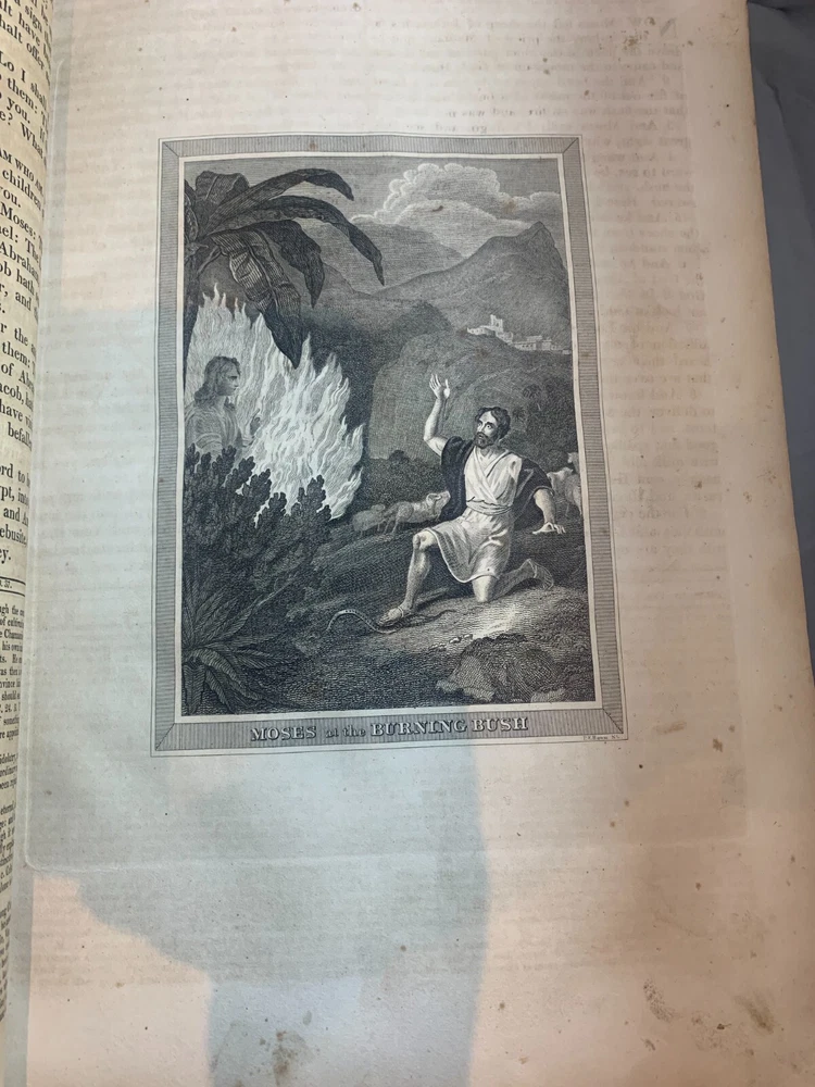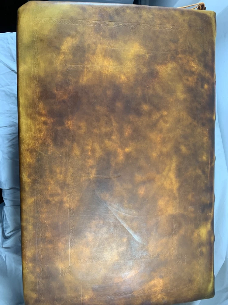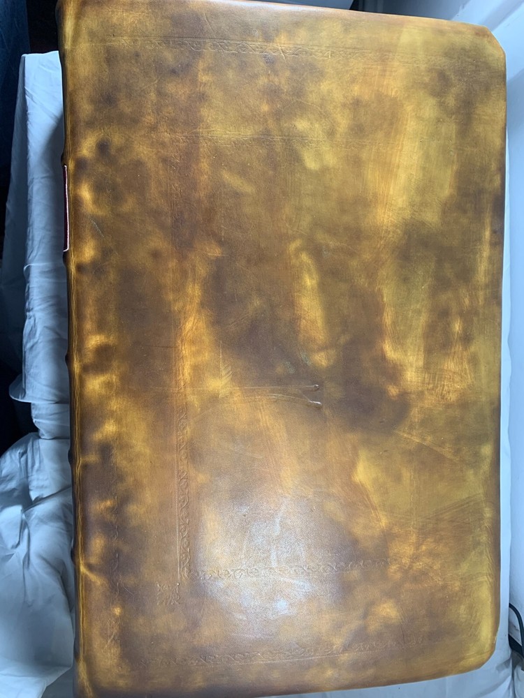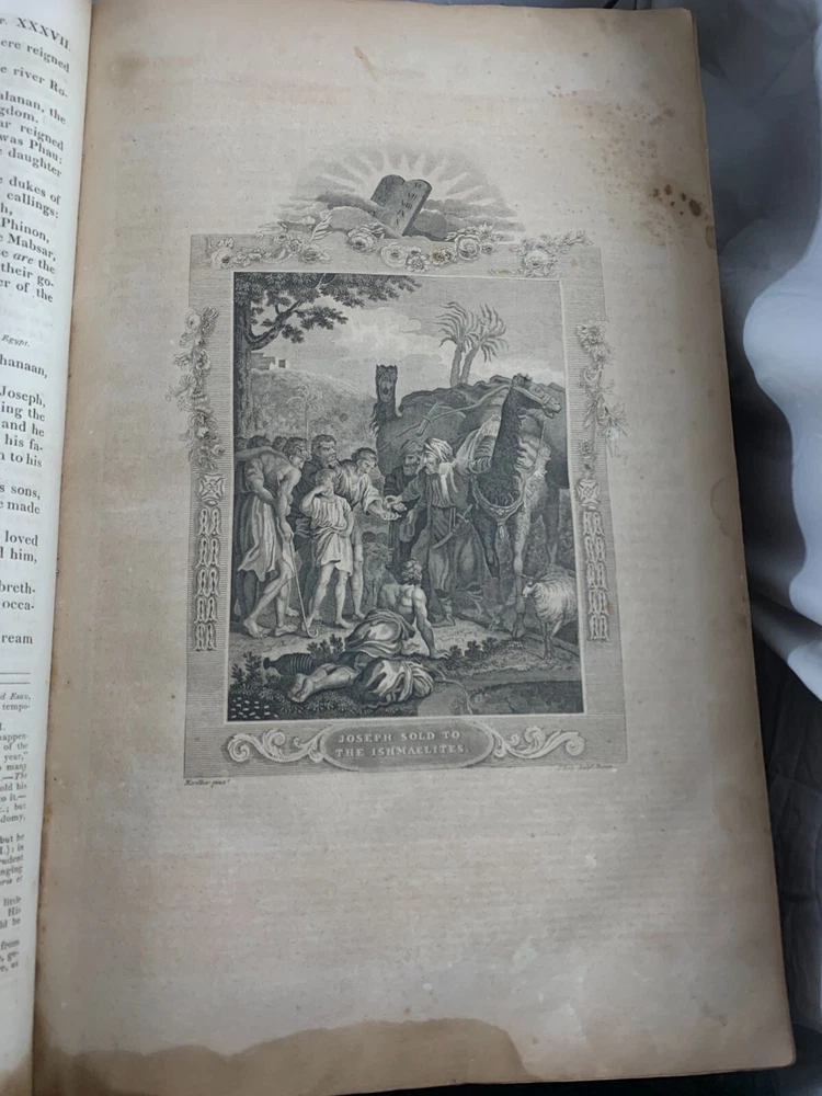 1825 Douay-Rheims Catholic Jumbo Folio Bible – Illustrated – Rare Early American Edition: DESCRIPTION Offered is a scarce and historically important 1825 Douay-Rheims Catholic Bible , classified as Herbert 1733 , in a jumbo folio format with engraved biblical illustrations . This edition is among the earliest American Catholic folio Bibles printed during a pivotal era of Catholic growth and emancipation in the United States. This Douay-Rheims translation—originally rendered from the Latin Vulgate by English Catholic scholars in exile—is presented here in its Challoner revision , which remained the standard English Catholic Bible for centuries. This specific 1825 edition is significant for being: One of the first Catholic folio Bibles published in America Illustrated with period engravings , ideal for public reading or devotional display Rare in this format , especially with engraved plates and original binding KEY FEATURES Herbert Bibliography Ref #1733 – Identifies it as a large folio Douay-Rheims edition, published in 1825. Oversized folio format – Produced for ceremonial, altar, or family display use. Illustrations – Contains full-page engravings depicting major biblical scenes (e.g., Creation, Crucifixion, Resurrection). Printed by Eugene Cummiskey – One of the earliest Catholic Bible printers in the U.S., based in Philadelphia. Textual Authority – Reflects Bishop Challoner’s revered revision of the Douay-Rheims version. Illustrations: All plates present. COLLECTOR'S NOTES This edition represents a milestone in early American Catholic publishing. Copies of the Herbert 1733 folio Douay-Rheims Bible are exceedingly scarce—especially complete with engravings and in solid condition. It is a museum-worthy volume for: Antiquarian book collectors Catholic historians and institutions Bible scholars Devotional heritage displays Dimensions: Weight - 9.1kg Height - 45cm Width - 29cm Thickness - 12cm Damage(Please see above photos for reference): There are water marks across the bible (These do not affect the reading of the text). There is foxing throughout the bible. There are pages which are either bent awkwardly or ripped.