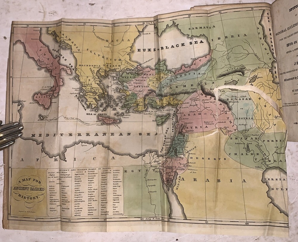 An Epitome of General Ecclesiastical History from the Earliest Period to the Present Time with an Appendix Giving a Condensed History of the Jews from the Destruction of Jerusalem to the Present Day Illustrated by Maps and Engravings by John Marsh, A. M. New York: Vanderpool & Cole 1827 First Edition Octavo, 420, 32 pages, period full leather binding with gilt lettering and decoration to spine. Illustrated with several foldouts, including a hand-colored foldout frontispiece map and black-and-white engravings. Large tear to the hand-colored map, some rubbing and wear, scuffs, foxing and discoloration, else in good + condition. If you have any questions, feel free to ask, and don't forget to check out my other listings.