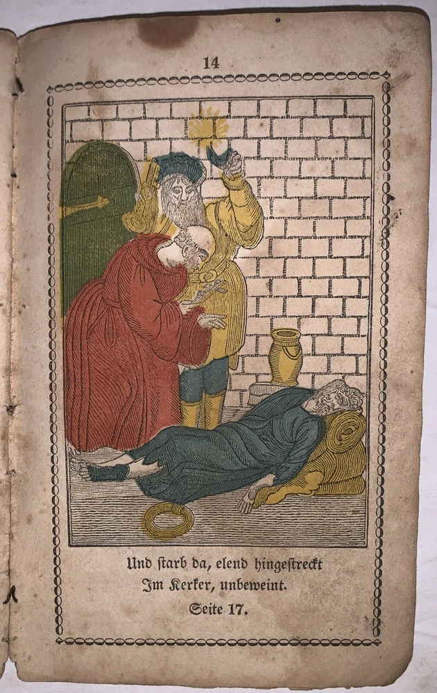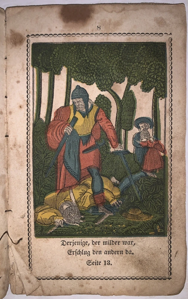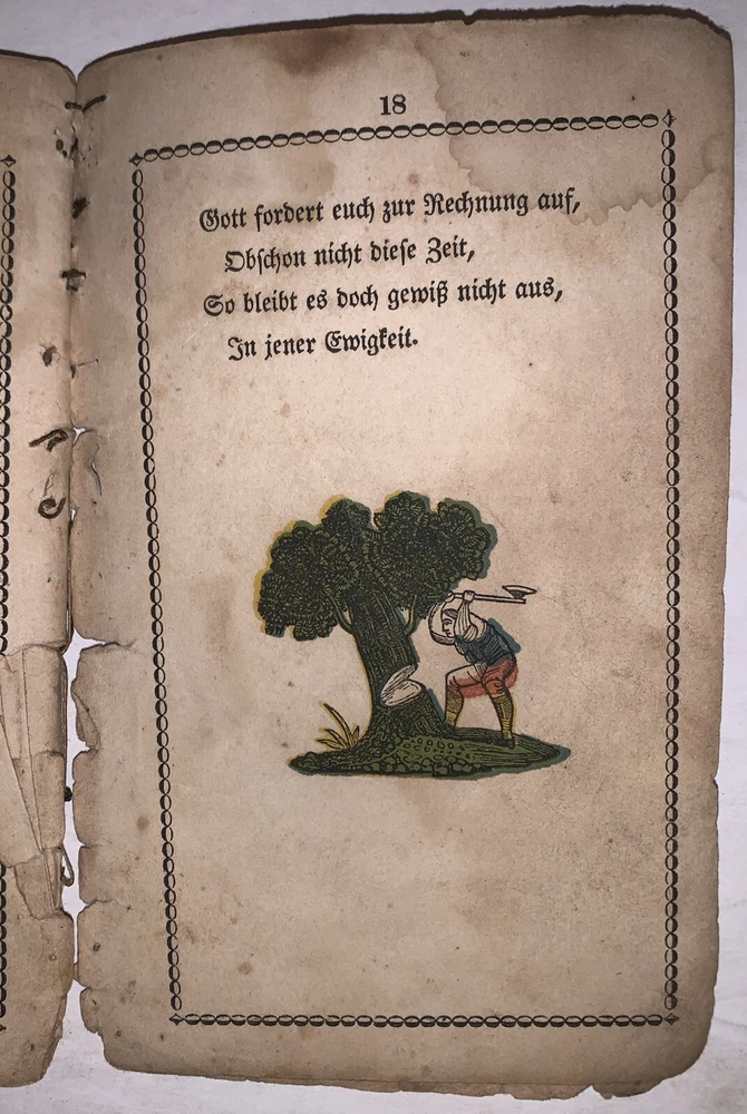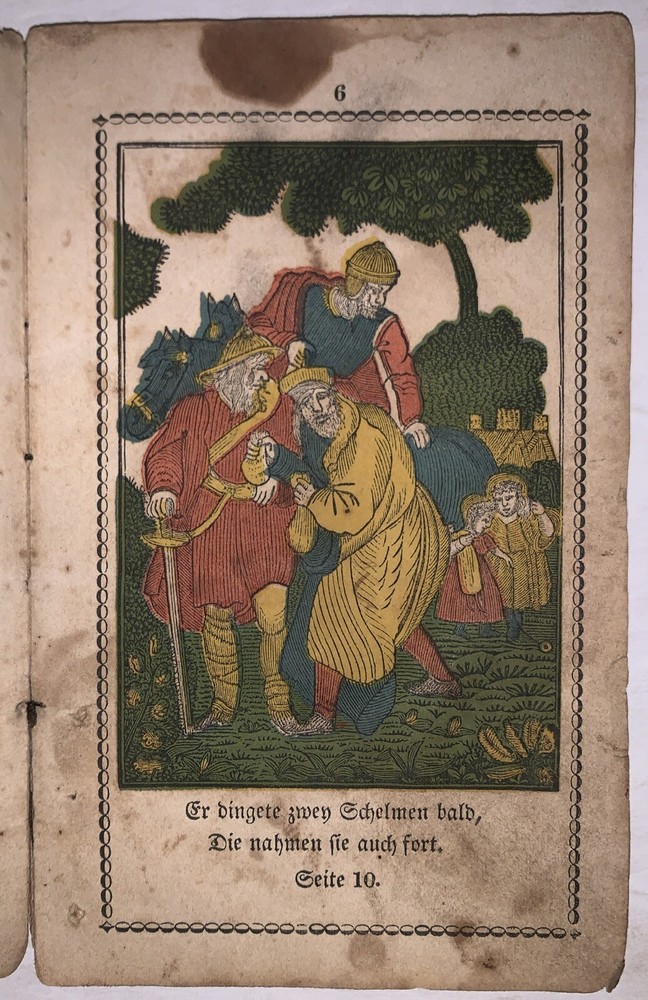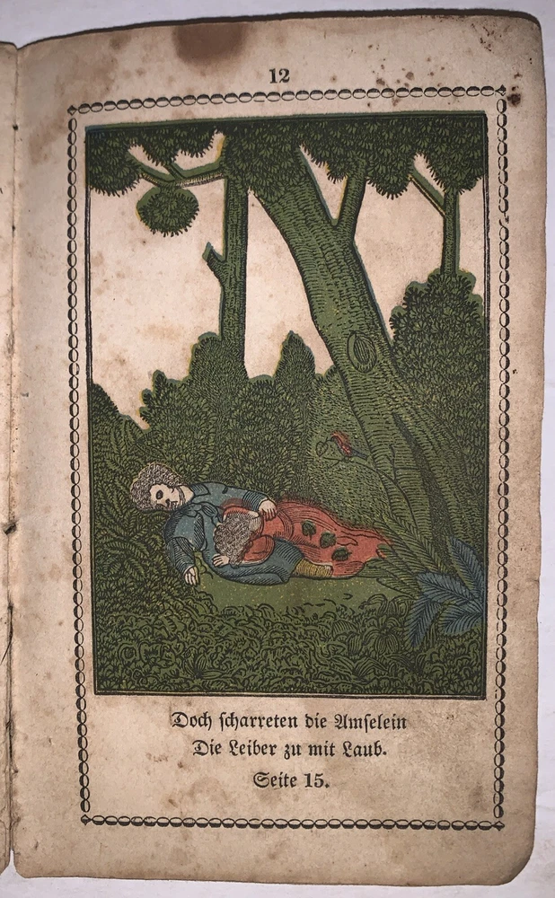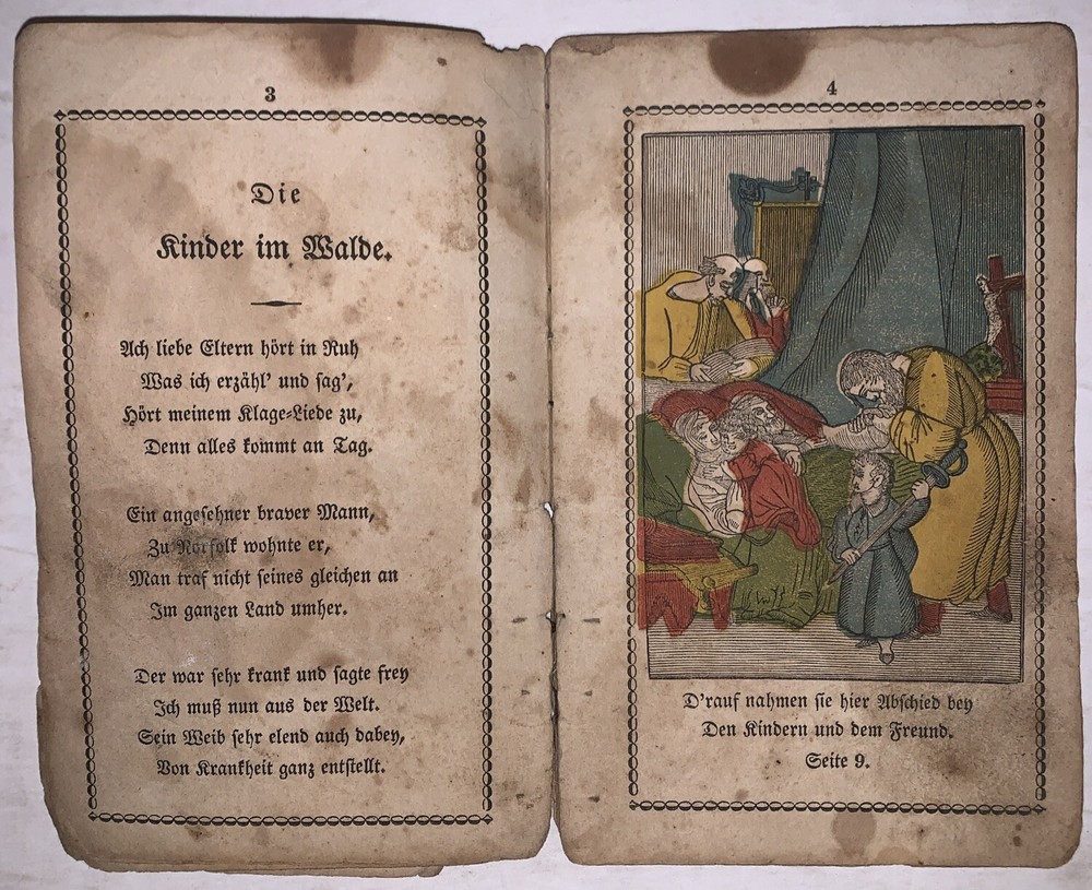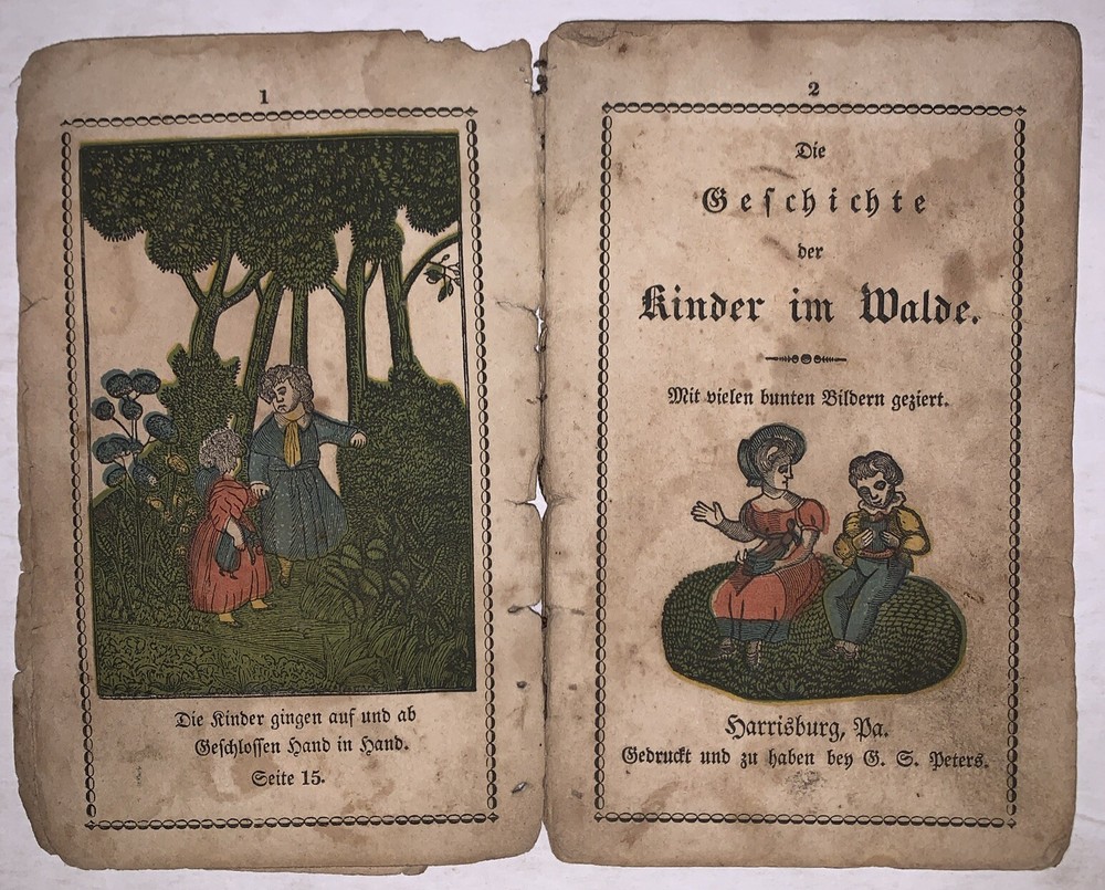 [Peters, Gustav Sigismund] Die Geschichte der Kinder im Walde Mit Vielen bunten Bildern geziert Harriburg, PA: Gedruckt und zu haben bey G. S. Peters ND, [1830] First Edition 32mo, 18 pages, publisher's original printed wraps. Illustrated with 8 hand colored illustrations. Text in German. Wraps detached, rubbing and wear, discoloration and foxing, else in good condition. If you have any questions, feel free to ask, and don't forget to check out my other listings.