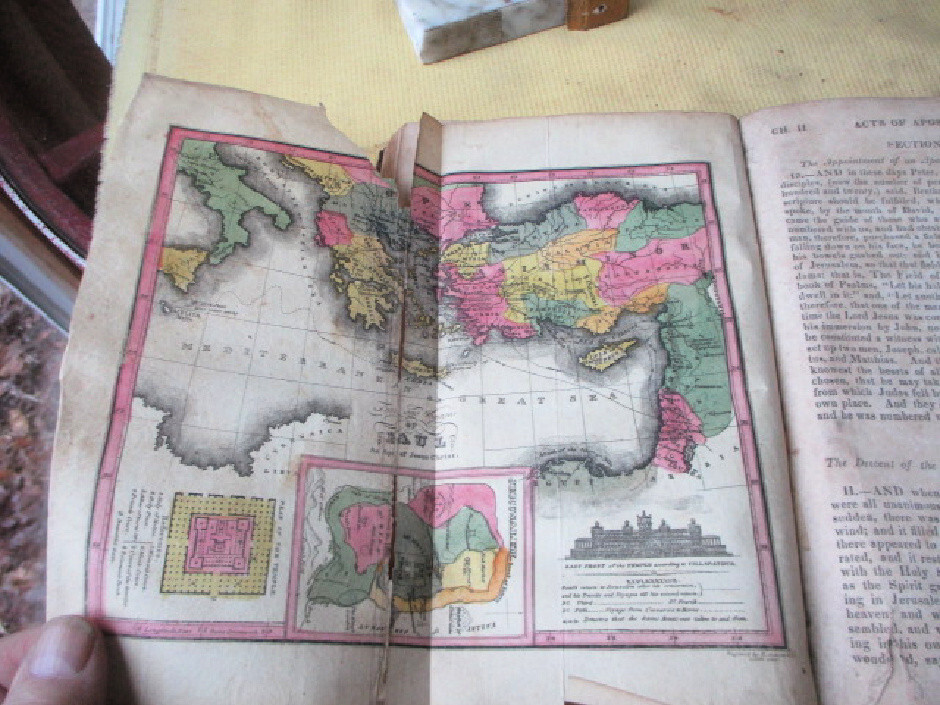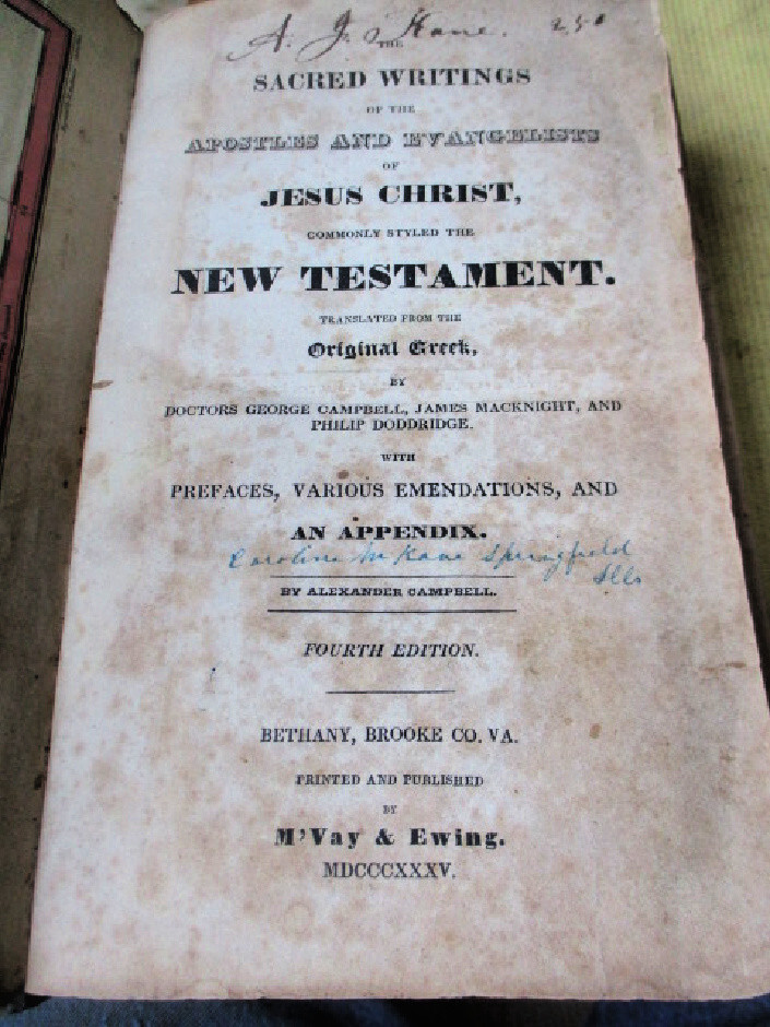 e1545. Sacred Writings of Apostles and Evangelist of Jesus Christ, commonly styled The New Testament. Translated from original Greek by Campbell, Macknight, Doddridge, with Appendix, etc by Alexander Campbell, 4th Edition, Bethany, Brooke Co., VA., 1835. Pub'd by M'Vay & Ewing. Octavo, 401 pages, full calf covers.....front cover reinforced within and 5 pages repaired. Folding color map in front in Good condition and another folding color map in poor condition at page 209. This is a survivor of old house fire with a couple scorch marks on top edges of both covers. Acceptable condition. PLEASE NOTE: This book has rudimentary repairs......not professional, but with enough skill to make it serviceable. Do not hesitate to e-mail with any questions. As Always, Satisfaction Guaranteed! I expect to receive payment within 10 days, unless we have made other arrangements. Shipping will be USPS Media mail or Priority, if requested. I'm glad to combine multiple purchases in order to minimize shipping costs. I WILL SHIP INTERNATIONALLY, and I try to be as economical as possible with the shipping costs. RETURN POLICY: Satisfaction Guaranteed! Track Page Views With Auctiva's FREE Counter