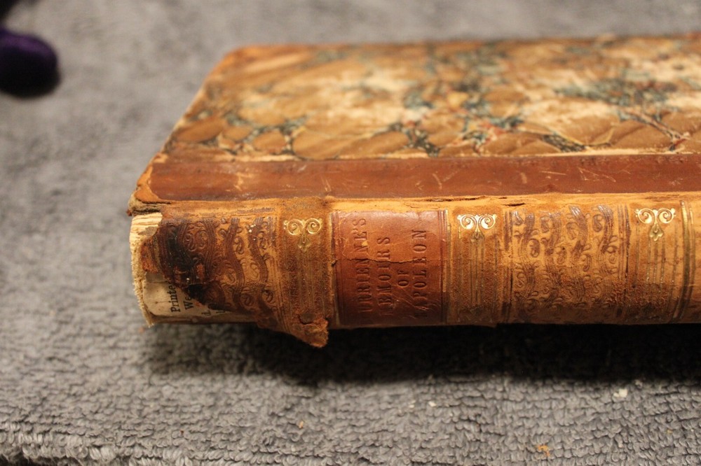 The product is a rare and valuable 1836 first edition leather-bound book titled "Memoirs of Napoleon Bonaparte" by M. De Bourrienne. Published in London by Richard Bentley, this historical text is illustrated and written in English. This collectible piece offers a unique glimpse into European history, making it a coveted item for book collectors and enthusiasts of historical literature.The hardcover binding is in poor condition. The contents are in fair condition