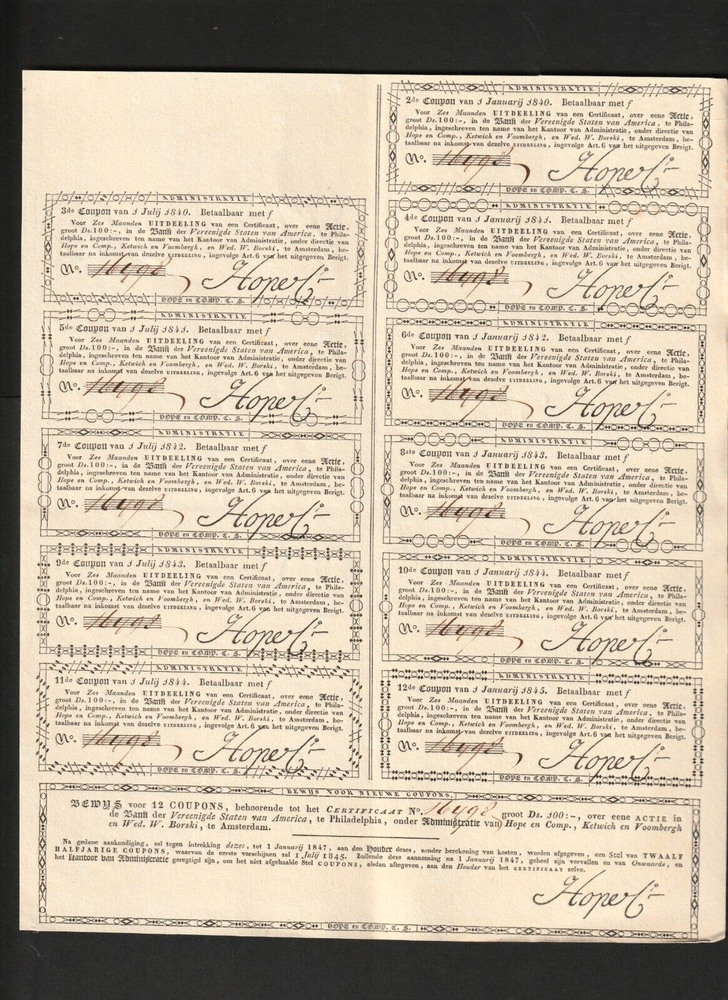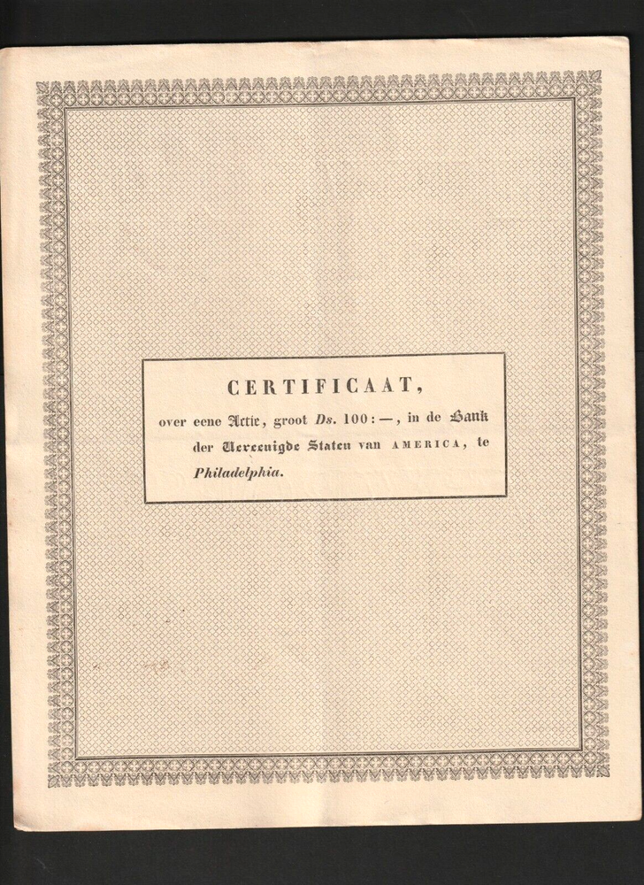 One bearer share certificate of "Bank der Vereenidde Staten van America" from Philadelphia (USA) / Amsterdam (Netherlands). 1842 . Condition (opinion): Very Fine (VF). Contains coupons Nr.2 to 12 ,see scan .Watermark paper.Dry seal ,4 handwritten signatures (Hope & Co,Ketwich & Voombergh and Weduwe Willem Borski.Tears or cuts : 1 at lower edge of 4mm. Size:21cm/26,2cm (main document w/o coupons and folded if opened will be double of this size) .Without cancellations or uncancelled. ---------------------------------------------------------------------------------- Historical document for collectable or historical research only. Use this picture for reference only, serial number may be different. Please read carefully the sale terms ,shipping conditions and information below. The buyer accepts those terms, conditions and cost described. ---------------------------------------------------------------------------------------- Terms of sale and shippig information Postage, including packing material, handling fees : Europe: USD 9.00 / USA $ 10.00. Rest of the World: USD 11.00. FREE of postage for other items. (excluding purchases under US$70.00 with a weight greater than 100 gr. including the protection and packaging card ) . Only one shipping charge per shipment (the highest one) no matter how many items you buy (combined shipping). ----------------------------------------------------------------------------- Guaranteed genuine - One month return policy (retail sales) . Returns accepted with no questions. Customers are invited to combine purchases to save postage. As we have (or could have) more than one identical item ,the serial number may differ from those shown in the picture which is for reference only. For purchases above $70.00 we send the orders registered with tracking number without extra charge, for purchases below $70.00 we ship as regular letters at the buyer's risk. For purchases below $ 70,00 who want to register your letter with tracking number, please add an extra for : Europe $4.20 , U.S. $5.00 ,Rest of the word $5.90 .For this case ,please request or wait for our invoice before paying. Postage include packaging material and handling fees. For some destinations and purchases below $70.00 customers may be requested for this extra shipping payment in order to register the shipment with tracking number. We reserve the right to cancel transactions that require the sending of unregistered letters (without tracking number) to some destinations when this extra payment has been requested. For purchases over $70.00, the excess weight will be free. For purchases under US$70.00 with a weight greater than 100 gr. including the protection and packaging card, the buyer is asked not to make the payment until receiving the invoice or shipment note, since the cost will be calculated and the type of shipment will be assessed (registered or insured or not) and the buyer will be charged the approximate total of the costs of the Post Office rate (rates that are public and can be consulted), in this case the costs of packaging materials, handling and delivery management are free. In the event that the buyer has already made the payment, he will be asked to pay the difference that is missing for the payment of the postal rate. Likewise, we reserve the right to cancel transactions that have not been paid this extra amount when requested. If for any reason, your item did not arrive yet, or you are not 100% satisfied with the item you have received, please do not hesitate to contact , I will do all it takes to provide the best service. Full refund policy ,including shipping cost, guaranteed in case of lost or theft after the completion of the complaint with Spanish Correos for the registered letters (free of extra charges for purchases abobe $70.00 or with the extra charge paid for purchases below $70.00). The buyer must notify to us of the delay in the arrival of his purchase when he meets 3 weeks ( to Europe) to 4 weeks (rest of the World) this guarantee expires two months after the shipment of his purchase if we have not previously received notice of the delay . --------------------------------------------------------------------------------------- Banknote Grading UNC AU EF VF F VG G Fair Poor Uncirculated About Uncirculated Extremely Fine Very Fine Fine Very Good Good Fair Poor Edges no counting marks light counting folds OR... light counting folds corners are not fully rounded much handling on edges rounded edges Folds no folds ...OR one light fold through center max. three light folds or one strong crease several horizontal and vertical folds many folds and creases Paper color paper is clean with bright colors paper may have minimal dirt or some color smudging, but still crisp paper is not excessively dirty, but may have some softness paper may be dirty, discolored or stained very dirty, discolored and with some writing very dirty, discolorated, with writing and some obscured portions very dirty, discolored, with writing and obscured portions Tears no tears no tears into the border minor tears in the border, but out of design tears into the design Holes no holes no center hole, but staple hole usual center hole and staple hole Integrity no pieces missing no large pieces missing piece missing piece missing or tape holding pieces together ---------------------------- See some information found at the web:(online translated/orientative only) ........The certificate was issued by Hope & Comp, Ketwich and Voombergh and widow William Borski, Amsterdam, 1842, 1844 and 1845 (ie three "different" pieces).; Original signatures of Hope, Ketwich Voombergh and Wed. W. Borski, edge of "musical notes writing" *. When the U.S. bank after failed cotton speculation, came along with some 1,000 other banks in difficulty, one could in Netherlands surrender his original shares in Bank said Hope (etc.), which then together the interests of those seeking to represent. Given the complete coupon sheet was not much mor