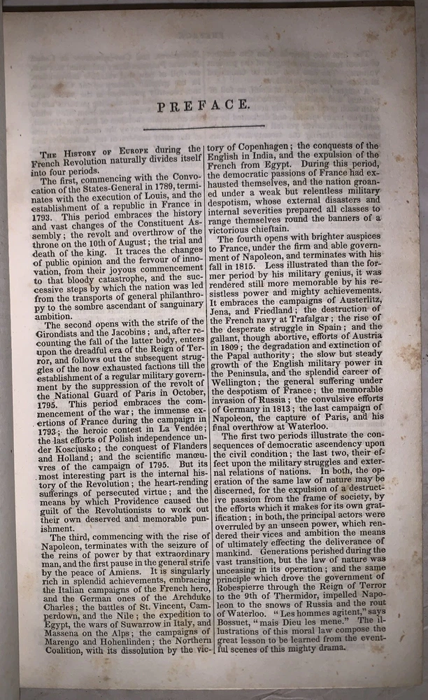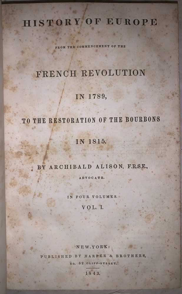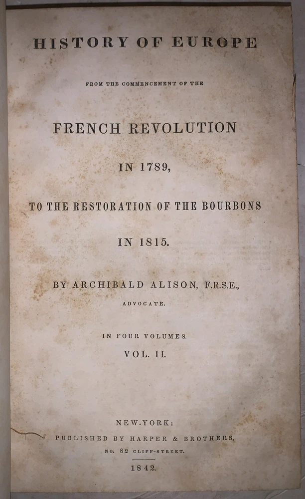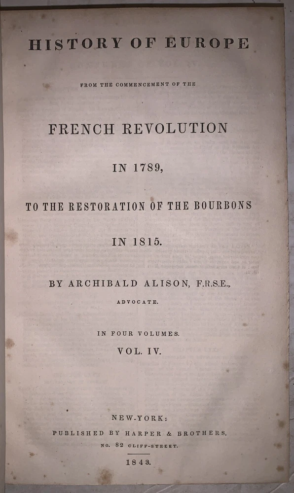 History of Europe from the Commencement of the French Revolution in 1789 to the Restoration of the Bourbons in 1815 by Archibald Alison, F.R.S.E. In Four Volumes New York: Harper & Brothers 1843 Four octavos, 583p; 600p; 612p; 631 pages, bound in period black leather over paper covered boards. Spines with small raised and gilt bands and lettering. Marbled endpapers and edges. The previous owner was Pratt Roberts (1805–1882), whose neat bookplate appears in each volume. Roberts was a resident of East Goshen, Chester County, Pennsylvania. Some rubbing and wear, a few scuffs, some foxing and discoloration, else in very good condition. If you have any questions, feel free to ask, and don't forget to check out my other listings.