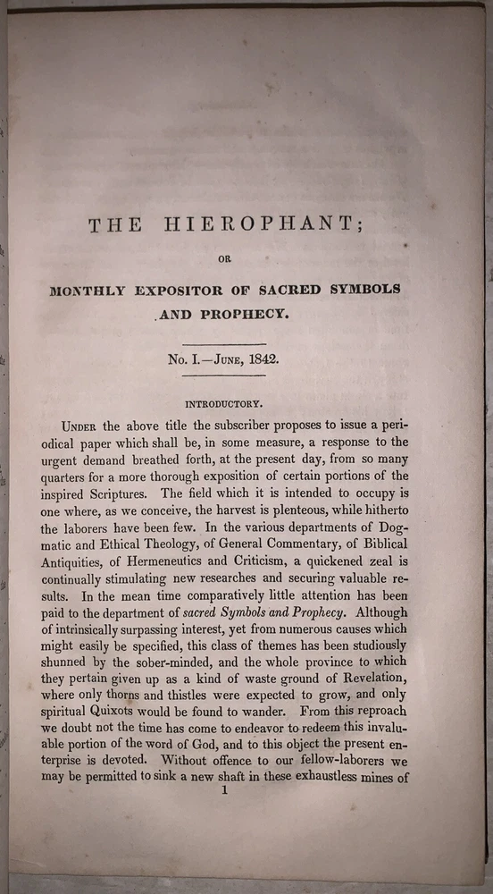 The Hierophant: or Monthly Journal of Sacred Symbols and Prophecy Conducted by George Bush, A.M. Complete in One Volume New York: Mark H. Newman 1844 First Edition Octavo, ii, 288 pages, publisher's original gilt lettered black cloth covered boards with blind-stamped decoration. Some minor rubbing and wear, minimal discoloration, else in very good + condition. The Hierophant: or Monthly Journal of Sacred Symbols and Prophecy, edited by George Bush and published in New York in 1844, was a periodical dedicated to the exploration of religious symbolism and prophetic literature. Through its 12 issues, released between June 1842 and May 1843, the journal offered theological insights and interpretations of sacred symbols, drawing connections to broader religious and philosophical themes. It served as a platform for scholarly discourse on the significance of prophecy and its role within sacred texts. Aimed at deepening readers' understanding of spiritual and symbolic dimensions, The Hierophant reflected the intellectual and theological curiosities of its 19th-century audience, contributing meaningfully to contemporary religious scholarship. If you have any questions, feel free to ask, and don't forget to check out my other listings.