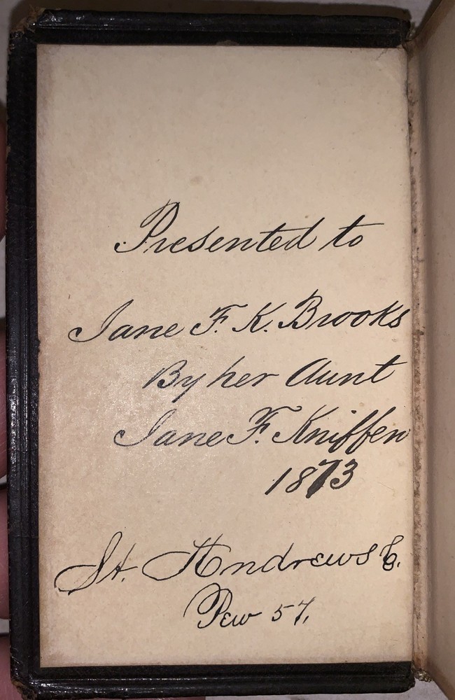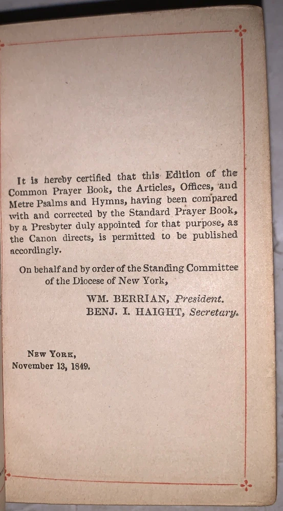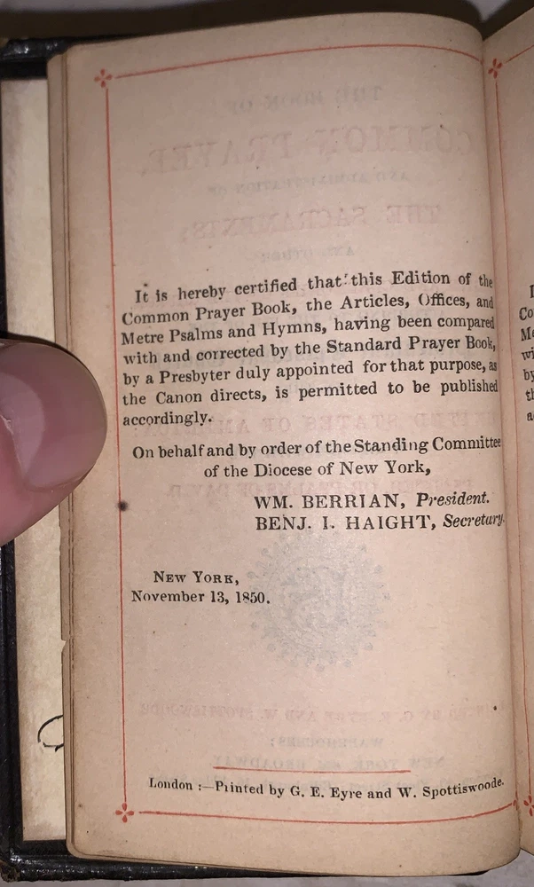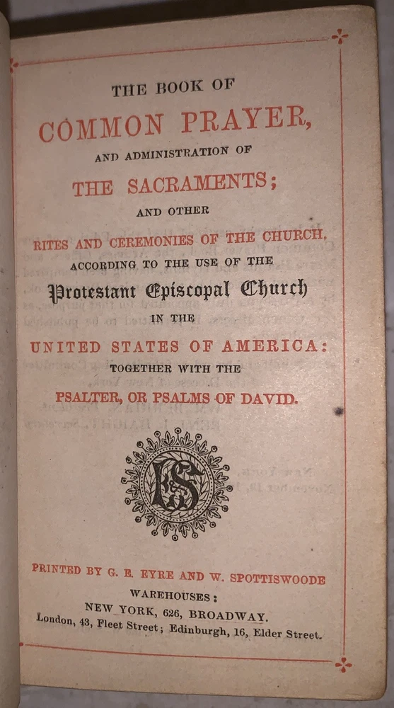 The Book of Common Prayer, and Administration of The Sacraments, and other Rites and Ceremonies of the Church According to the Use of the Protestant Episcopal Church in the United States of America: Together with the Psalter, or Psalms of David New York: G. E. Eyre and Spottiswoode 1850 64mo, unpaginated, bound in full leather with raised bands and gilt lettering to spine. All edges gilt. Previous owner's inscription, some minor rubbing and discoloration, chip to top of spine, else in very good condition. If you have any questions, feel free to ask, and don't forget to check out my other listings.