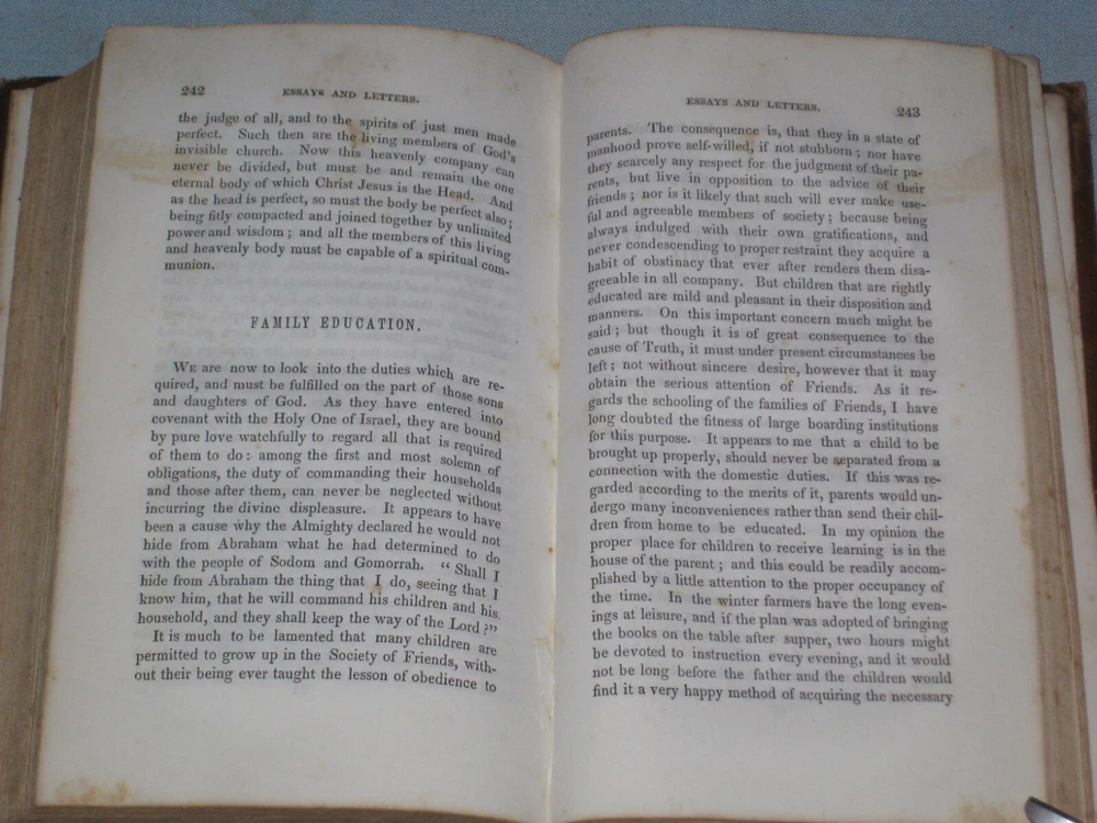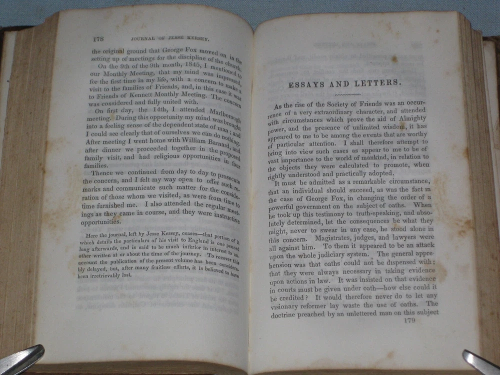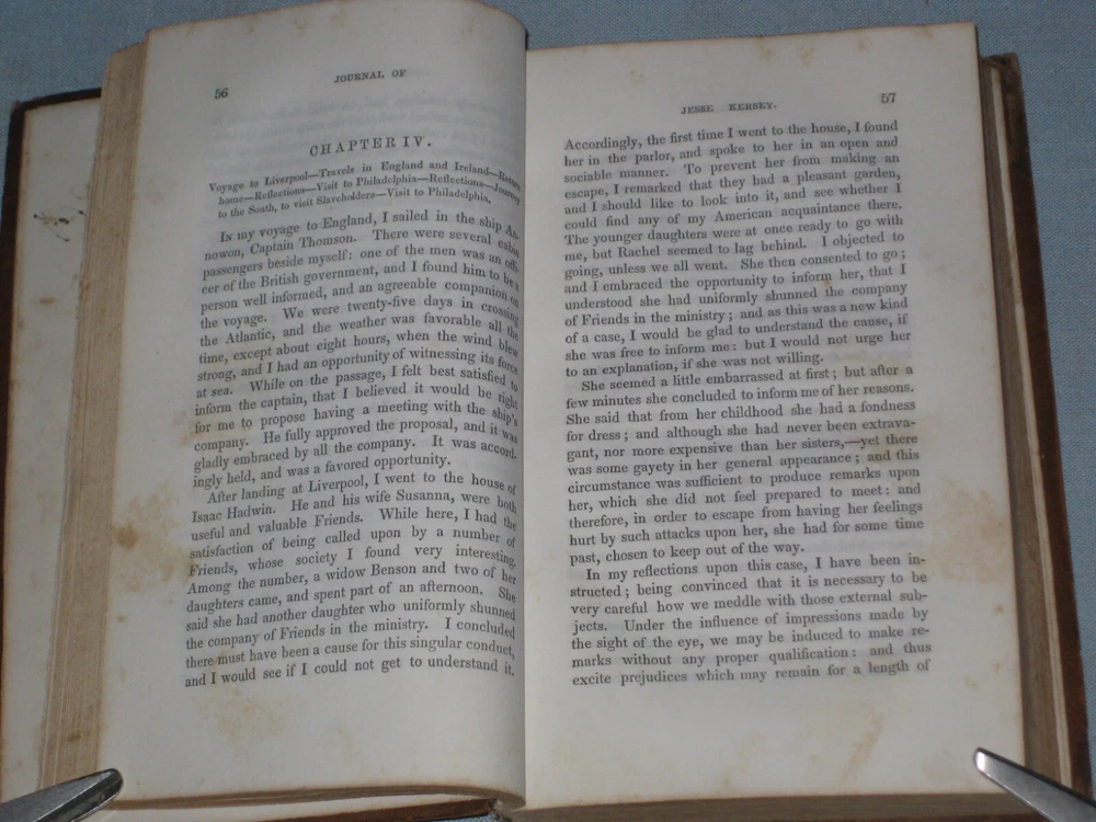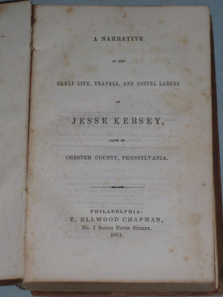 UP FOR AUCTION IS A 1851 BOOK ''A NARRATIVE OF THE EARLY LIFE, TRAVELS AND GOSPEL LABORS OF JESSE KERSEY LATE CHESTER COUNTY PENNSYLVANIA'' PUBLISHED BY T. ELLWOOD CHAPMAN. LEATHER HARDCOVER APP. 5'' X 7.5'' AND 288 PAGES LONG, TITLE PAGE DATE AND COPYRIGHT DATE 1851 THUS FIRST EDITION, PAGES ARE FINE, SOME PAGES HAVE MINOR FOXING, ORIGINAL OWNERS NAME ON THE FRONT END-PAPER, THE COVER HAS MINOR WEAR ON THE LEATHER SURFACE, MINOR FADING, SOME WEAR ON THE SPINE EDGES, SOME WEAR CHIPS RIPS ALONG THE SPINE SURFACE, VERY MINOR WEAR ON THE CORNERS. BOTH THE FRONT & BACK COVER END-BOARDS ARE ALMOST DETACHED AND LOOSE. SOLD AS IS.
