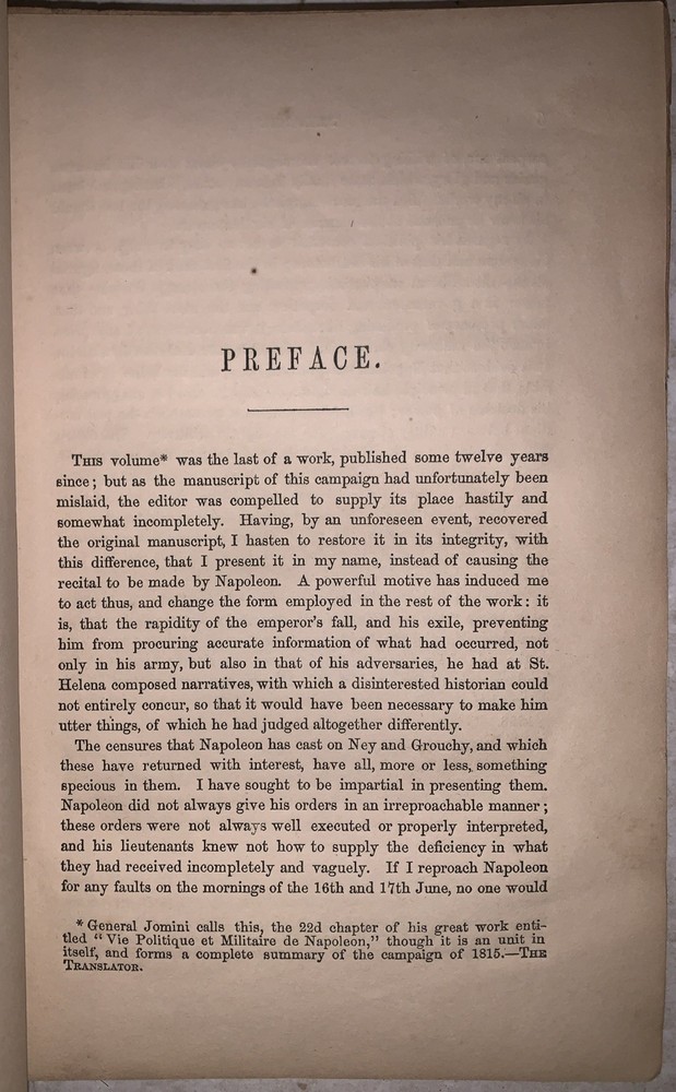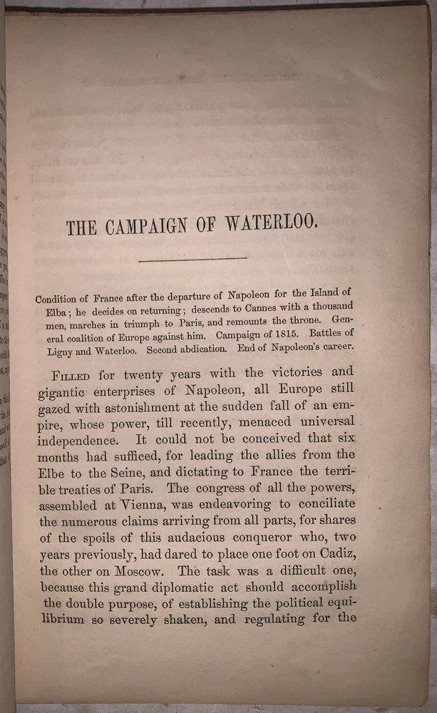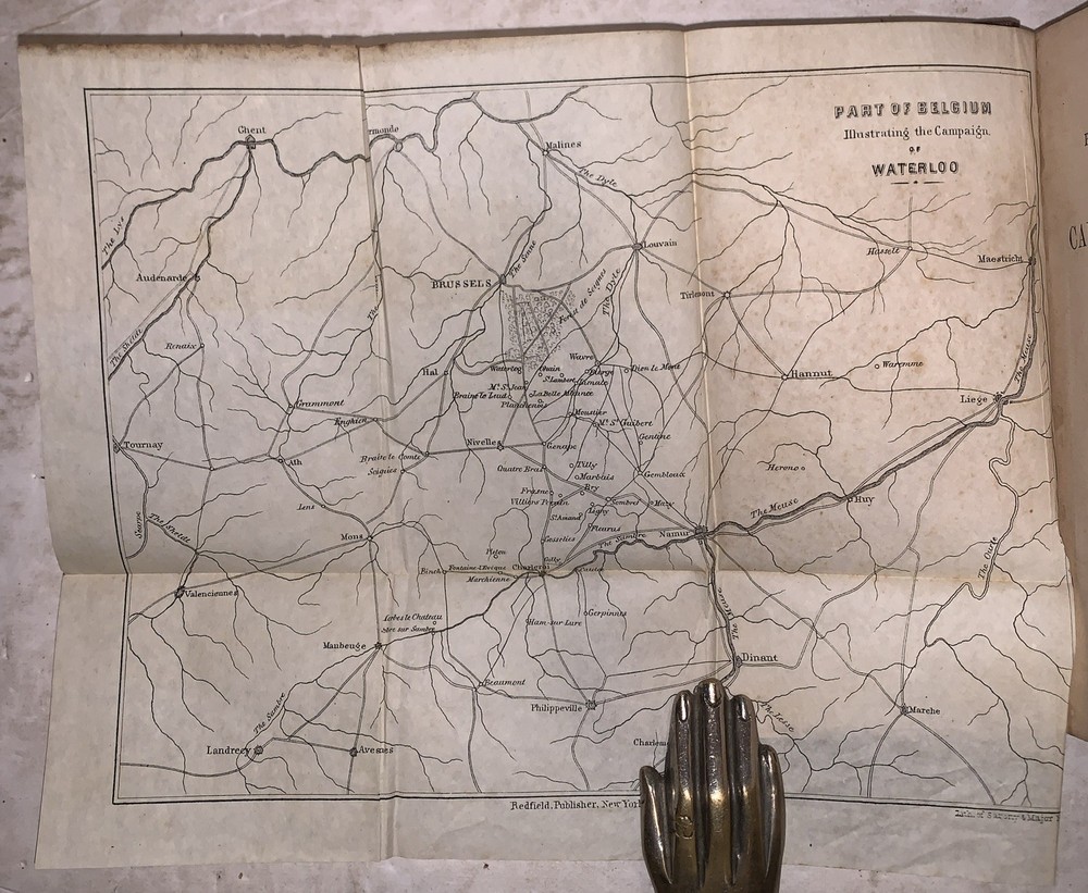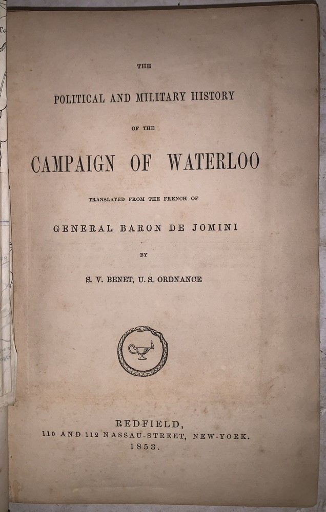 The Political and Military History of the Campaign of Waterloo Translated from the French of General Baron de Jomini by S.V. Benet, U.S. Ordnance New York: Redfield 1853 First Edition 12mo, 227 pages plus adverts, publisher's original black cloth covered boards with gilt decoration to spine. Illustrated with a fold-out frontispiece map. Some rubbing and wear, damage to spine, soiling to top board, previous owner's note to front free endpaper, some foxing and discoloration, else in good + condition. If you have any questions, feel free to ask, and don't forget to check out my other listings.