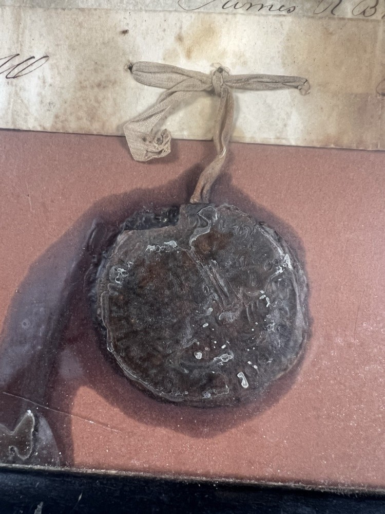 Original State of Georgia land grant / survey plat dated 1853, issued under provisions of the 1850 land act, relating to property in Carroll County, Georgia. This document represents an antebellum Georgia land allocation and includes an original wax seal attached by ribbon, handwritten names, acreage details, and official survey information. The document is currently framed. Document Details • State: Georgia • County: Carroll County • Date surveyed: January 20, 1853 • Grantee: Thomas J. Terrell • Land description: Lot 327, 8th District • Acreage: Approximately 158 acres • Original wax seal present • Handwritten survey and certification details Condition Notes • Authentic original document • Heavy age-related wear including foxing, staining, folds, edge wear, and small areas of paper loss • Wax seal remains attached but shows age softening • Frame appears to be later and may not be archival • Document has not been cleaned or restored • Sold exactly as shown in photos This is a solid pre–Civil War Georgia land document suitable for collectors of Southern history, land records, genealogy, or early American legal documents.