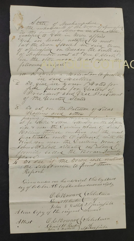 1860 antique SPRINGFIELD nh TOWN MEETING WARRANT voting presidential election