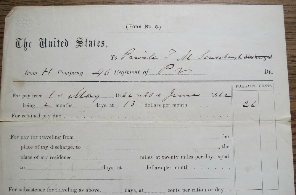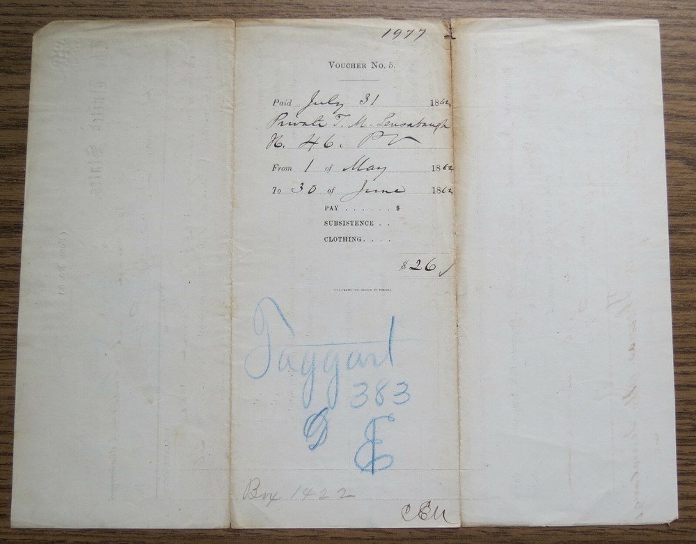 1862 Civil War Payment Voucher - J.M. Lensaburgh 46th PA Regiment $26 Military Pay Document