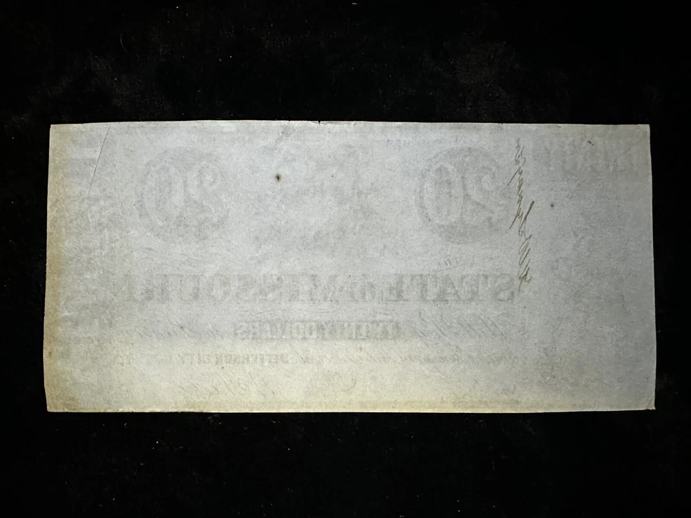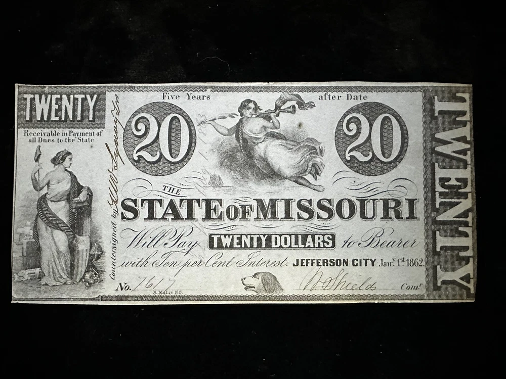 This 1862 Cr.1 $20 banknote is a piece of history from the Civil War era. The note was issued by the state of Missouri and features intricate designs and typography. It is a great addition to any collection of obsolete currency and comes uncertified. The denomination of the note is $20 and it was manufactured in the United States. This banknote is a rare find for any history buff or collector of paper money.