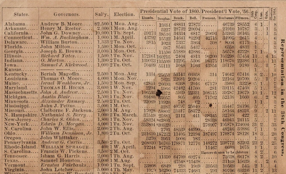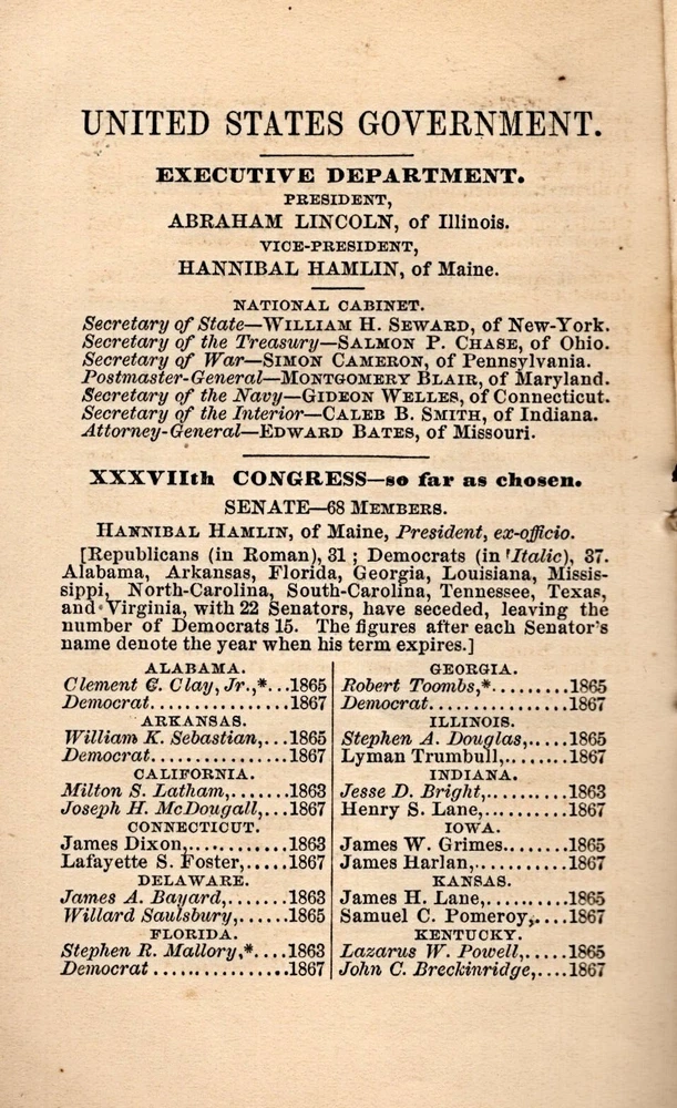 This is an 84 page booklet with the statistics from the 1861 elections for President Abraham Lincoln as well as local statistics for the State of New Hampshire elections. It is 5 & 1/2" by 3 & 1/2" bound with staples. There is a stain on the left side of the cover and on the back cover but it is otherwise in fine condition.