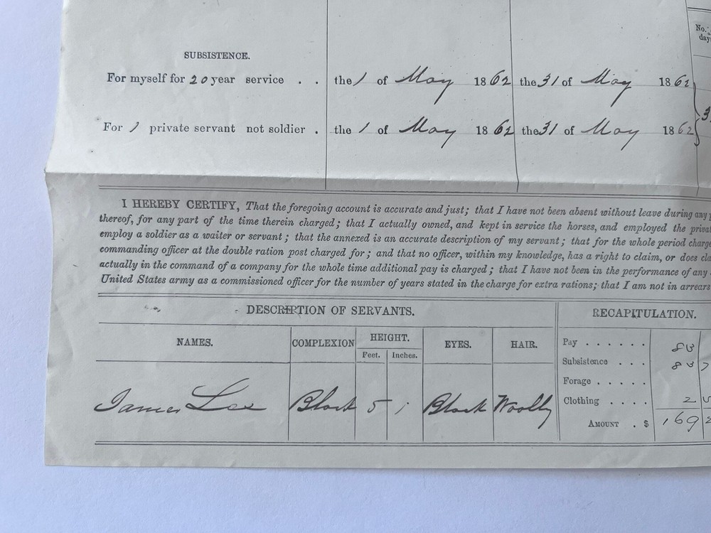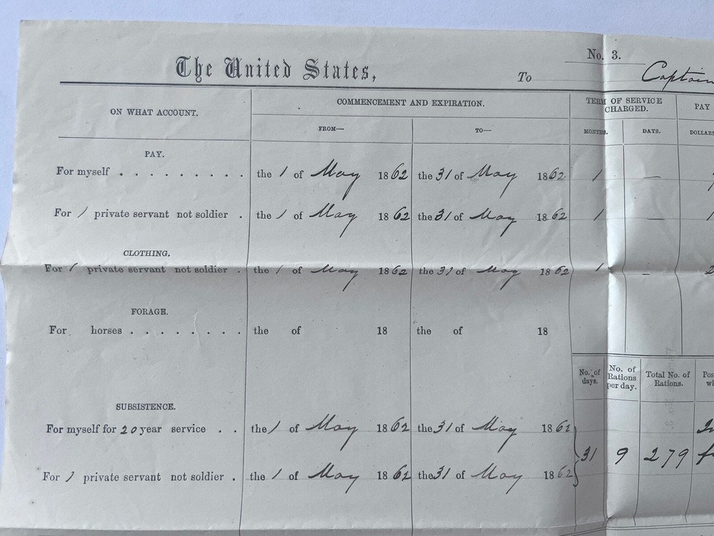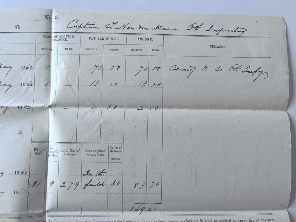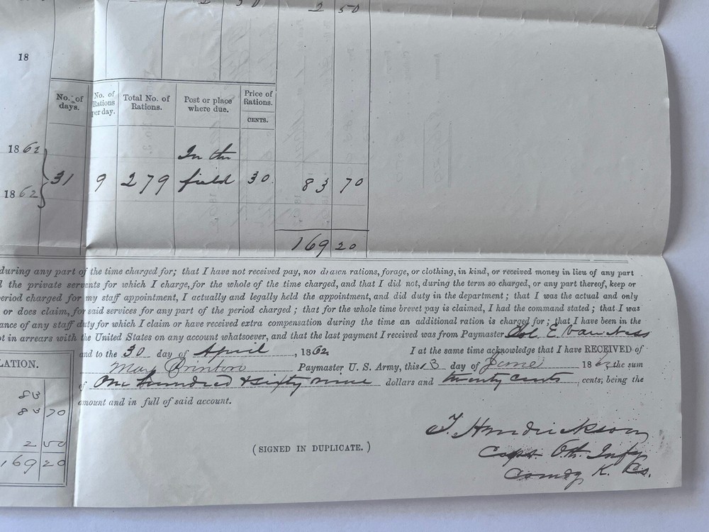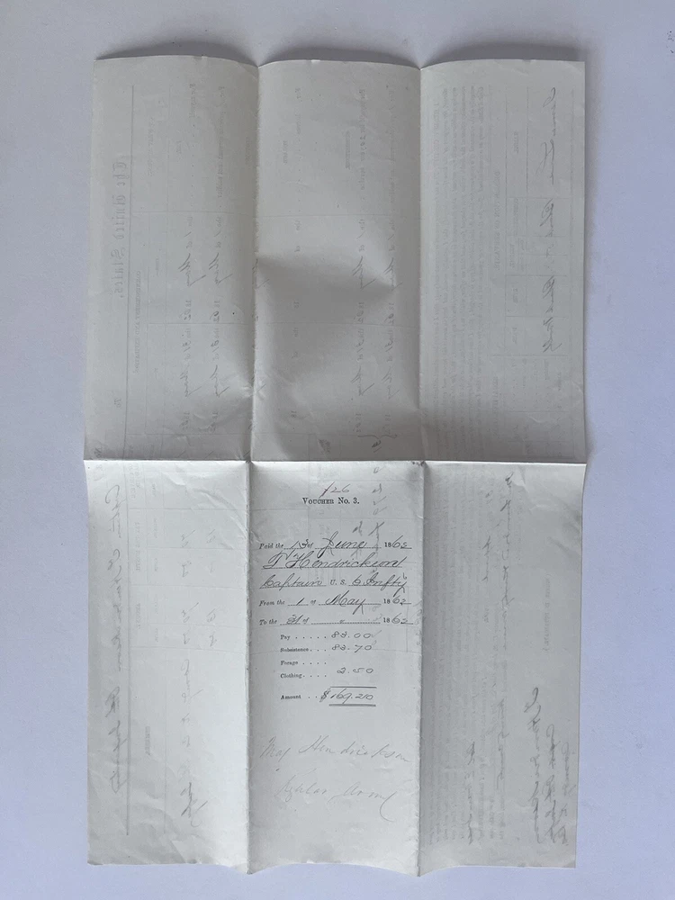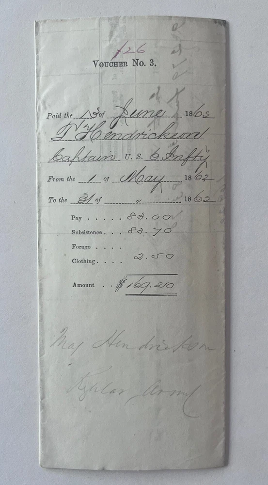 Union Pay voucher for Captain Thomas Hendrickson of the 6th Infantry and his black private servant James in great condition! There is slight discoloration and staining on the document due to age. Penciled note on back as well. On June 27, 1862, Captain Thomas Hendrickson participated in the battle at Gaines' Mill. Confederate General Robert E. Lee led an attack on General Fitz John Porter's isolated V Corps in the afternoon. This battle was the second in a series of engagements called the Seven Days Battles, which forced General George McClellan's Union army to retreat from the outskirts of Richmond. Below is an excerpt of the 6th Infantry's experience, under Hendrickson's command, during this battle. "As the regiment's position was in advance of the first line and in the woods, the status of affairs was not at once apparent, but a few moments under heavy canister fire sufficed to clear up matters, and, crossing a small bridge, the Sixth in disarray passed to the rear between two of the enemy's skirmish lines, and reformed on the ridge occupied by Generals French and Meagher. Later in the evening the regiment moved into the valley of the Chickahominy, and early on the morning of the 28th crossed that stream. The bridge was destroyed after the passage of the Sixth Infantry, the last troops to leave the field. In this action Captain R. W. Foote was killed, and Lieutenants H. A. F. Worth and D. D. Lynn were wounded. Captain Thomas Hendrickson, commanding the regiment, had his horse killed under him. Of the enlisted men five were killed and sixty-one wounded." https://history.army.mil/books/r&h/R&H-6IN.htm