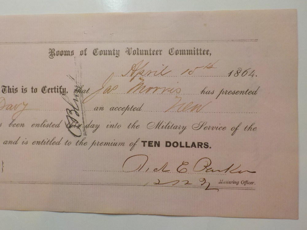 An original Civil War document dated 1864. This document says a man is entitled to a ten dollar premium for a recruit who has enlisted into the military service. It is signed at the bottom. The document has some wear and some stain marks in areas. If you have any questions feel free to ask. Thank you for looking. Please note I list new items every week. TERMS AND CONDITIONS Winning bid will pay $2.00 for shipping and handling. Shipping discounts available for multiple items won. For orders shipped in America take 50% off the regular shipping charge for each additional item won. (Please note: The highest shipping and handling charge will be charged the full amount first.) If you would like me to hold any items won to combine shipping with a future auction let me know and I will accommodate. Will ship to any location world wide, all shipping and handling rates to locations outside the United States are twice the listed amount in the item description. Buyers are responsible, for all customs, and international taxes, etc.