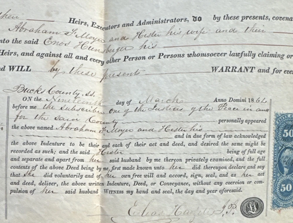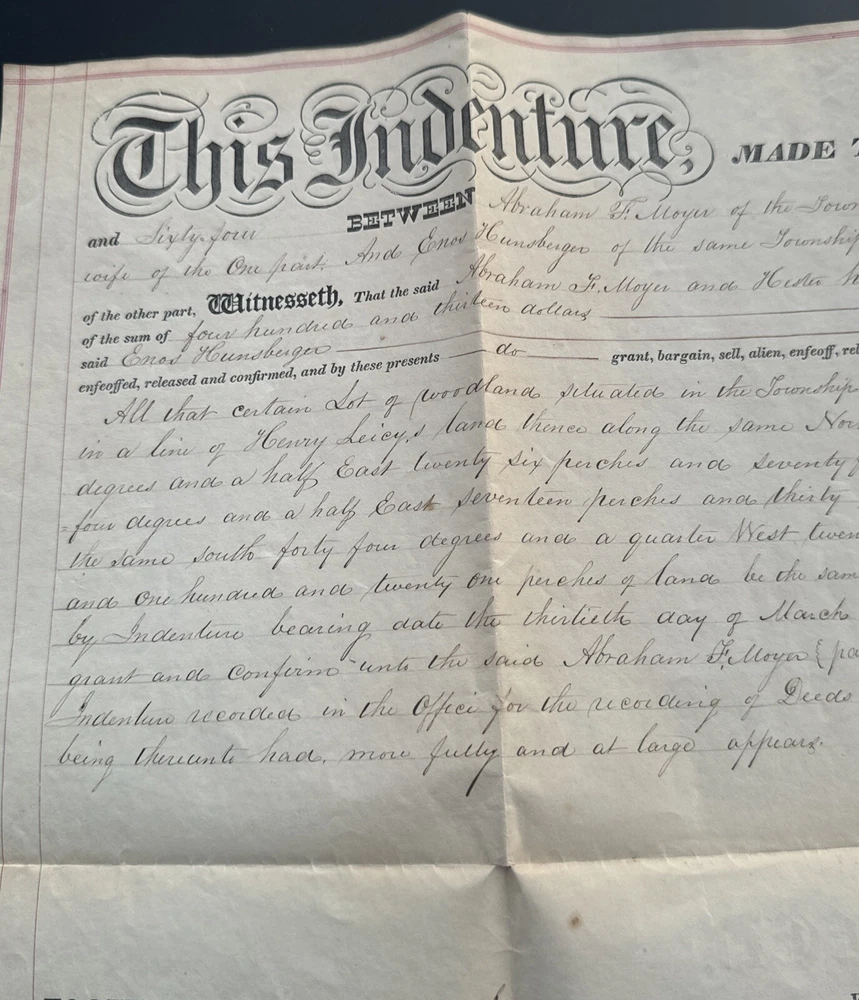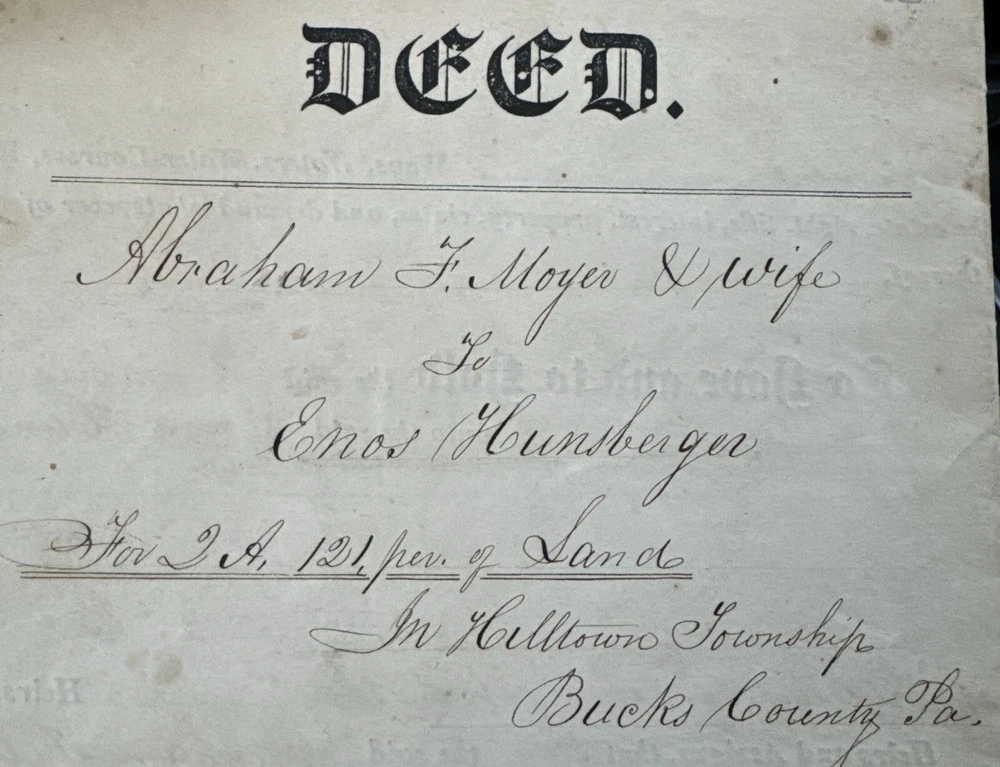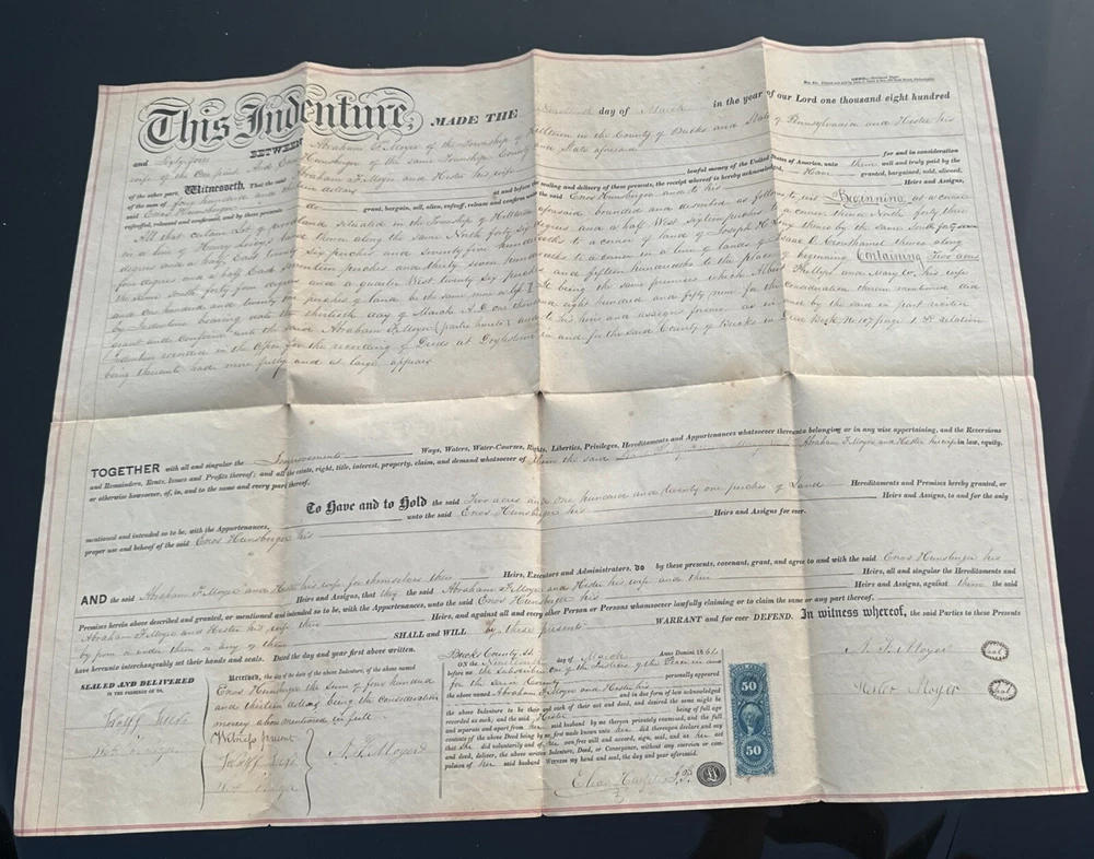 This antique land deed from 1864 is a fascinating piece of history. It shows the transfer of land from Abe F. Moyer to Enos Hunsberger in Hilltown Township, Bucks County, United States. The document is a testament to the rich heritage of the area and the people who lived there. The real estate transaction was between Abraham and his brother-in-law Enos Hunsberger. The deed is a collectible item for those interested in paper documents and historical land transfers. It is a valuable addition to any collection and a unique insight into the past. The document has been well-preserved and offers a clear view of the transaction that took place over 150 years ago. Biographical information: When Abraham Fretz Moyer was born on 19 September 1822, in Upper Salford Township, Montgomery, Pennsylvania, United States, his father, Abraham Bergey Moyer, was 37 and his mother, Elizabeth Fretz, was 41. He married Hester Hunsberger in 1844. They were the parents of at least 8 sons and 4 daughters. He lived in Franconia Township, Montgomery, Pennsylvania, United States in 1850 and Hilltown Township, Bucks, Pennsylvania, United States in 1860. He died on 4 February 1902, in Hilltown, Hilltown Township, Bucks, Pennsylvania, United States, at the age of 79, and was buried in Blooming Glen Mennonite Meetinghouse Graveyard, Blooming Glen, Hilltown Township, Bucks, Pennsylvania, United States.