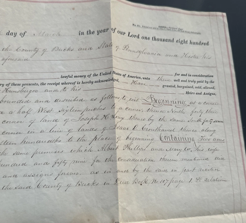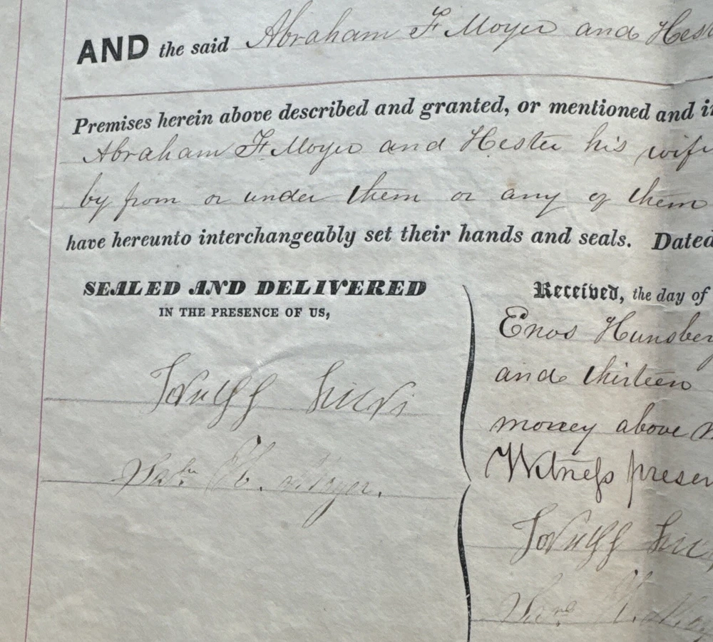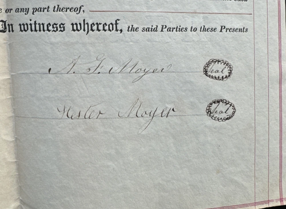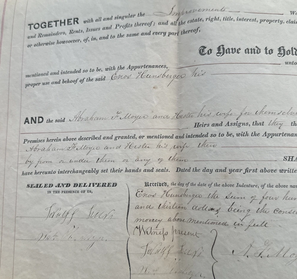 This antique land deed from 1864 is a fascinating piece of history. It shows the transfer of land from Abe F. Moyer to Enos Hunsberger in Hilltown Township, Bucks County, United States. The document is a testament to the rich heritage of the area and the people who lived there. The real estate transaction was between Abraham and his brother-in-law Enos Hunsberger. The deed is a collectible item for those interested in paper documents and historical land transfers. It is a valuable addition to any collection and a unique insight into the past. The document has been well-preserved and offers a clear view of the transaction that took place over 150 years ago. Biographical information: When Abraham Fretz Moyer was born on 19 September 1822, in Upper Salford Township, Montgomery, Pennsylvania, United States, his father, Abraham Bergey Moyer, was 37 and his mother, Elizabeth Fretz, was 41. He married Hester Hunsberger in 1844. They were the parents of at least 8 sons and 4 daughters. He lived in Franconia Township, Montgomery, Pennsylvania, United States in 1850 and Hilltown Township, Bucks, Pennsylvania, United States in 1860. He died on 4 February 1902, in Hilltown, Hilltown Township, Bucks, Pennsylvania, United States, at the age of 79, and was buried in Blooming Glen Mennonite Meetinghouse Graveyard, Blooming Glen, Hilltown Township, Bucks, Pennsylvania, United States.