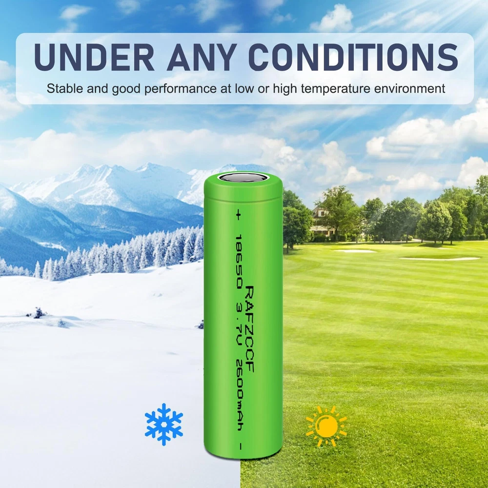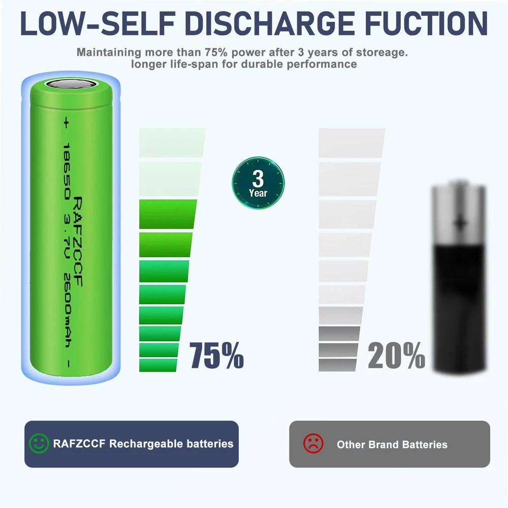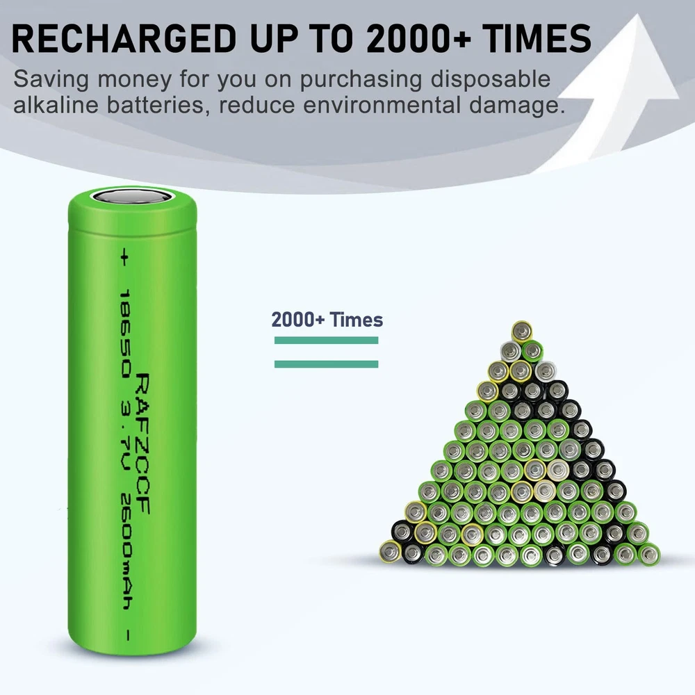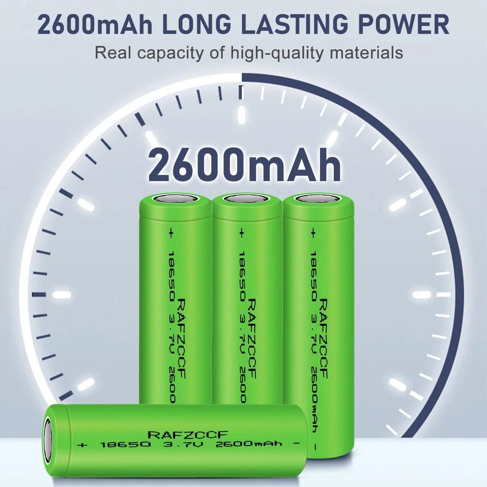 【Wide Compatibility and Rechargeable】2600mAh high capacity 18650 rechargeable battery can be widely used for LED flashlights, solar lights, racing, game controller, lights, portable devices, headlamps, toys, remote controls, doorbells and other electronic devices. 【Product Parameters】This 18650 battery 3.7V standard voltage 2600mAh high capacity, Size:2.55*0.7inch(65 * 18mm) .it's a rechargeable battery FLAT TOP, Please confirm whether your device is suitable before purchasing. 【Pre-Charged】Each 3.7v lithium ion battery is ready to use and It can be recharged over 2000 times and keep 60% power after non-use for 2 years. 【Product Quality】Low discharge multiplier, no memory effect. 3.7 volt rechargeable battery are tested under strict quality control standards,safe and reliable use.Premium Li-ion Cells For Longer Battery Life . 【Quality Service】1 month return and exchange, if you have any questions about ours 3.7v battery, please feel free to us, we will provide you with professional solutions and satisfactory services as soon as possible.
