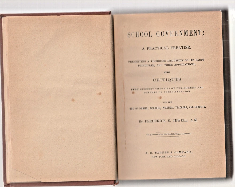 Antique HC Book Normal School Government Punishment 1866 1st ed. Front Cover - title - Teachers' Library. Albany NY. The book introduces the Normal School discipline philosophy during the Victorian era. May be historically significant re. the philosophy about punishment's fitting the offence advice for teacher's and their pupils. School Government A practical Treatise Punishments Theories By Frederick S. Jewell, A.M. For use of Normal Schools, Practical Teachers, and Parents. Pub. A.S. Barnes & Co. Features include - back pages with illustrated ads for new publications physical versus moral reactions to the offender and the Humanitarian Scheme. Former owner's name on inside front cover. 308 pgs. Unique Handwritten notes, the previous owner must've attended a lecture about the punishment subject. Various theories are written about in pencil see scan 4 - In part - the degree of severity = the amount of pain to inflict. Nice gold lettering on binding in good condition. minor staining on 1st pg only not on text, nice tight binding, complete. Ships from Canada to U.S. and Canada, other locations please request price quote. no refunds, no returns.