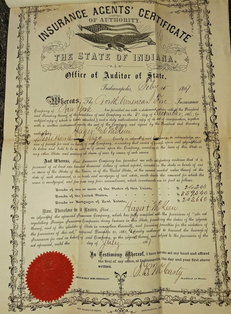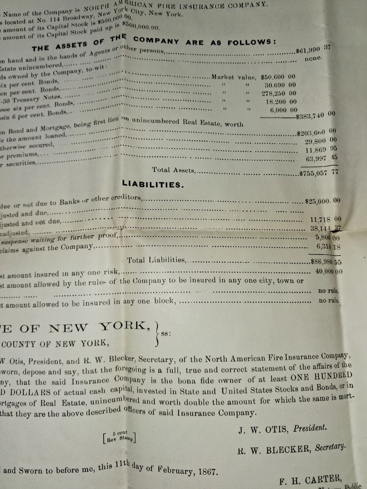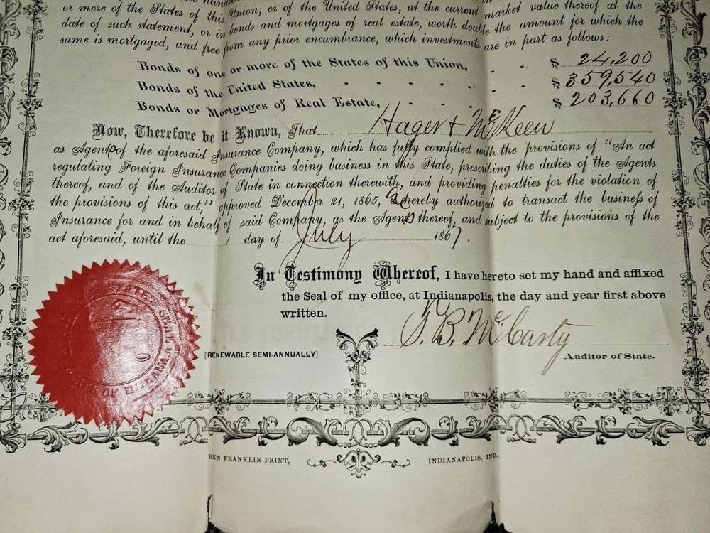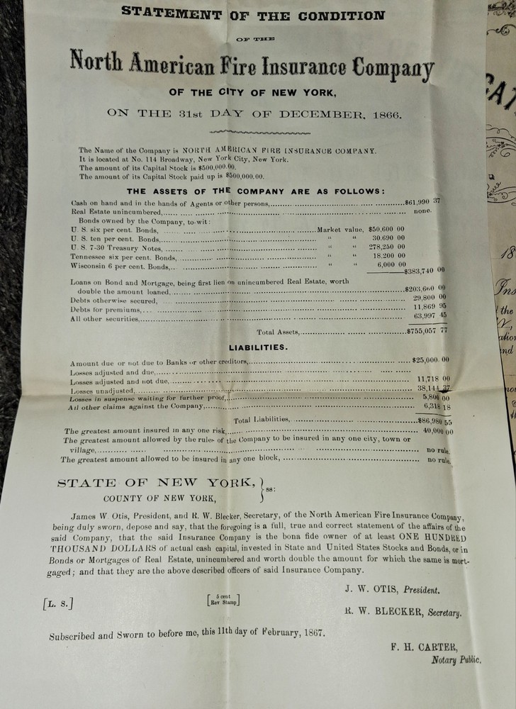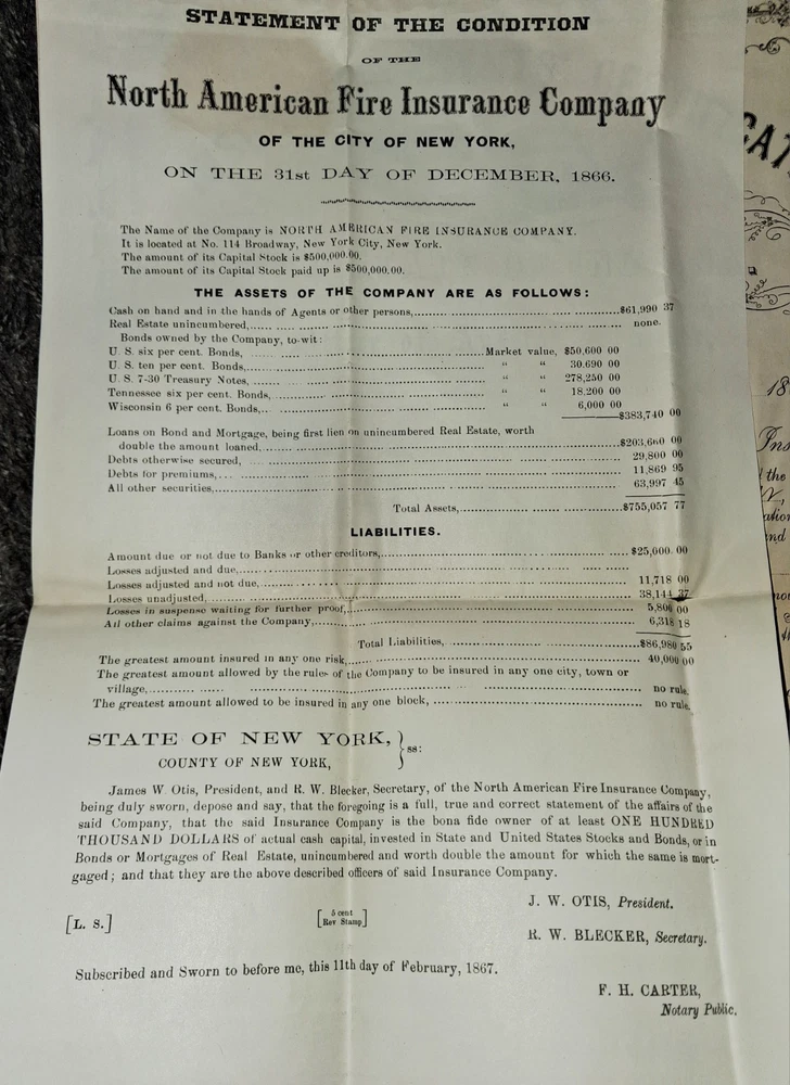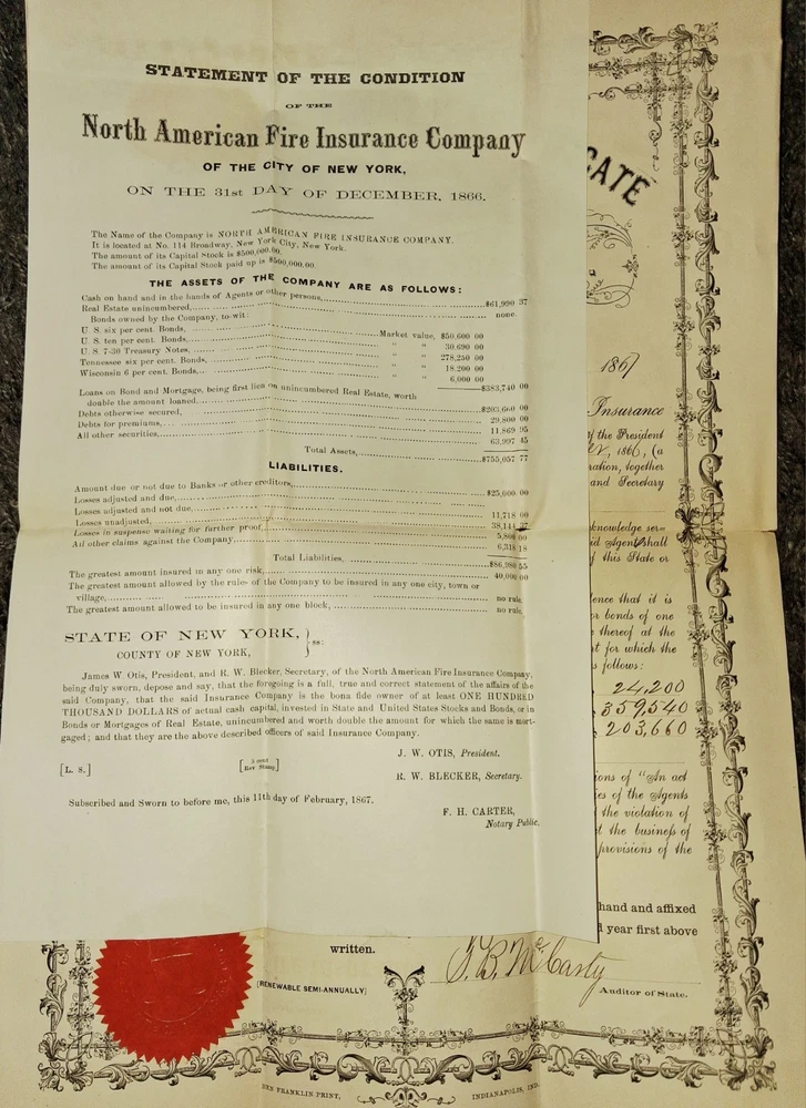 1866 Historical Antique North America Fire Insurance Company Document πŸ”₯