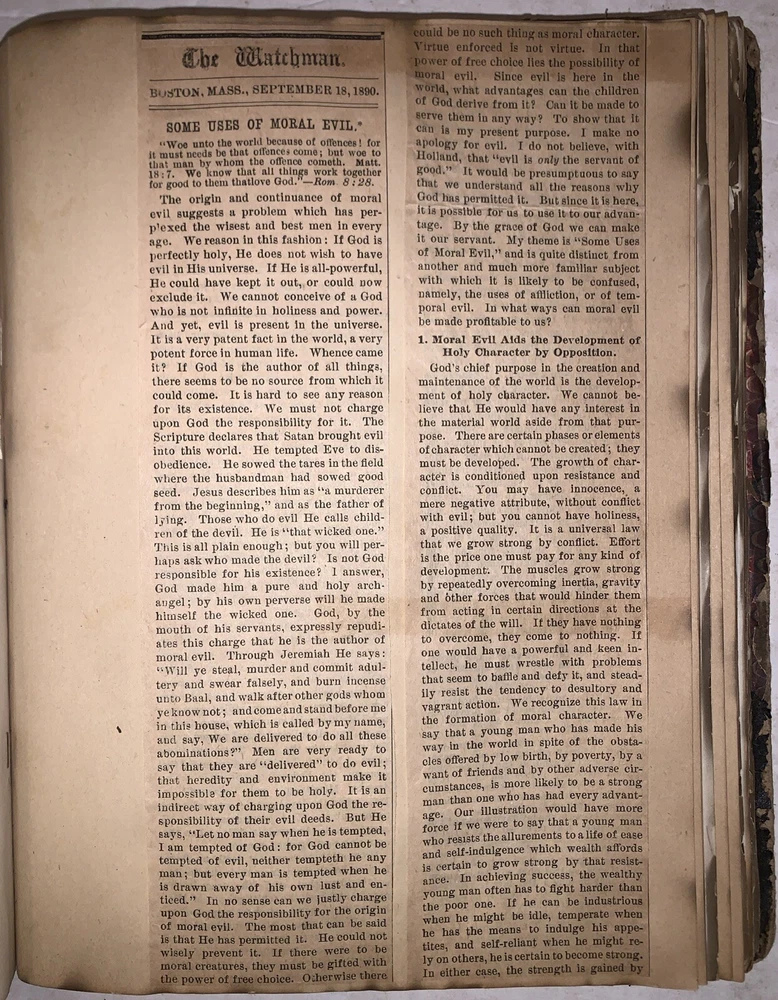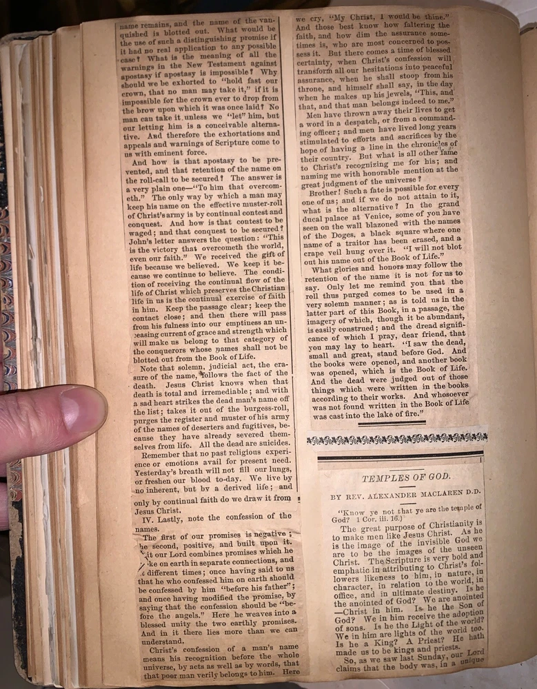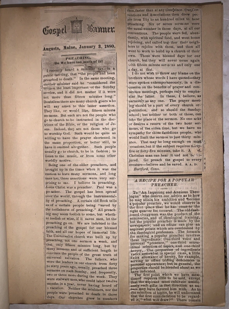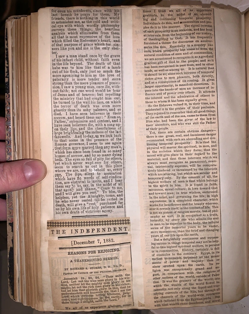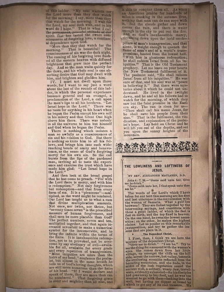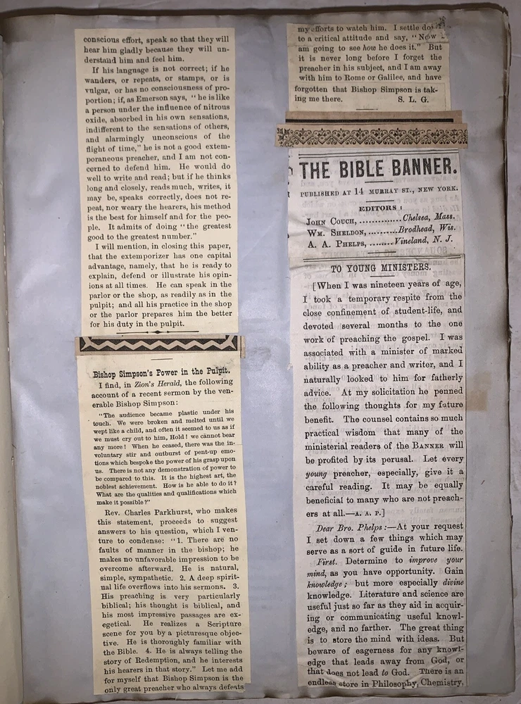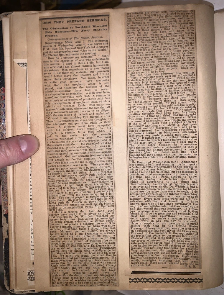 An original scrapbook containing 209 pages of newspaper clippings on preaching and preachers, including several sermons. 1867-1897 Quarto, 209 pages with newspaper clippings bound in leather over marbled boards. Previously part of an institutional collection, with a bookplate and other markings. Some rubbing and wear along edges and corners, scuffs, discoloration and age toning, soiling and discoloration to boards, damage to bottom of spine, else in good + condition. If you have any questions, feel free to ask, and don't forget to check out my other lisitngs.
