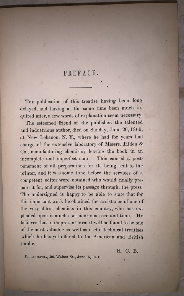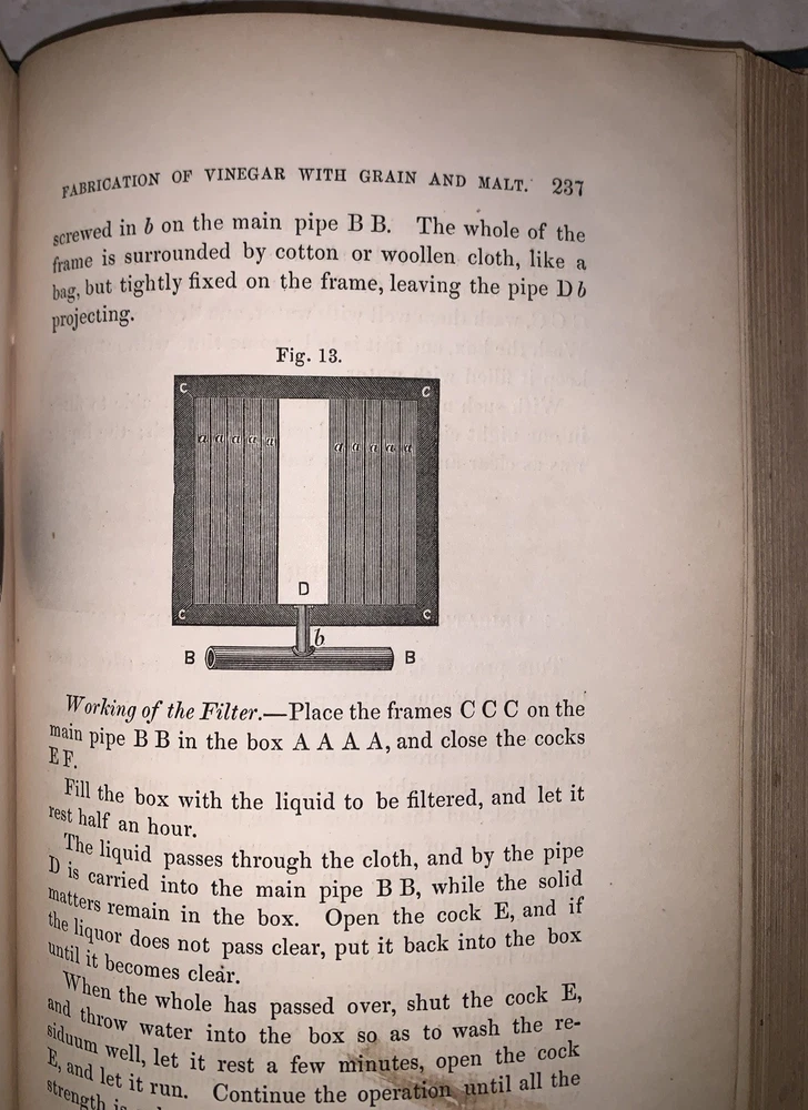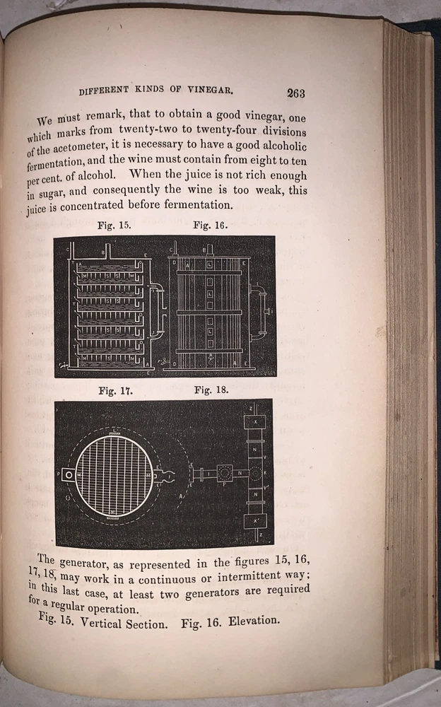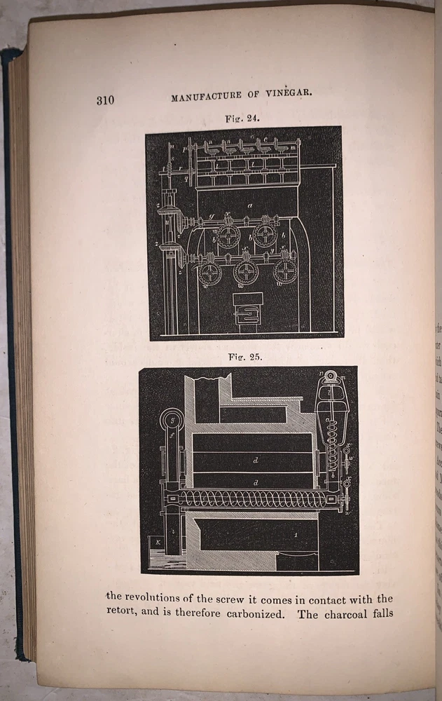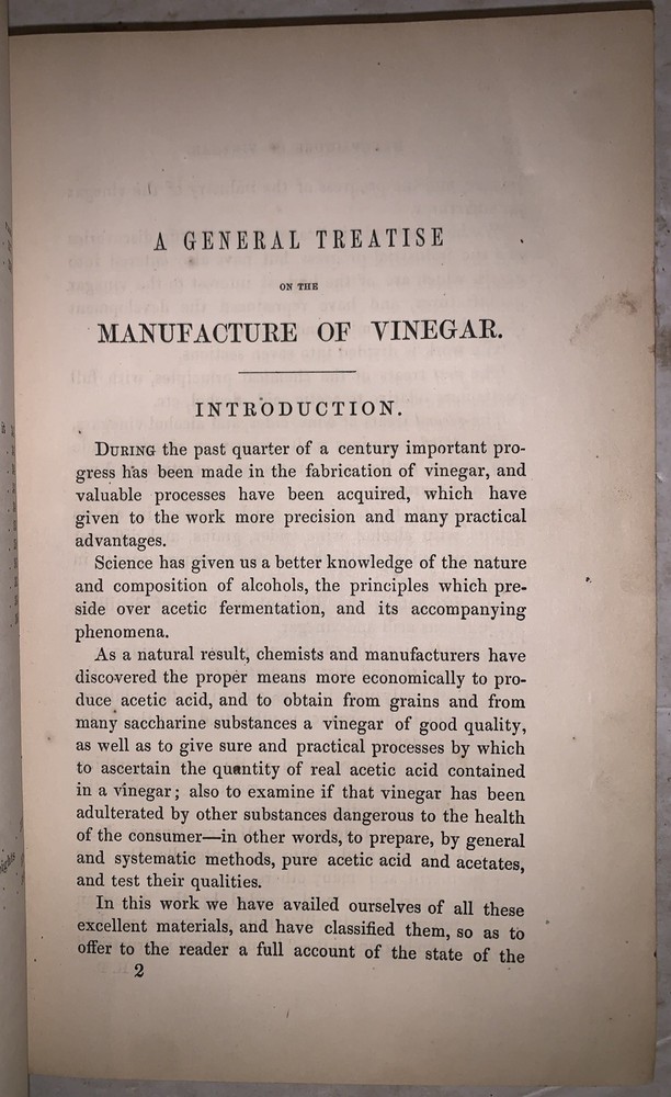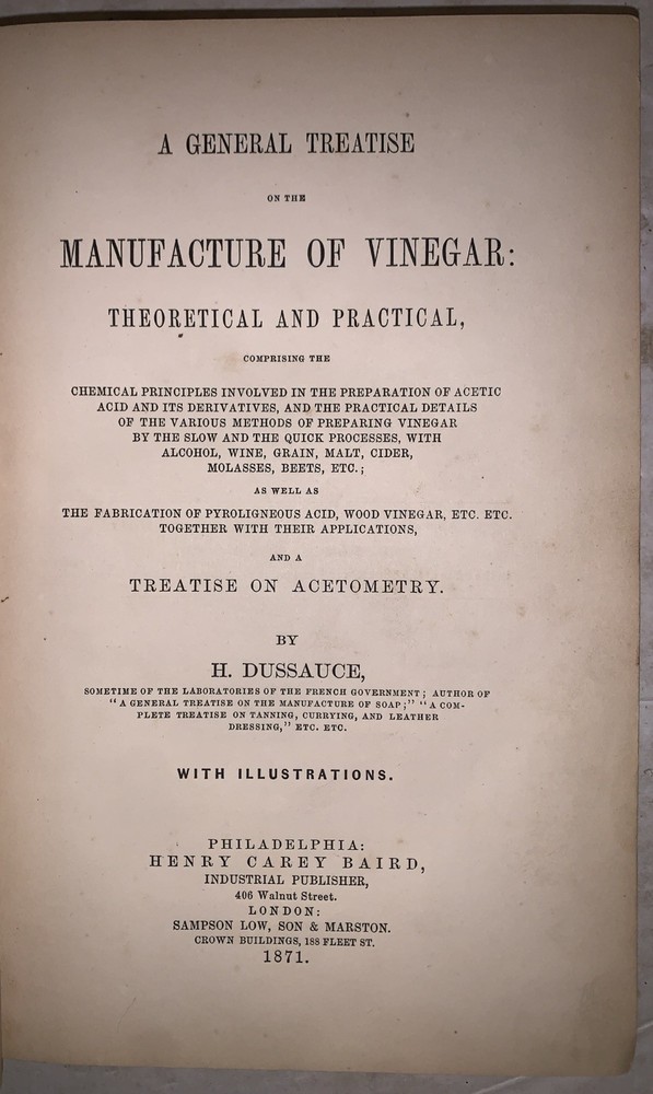 A General Treatise on the Manufacture of Vinegar: Theoretical and Practical, Containing the Chemical Principles Involved in the Preparation of Acetic Acid and Its Derivatives, and the Practical Details of the Various Methods of Preparing Vinegar by the Slow and the Quick Processes, with Alcohol, Wine, Grain, Malt, Cider, Molasses, Beets, Etc.; As Well as the Fabrication of Pyroligneous Acid, Wood Vinegar, Etc. Etc. Together with Their Applications, and a Treatise on Acetometry by H. Dussauce With Illustrations Philadelphia: Henry Carey Baird 1871 First Edition Octavo, 392, 23 pages, publisher's original blind-stamped and gilt-lettered green cloth covered boards. Illustrated in black and white. Hinges cracked, some rubbing and wear, previous owner's inscription, some minor discoloration, else in good + condition. Provenance: From the library of Dr. William Woys Weaver, acclaimed American food historian and author, acquired directly from his historic home, Roughwood, in Chester County, Pennsylvania. If you have any questions, feel free to ask, and don't forget to check out my other listings.