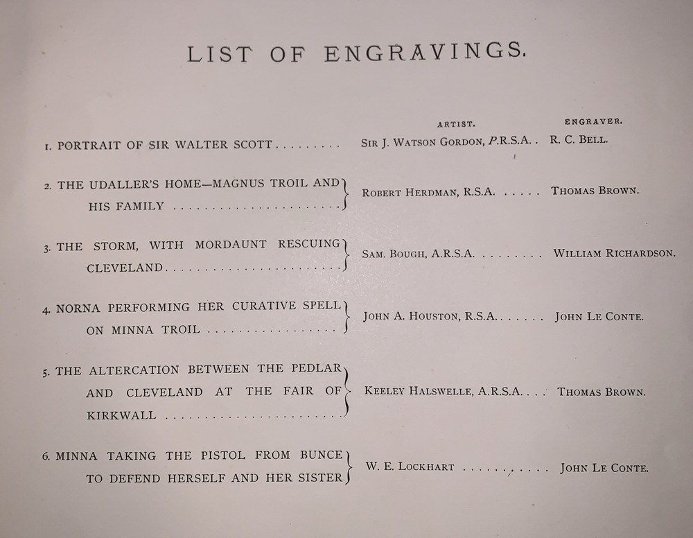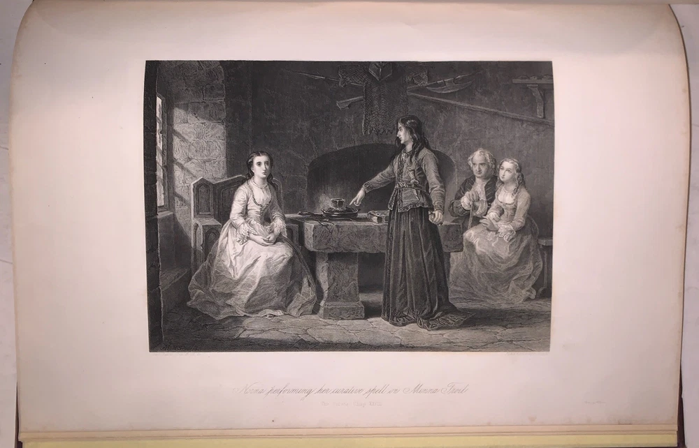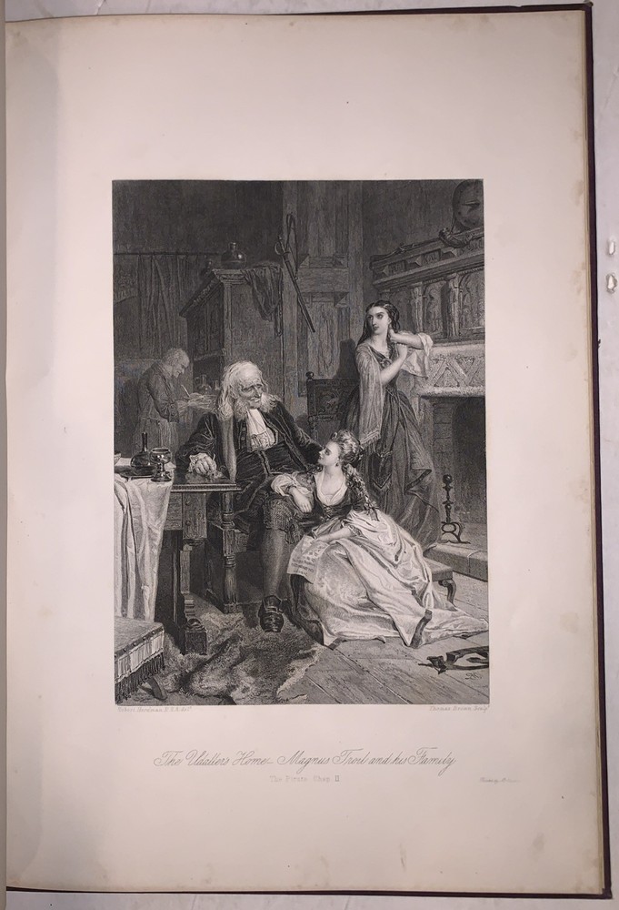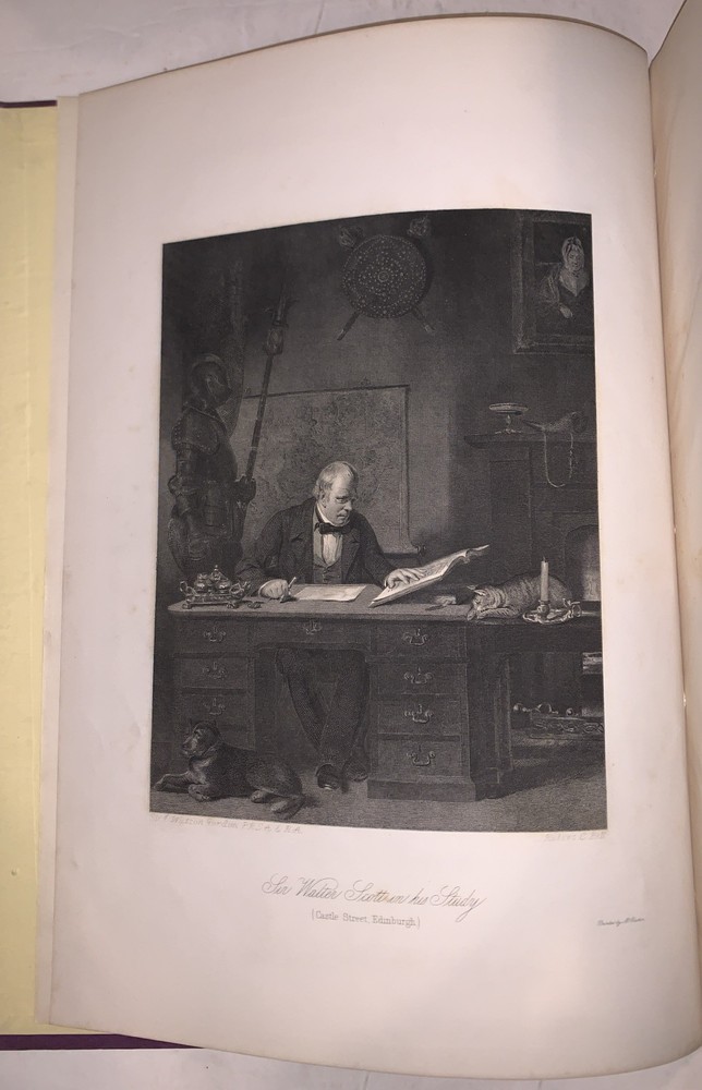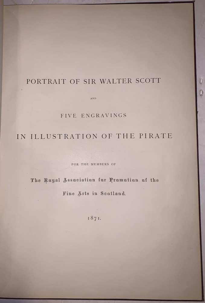 Portrait of Sir Walter Scott and Five Engravings in Illustration of the Pirate [Edinburgh]: For the Members of the Royal Association for Promotion of the Fine Arts in Scotland 1871 First Edition Large slim folio (17" x 2"), chiefly plates, publisher's original gilt lettered and decorated purple cloth covered boards. Illustrated with full page black and white engravings. This volume lacks two of the six engravings, hinges cracked, discoloration to the spine and cloth, some spotted foxing, cigar aroma, else in good condition. If you have any questions, feel free to ask, and don't forget to check out my other listings.