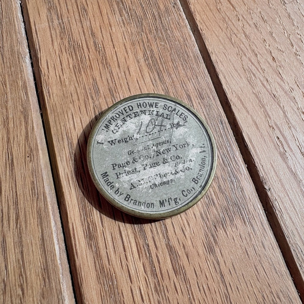 1876 Improved Howe Scales Centennial Shell Card Token — Intact Paper Insert • Type: Shell card token (hollow pressed brass with original paper advertising insert) • Date: 1876 (U.S. Centennial year) • Material: Brass shell; original lithographed paper insert • Size: ~38mm (Trade Dollar size) • Front: Eagle design mimicking U.S. Trade Dollar reverse; legend reads “THE IMPROVED HOWE SCALES / E PLURIBUS UNUM / 1876 TRADE DOLLAR” • Back/Insert: Original paper label reads “IMPROVED HOWE SCALES CENTENNIAL / General Agents: Page & Co. New York / Priest, Page & Co. Boston / A.M. Gilbert & Co. Chicago / Made by Brandon M’f’g. Co., Brandon, Vt.” • Condition: Brass shell VF; paper insert present with light age toning/foxing — remarkably intact for age