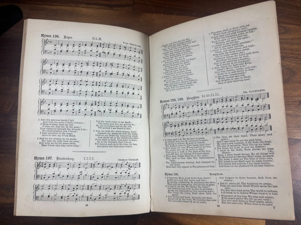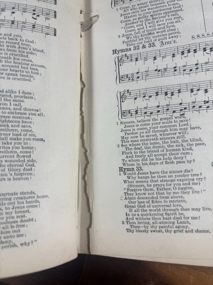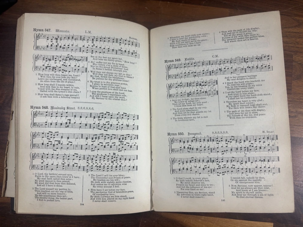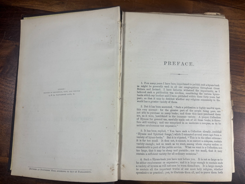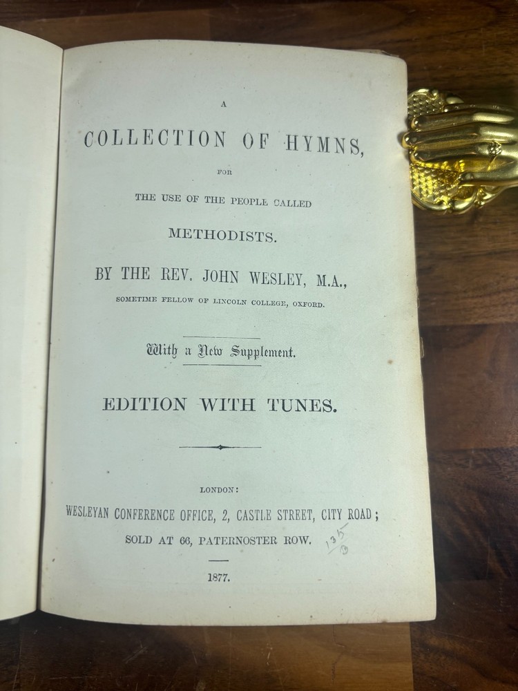Item Description Title: A Collection of Hymns, for the Use of the People Called Methodists Author: Rev. John Wesley, M.A. Edition: With a New Supplement – Edition with Tunes Publisher: Wesleyan Conference Office, London Year: 1877 Binding: Original black cloth with gilt spine lettering Printed in: England This is an authentic 19th-century Wesleyan Methodist hymnal , complete with musical notation , published in 1877. It is a well-used but complete copy, showing honest age and wear consistent with church or devotional use. Historical Background of the Book This hymnal is part of the official Methodist tradition established in the 18th century and carried forward into the Victorian era. The original Collection of Hymns was first issued in 1780 and became one of the most influential hymn books in Protestant Christianity. The “Edition with Tunes” reflects an important development in Methodist worship: the inclusion of printed musical settings rather than lyrics alone. By the late 19th century, congregational singing had become central to Methodist identity, and this format helped standardize worship across chapels in Britain and abroad. This 1877 edition represents the mature form of Wesleyan hymnody during the height of Methodism’s influence in Victorian England. About John Wesley (1703–1791) John Wesley was the founder of the Methodist movement and one of the most significant figures in Christian history. An Anglican priest and Oxford scholar, Wesley emphasized: Personal faith and spiritual discipline Social reform and charity Congregational singing as a means of teaching theology Although many hymns were written by his brother Charles Wesley , John Wesley carefully edited and compiled hymn collections, believing hymns were essential tools for spreading doctrine and devotion. His hymnals shaped Protestant worship worldwide and remain influential today. Physical Description & Condition Original black cloth binding with gilt title on spine “WESLEY’S HYMNS” Pages include both lyrics and musical notation Typical wear for age: Edge wear and scuffing to covers Spine and inner hinges show cracking Some page gutter tears and age toning Complete and intact (1 page is almost loose) Please review all photos carefully. Why This Book Is Special Genuine 19th-century Methodist hymnal Includes printed musical scores Published during the Victorian era Important artefact of English religious and musical history Ideal for collectors of: Antique religious books Methodist or church history Hymnals and sacred music Dimensions: Weight - 611g Height - 19.7cm Width - 14.3cm Thickness - 3cm