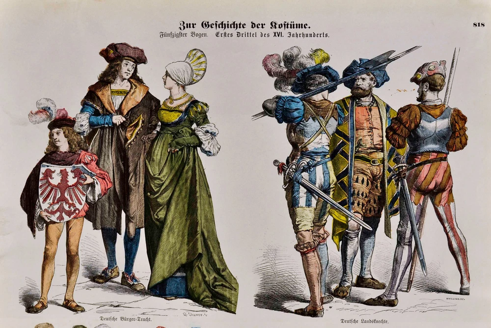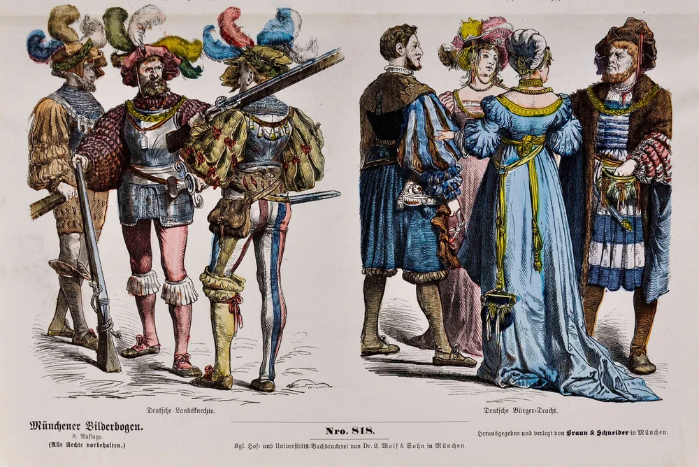 1880 Costume Print 16th c. German Citizens Mercenary Soldiers Muskets Swords