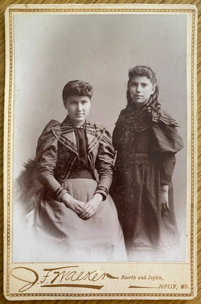 Two sisters Myrtle & Cade Antique cabinet card photograph 1880s Photo taken by J.F. Walker of Joplin, Missouri Size of photo is 4.25"x 6.5" inches Visit our store for 2,000+ items – Thank You!