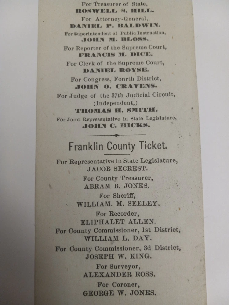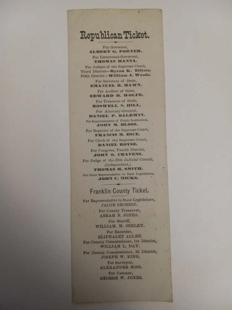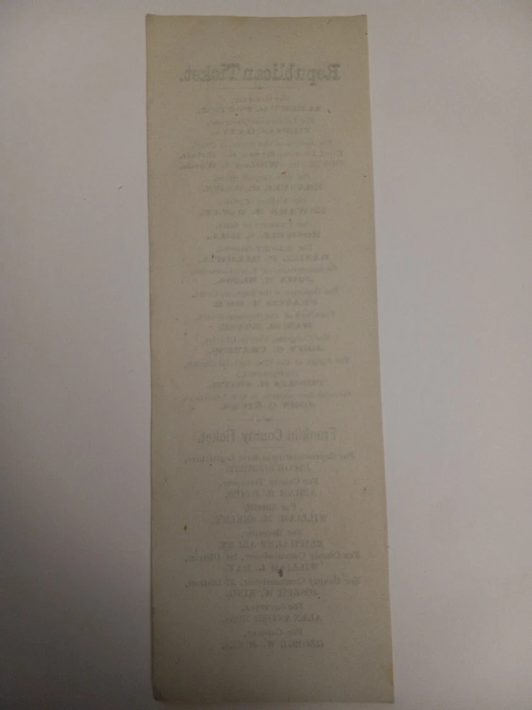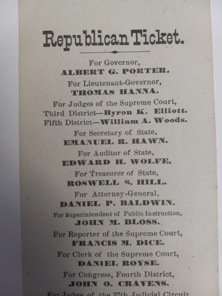 This is a rare and valuable 1881 Franklin County, Indiana Republican Ticket. It features the name of Albert G. Porter a prominent politician in the Republican Party who was later elected the governor of Indiana. The ticket is made of high-quality paper and has been very well-preserved, making it an excellent addition to any collection of political memorabilia. The ticket holds immense historical significance. It represents the political climate of the United States during the late 19th century and is a testament to the strength of the Republican Party. This item is a must-have for any serious collector or history enthusiast. Check out my other listings!