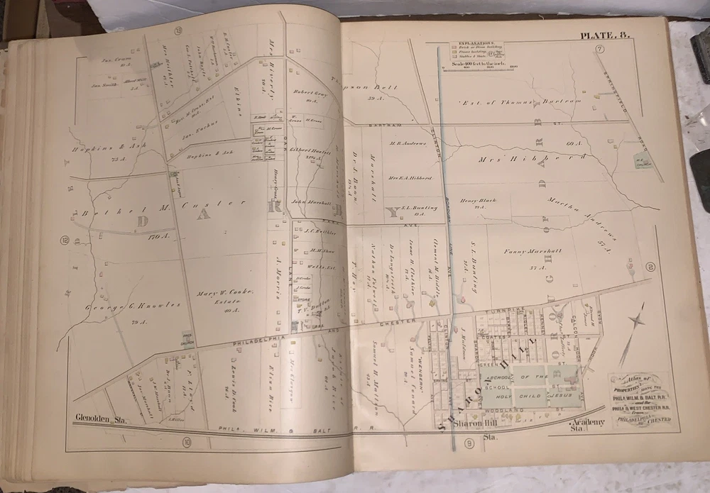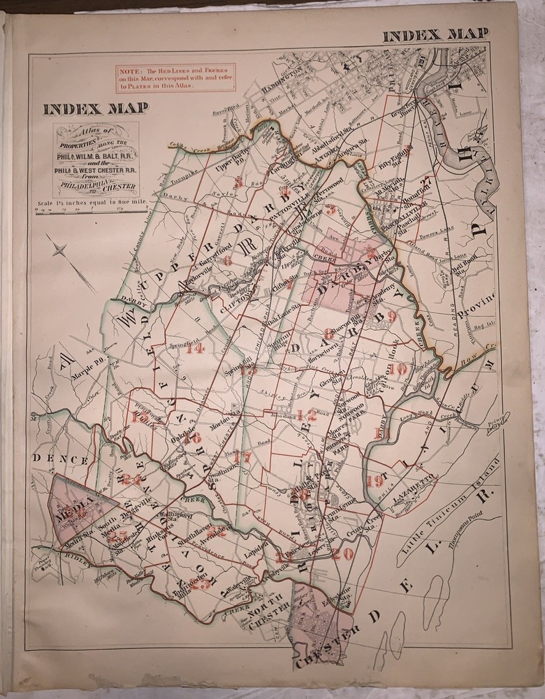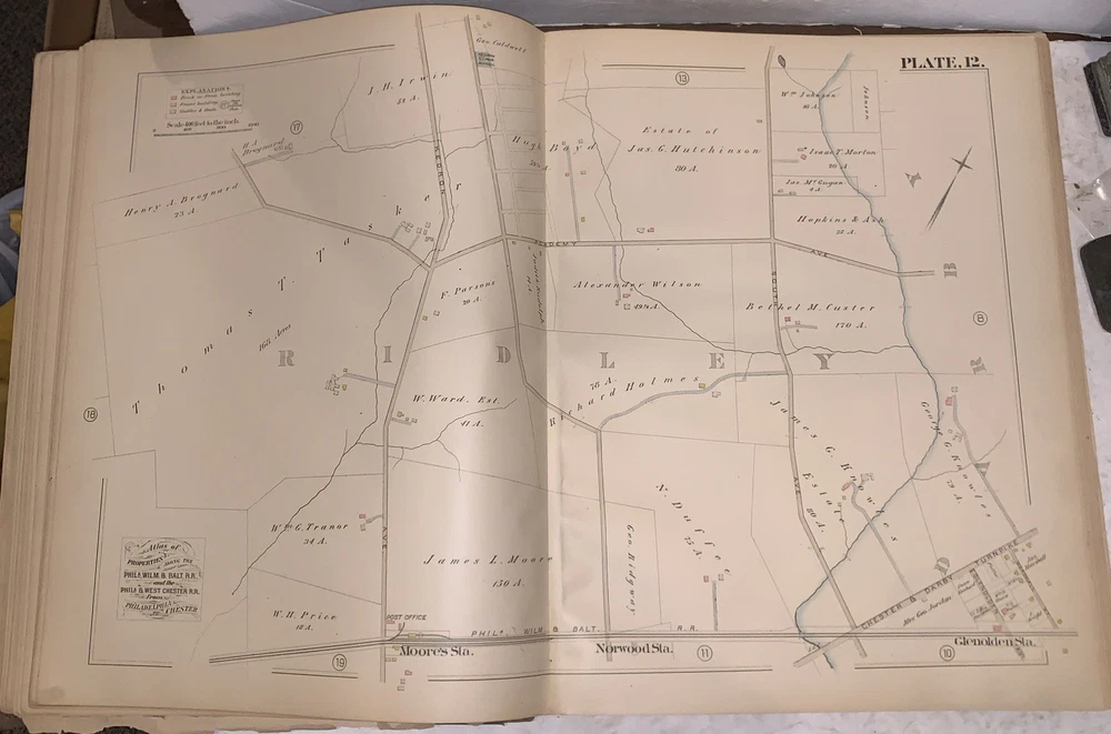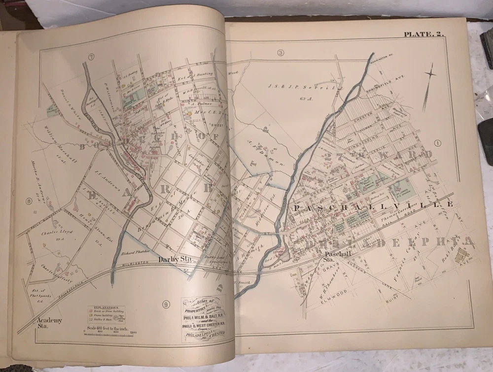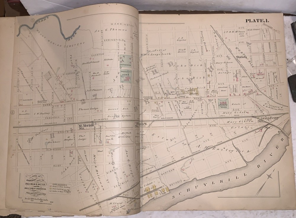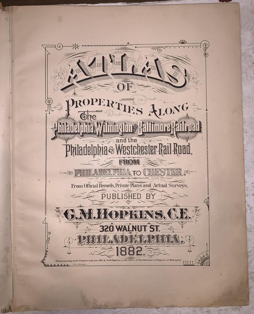 Atlas of Properties Along the Philadelphia, Wilmington, and Baltimore Railroad and the Philadelphia & Westchester Rail Road, from Philadelphia to Chester From Official Records, Private Plans, and Actual Surveys Philadelphia: G. M. Hopkins, C.E. 1882 First Edition Atlas folio (18.75" x 14.75"), illustrated with all 28 hand-colored maps, one of which is a large fold out. Publisher's original gilt lettered grey cloth covered board. Top board detached, final map and free endpapers detached, lacks rear board, some discoloration and soiling, a few tears along the edges, rubbing and wear, else in good condition. A scarce and important regional atlas documenting railroad expansion and land ownership in late 19th-century southeastern Pennsylvania. If you have any questions, feel free to ask, and don't forget to check out my other listings.