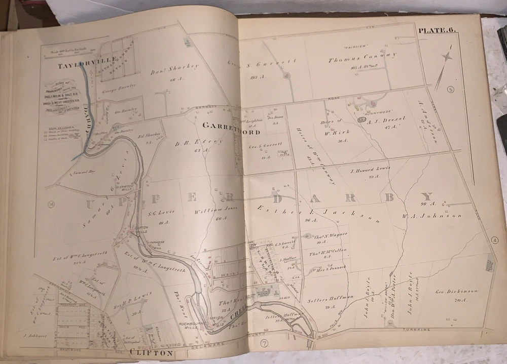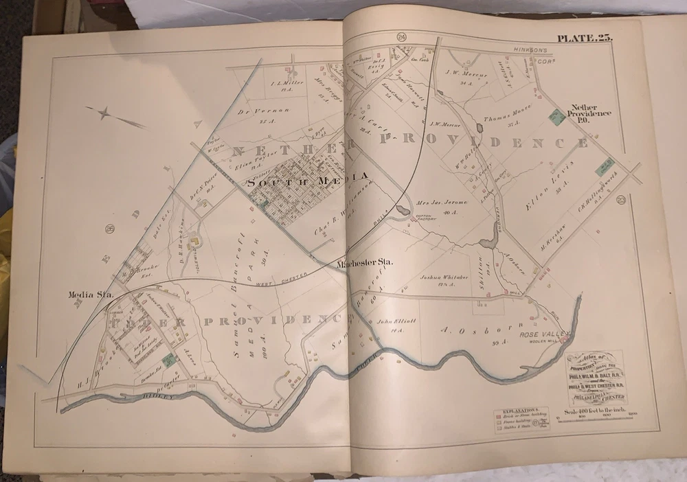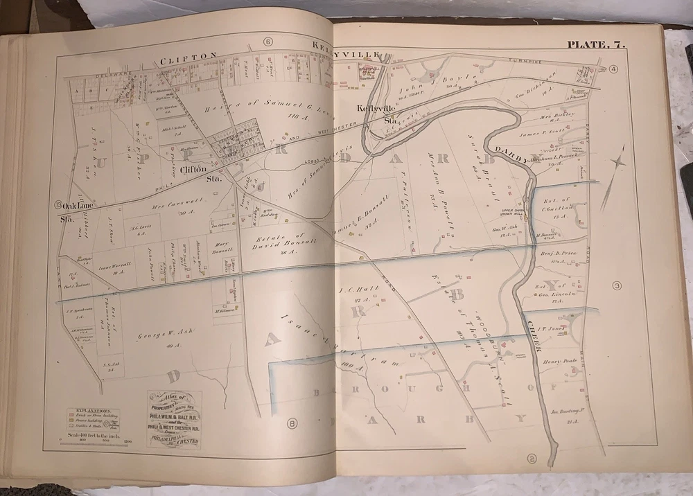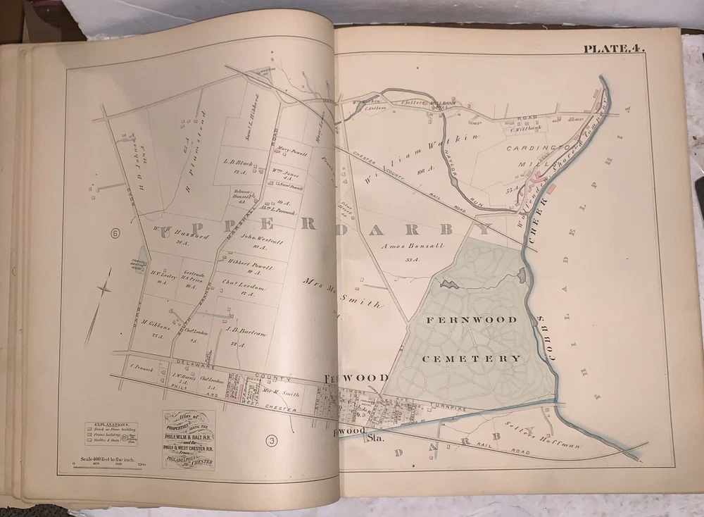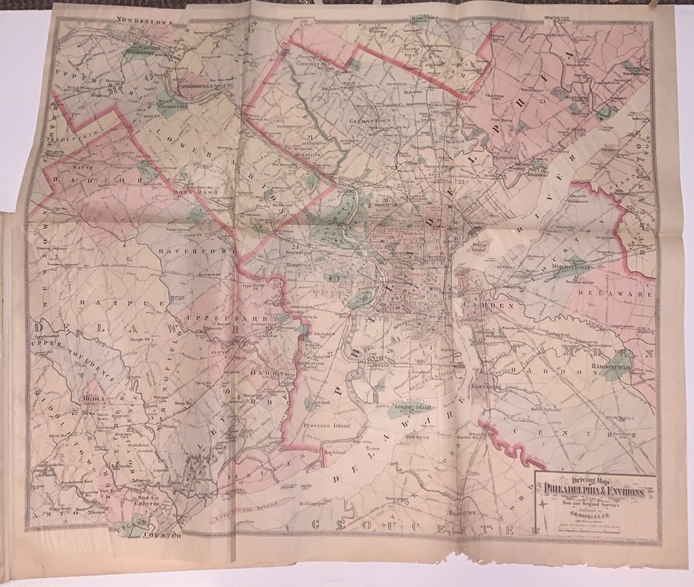Atlas of Properties Along the Philadelphia, Wilmington, and Baltimore Railroad and the Philadelphia & Westchester Rail Road, from Philadelphia to Chester From Official Records, Private Plans, and Actual Surveys Philadelphia: G. M. Hopkins, C.E. 1882 First Edition Atlas folio (18.75" x 14.75"), illustrated with all 28 hand-colored maps, one of which is a large fold out. Publisher's original gilt lettered grey cloth covered board. Top board detached, final map and free endpapers detached, lacks rear board, some discoloration and soiling, a few tears along the edges, rubbing and wear, else in good condition. A scarce and important regional atlas documenting railroad expansion and land ownership in late 19th-century southeastern Pennsylvania. If you have any questions, feel free to ask, and don't forget to check out my other listings.