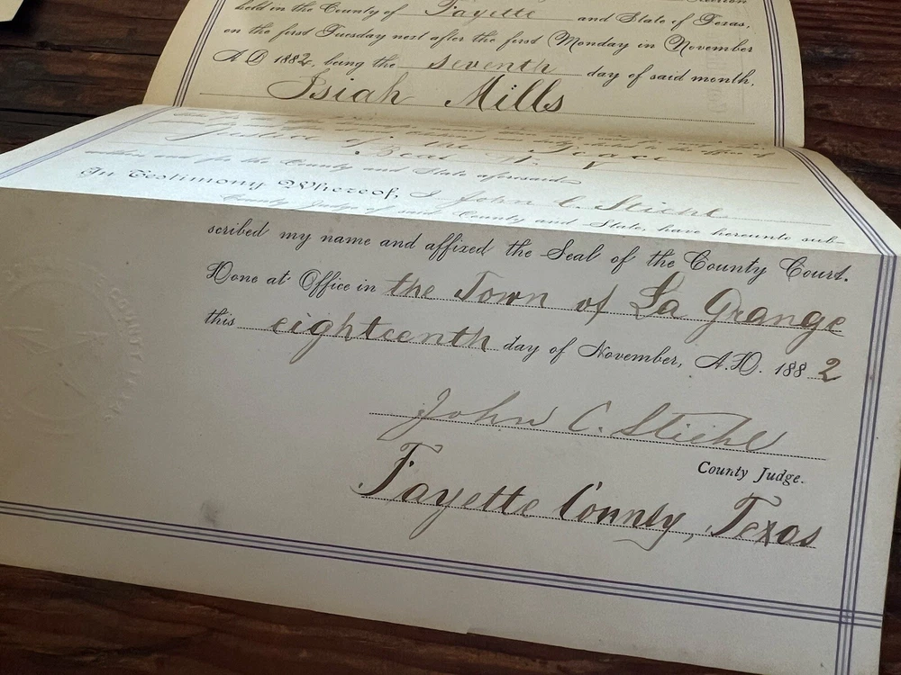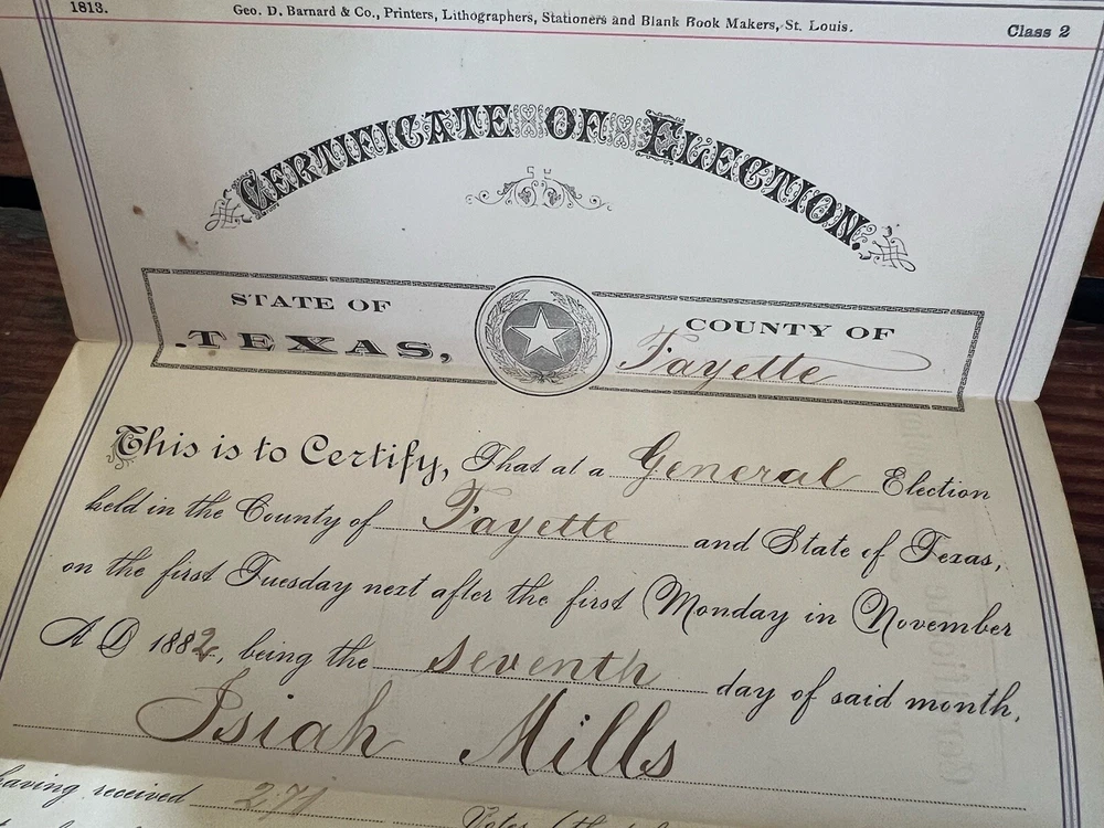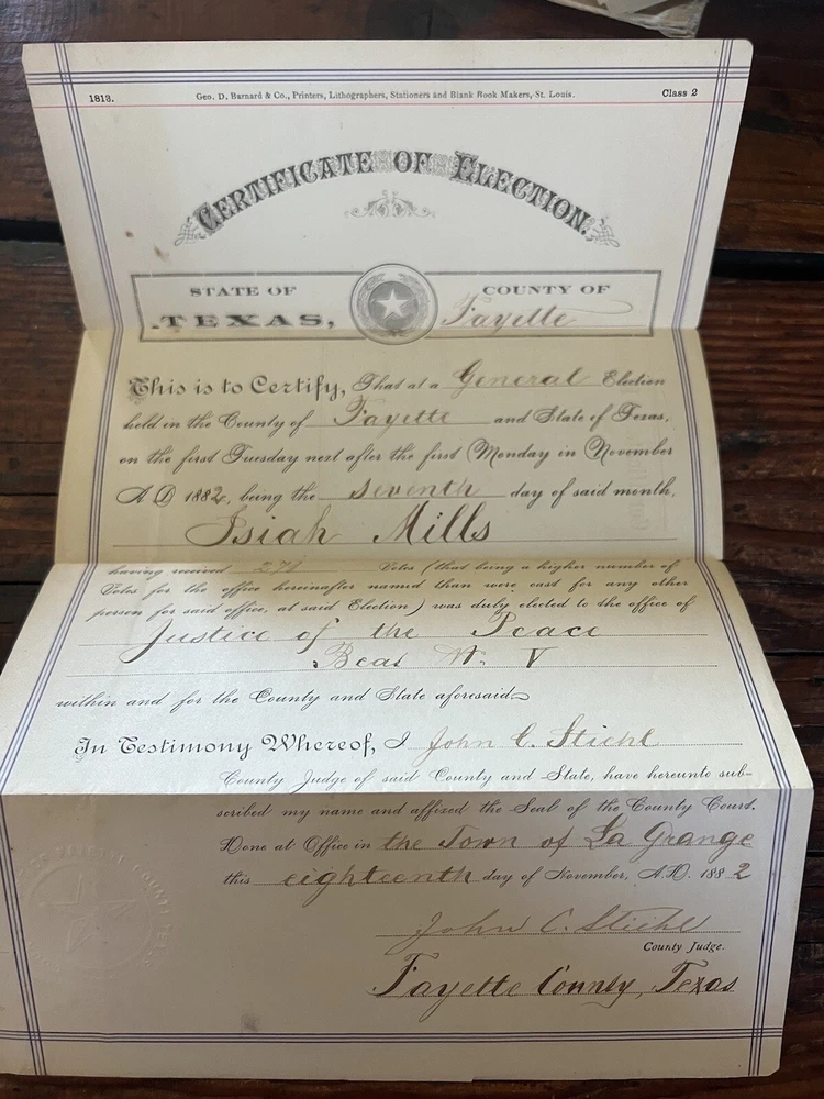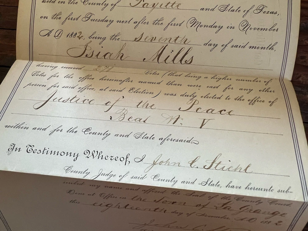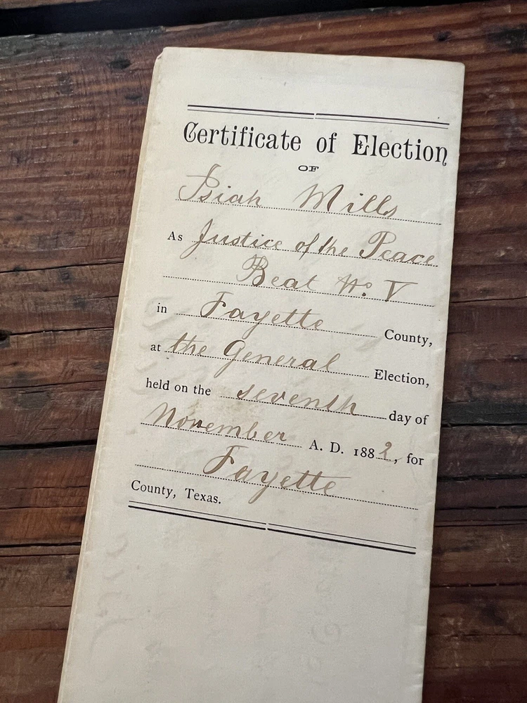 1882 Certificate of Election Justice of the Peace Fayette County Texas