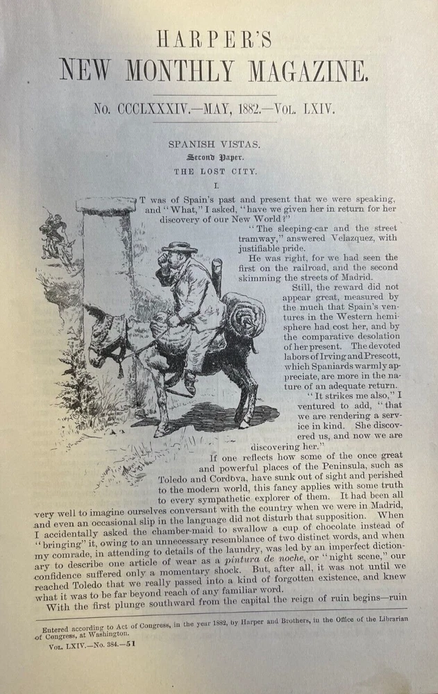 Vintage illustration removed from a magazine published in 1882. Contains 21 pages including 22 illustrations. Page size approximately 6 inches x 9 inches. Would be great for addition to any vintage print collection. SKU # 18582 Nice article overall. Has some browning, age toning, and dinged corners, but overall very nice for a 100-year-old magazine article.