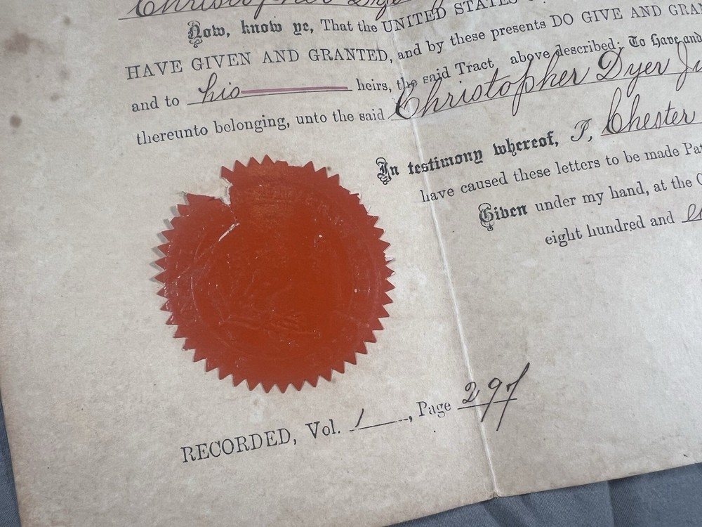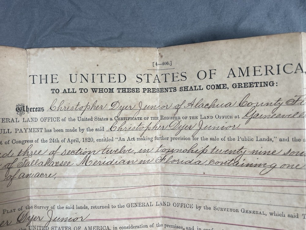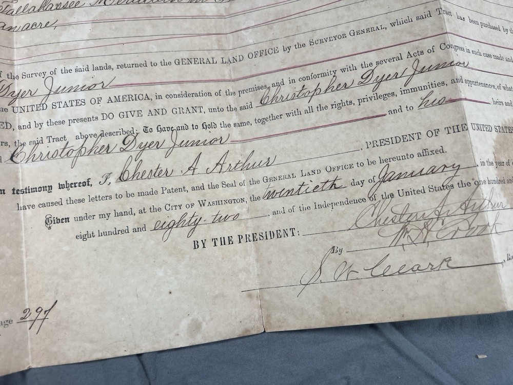 Original United States Land Patent issued in 1882 and signed during the presidency of Chester A. Arthur, granting public land in Alachua County, Florida to Christopher Dyer Jr. This patent was issued by the General Land Office and retains its original red embossed seal. The document conveys legal title to public land under federal authority and includes full land description and official signatures. Details: • President: Chester A. Arthur • Date: January 20, 1882 • Location: Alachua County, Florida • Original seal present • Authentic, not a reproduction Condition: Original folds, age toning, and light foxing consistent with age. No major damage. Seal intact. See photos. A strong piece for collectors of presidential documents, Florida history, land patents, or genealogy.