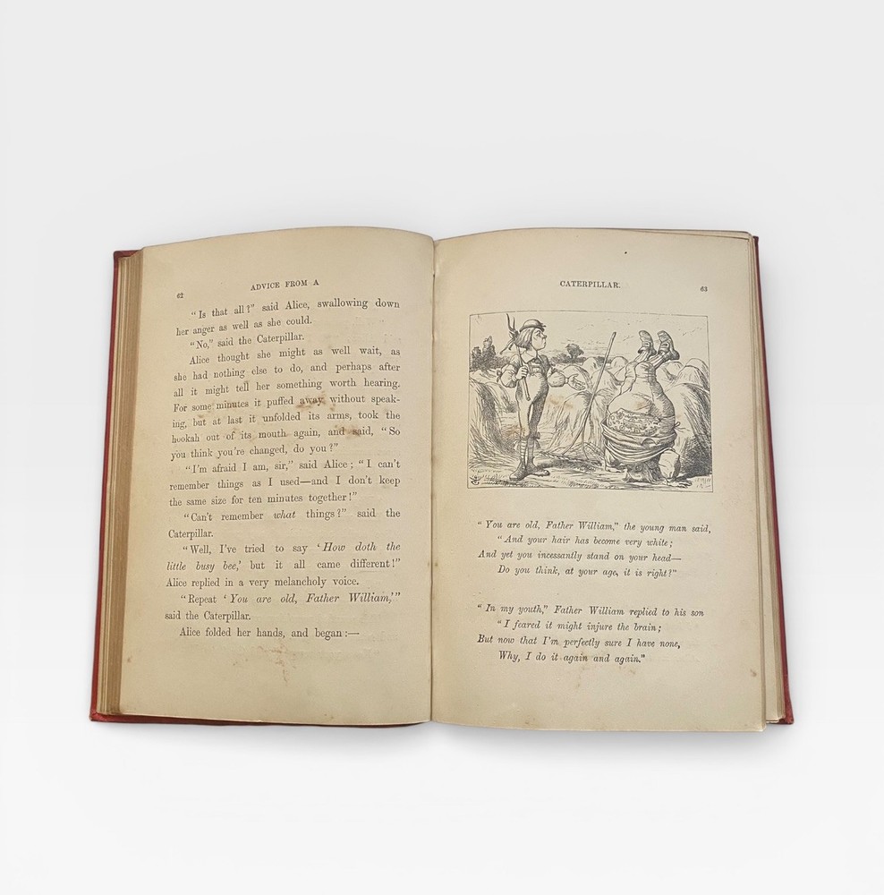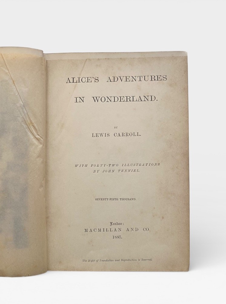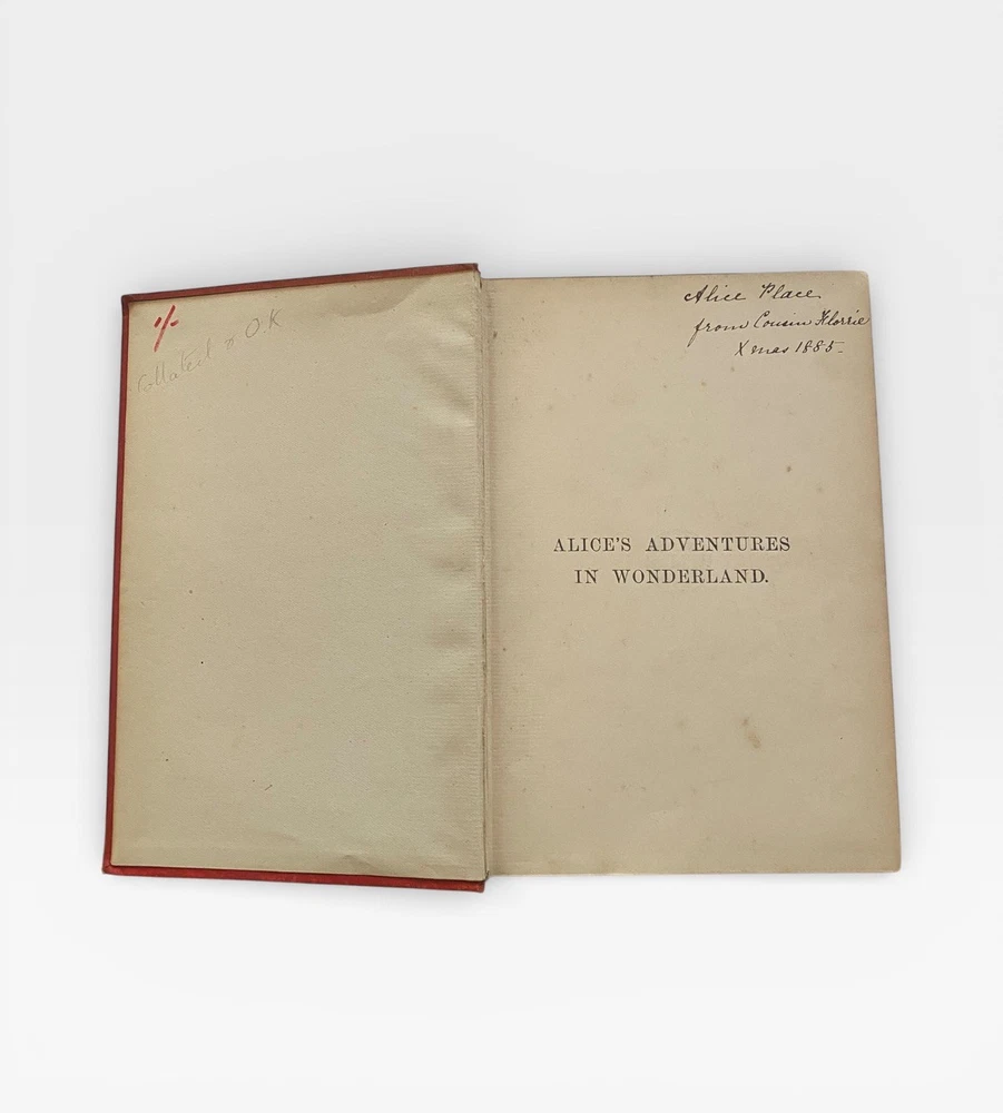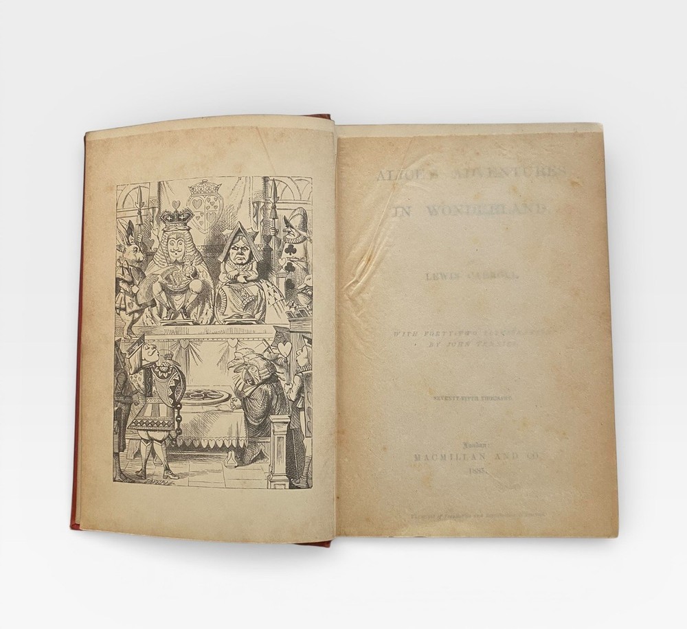 Offered for sale is an original 1885 copy of “Alice’s Adventures in Wonderland” by Lewis Carroll, published by Macmillan and Co., London, with the classic 42 illustrations by John Tenniel. This example is the “Seventy-Fifth Thousand” edition, printed in 1885. 📚 Details: • Publisher: Macmillan and Co., London • Year: 1885 • Edition: Seventy-Fifth Thousand • With 42 illustrations by John Tenniel • Original red cloth binding with gilt decoration • Gilt lettering to spine 📖 Condition: • Original publisher’s red cloth boards • Wear to edges and corners • Some rubbing and fading to spine • Front and rear inner hinges show age-related wear • Light foxing and age toning to pages • Gilt page edges • Structurally sound and complete A genuine late 19th-century example of one of the most iconic works of English literature. A highly collectible Victorian edition in original binding. Ideal for collectors of Lewis Carroll, illustrated classics, and 19th-century literature.